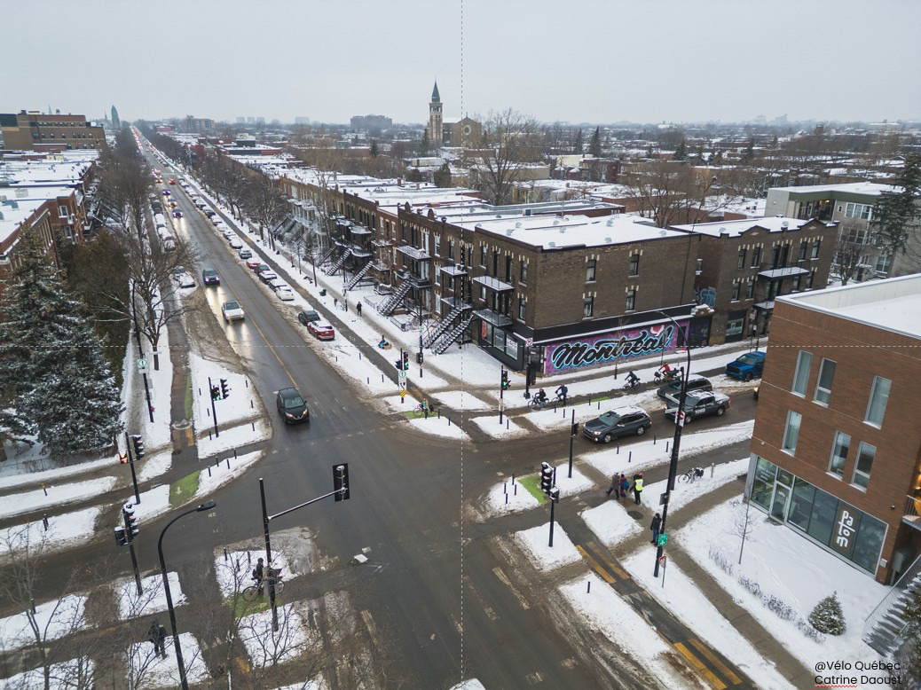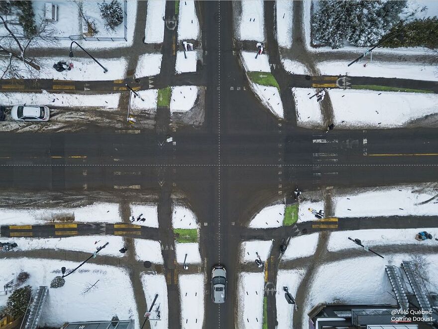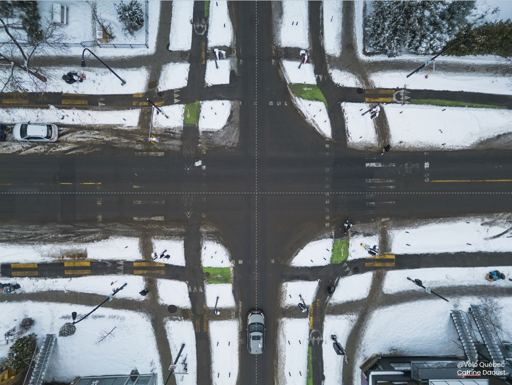 The Christophe-Colomb and Bellechasse protected intersection under the snow (@velo.qc.ca).