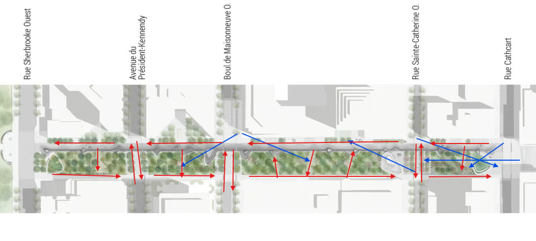 En rouge les déplacements de l’aménagement et en bleu, ceux qui auraient pu être mieux réfléchis (accès vers l’anneau, accès vers Ste-Catherine, sortie du REM plus directe vers McGill, accès plus direct au 1501 McGill