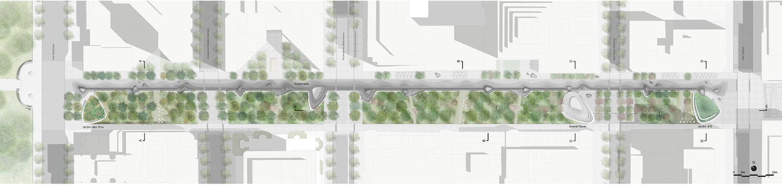 Je suis aussi inquiet du voilage de la montagne en raison d’une canopée exagérée, j’aurais préconisé de plus vastes zones pavées ou de végétation moins haute, voire même des zones de “couvre-sol” permettant une aire “pique-nique” au sol. Certains axes diagonaux pourraient être pertinents, mais ça ne m’apparaît pas être un défaut majeur de l’aménagement proposé. En fait, la hauteur de la canopée est le seul véritable enjeu par rapport à ce qu’on voit en ce moment. L’état actuel de l’artère m’amène à conclure que cette idée de devoir multiplier les sentiers et les axes et les trajets n’est pas nécessaire à ce point. Un peu, mais pas de là à dire qu’on a devant nous un projet problématique.