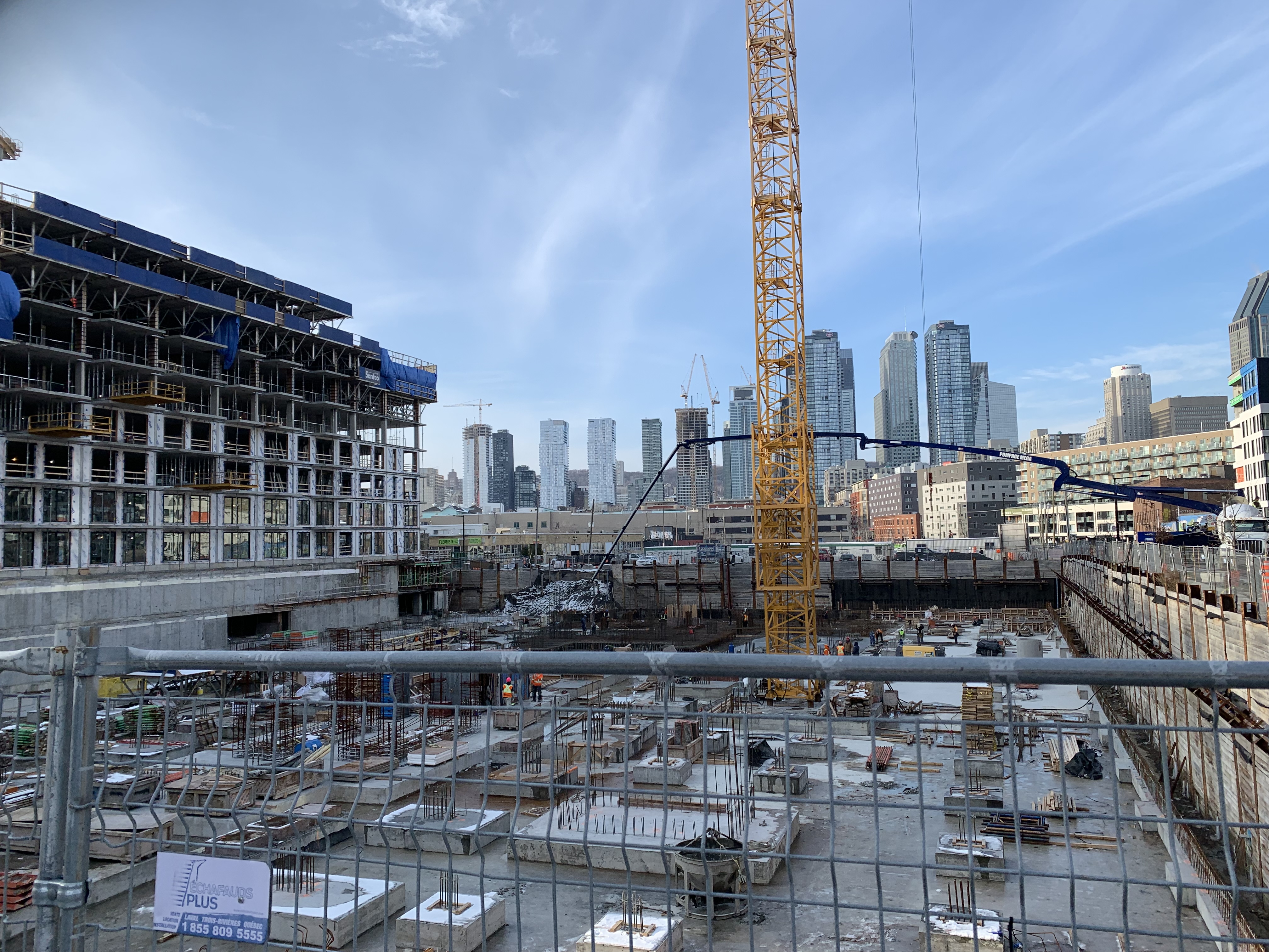 Avec la hauteur presente de la grue Bass 5, on dirais qu’elle est a peine assez haute pour faire le 20 étages. Si on compare avec la grue Bass 4 (projet qui fait 8 étages), on voit a peu près que cette grue fait environ “14 étages” de haut (donc un “clearance de 6 étages” par rapport au 8 étages).