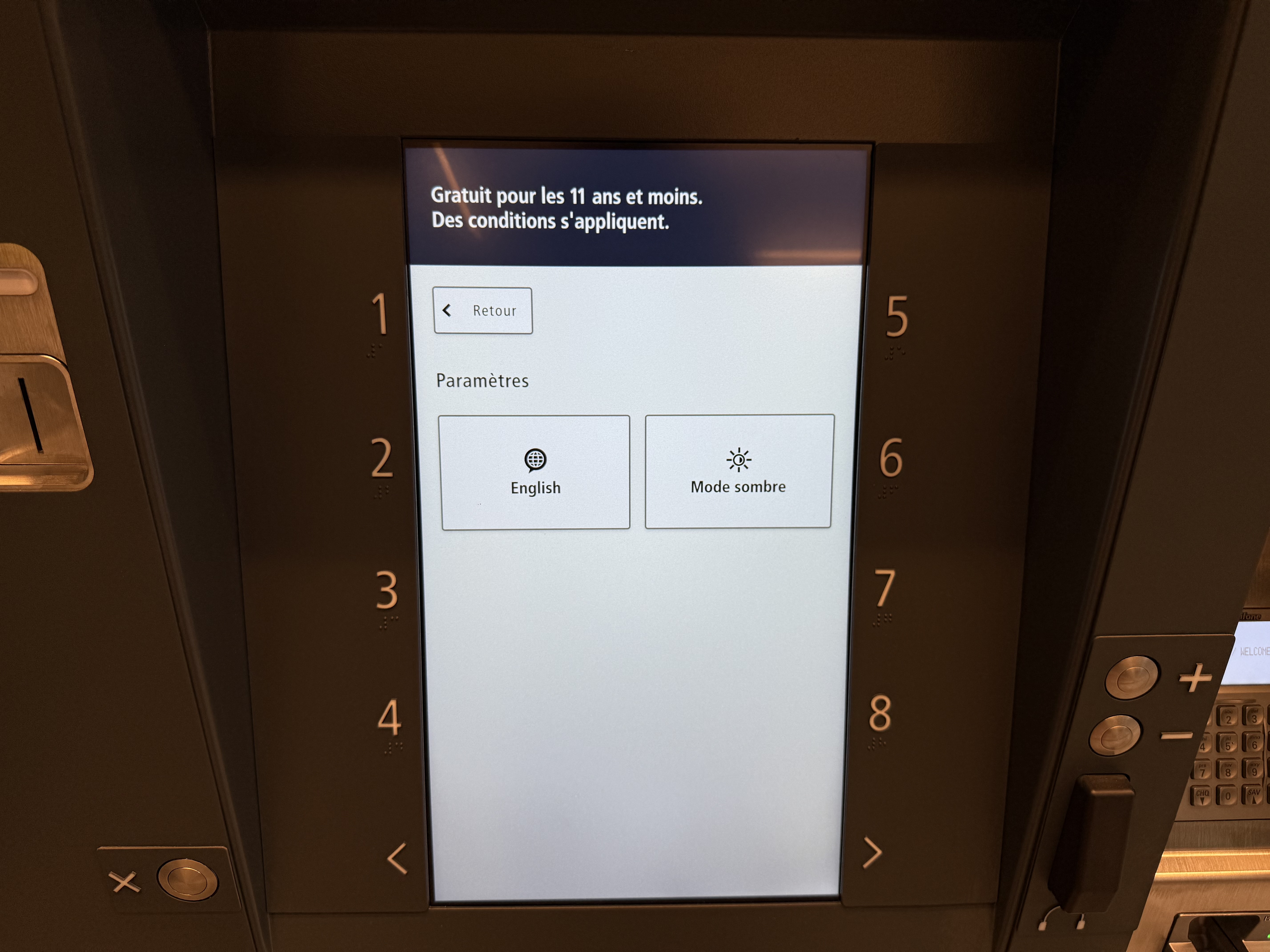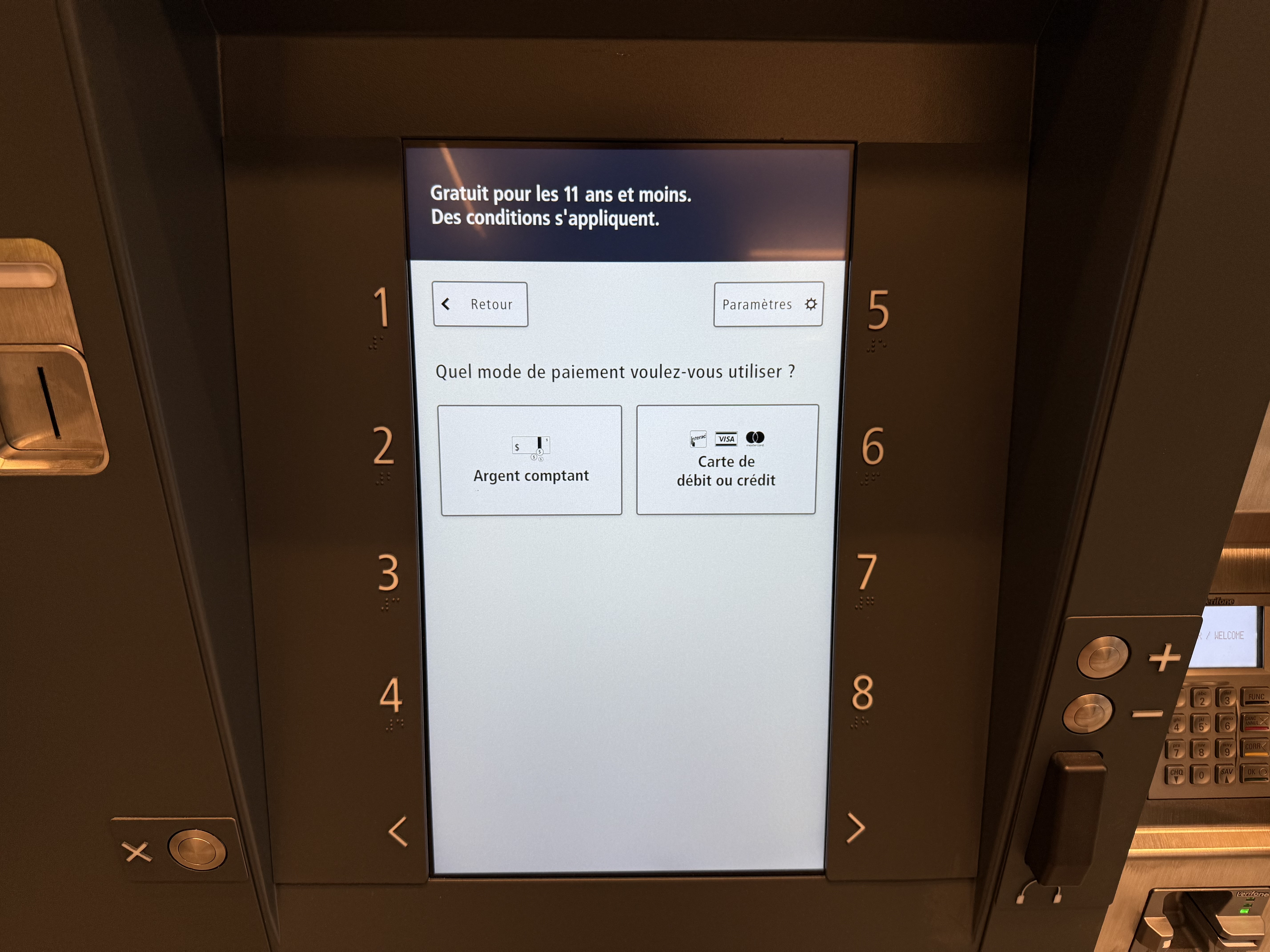 Pour finir, deux petits détails. À gauche, la DAT de nouvelle génération peut également remettre le change en billets. Et en haut à droite, elle a une lumière d’état (blanc = en service, rouge = hors service, à vérifier mais orange = en maintenance)