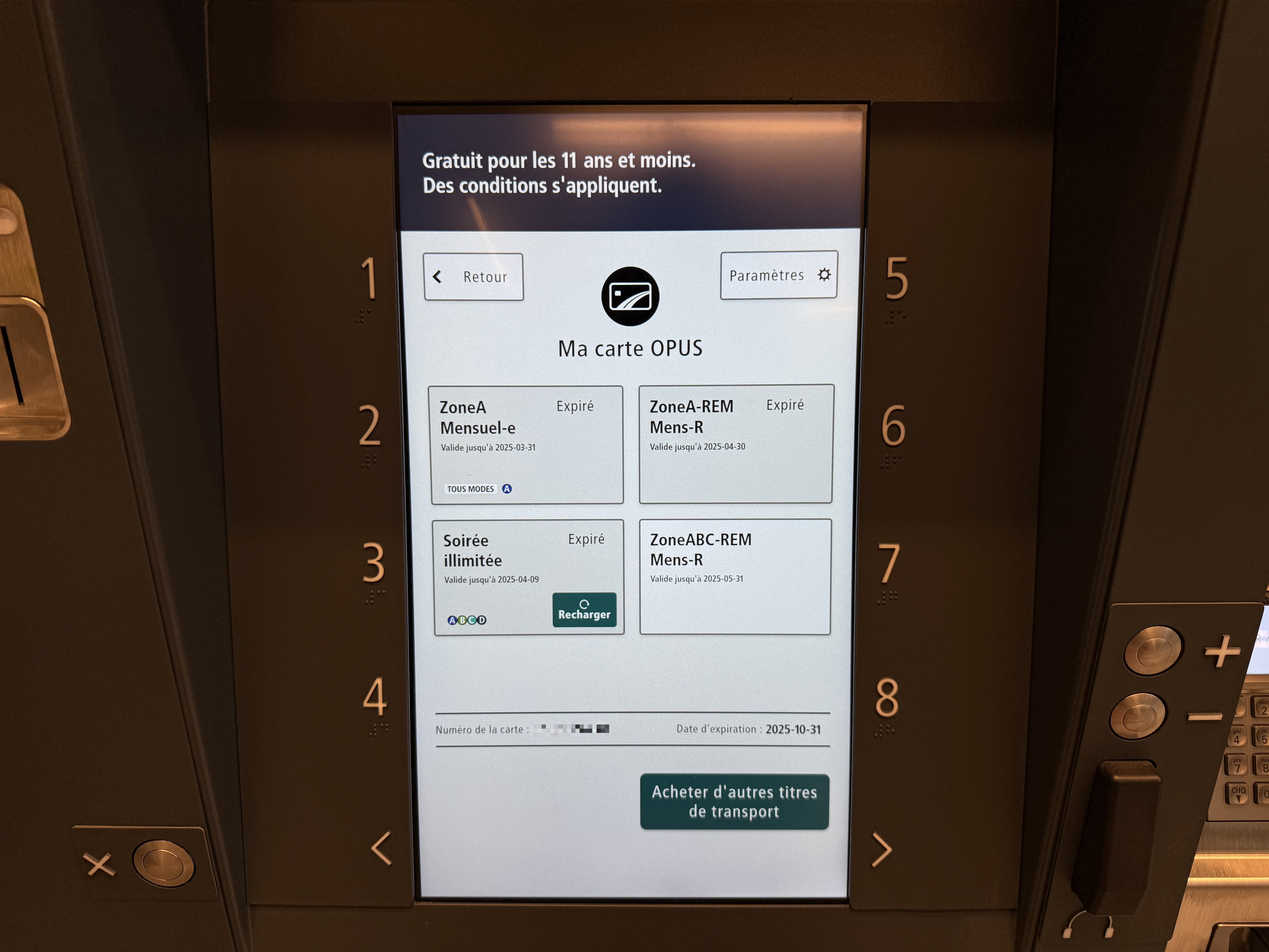 Lorsque la carte OPUS est insérée dans le socle, on peut consulter les titres qu’elle contient, ainsi que son numéro et sa date d’expiration.