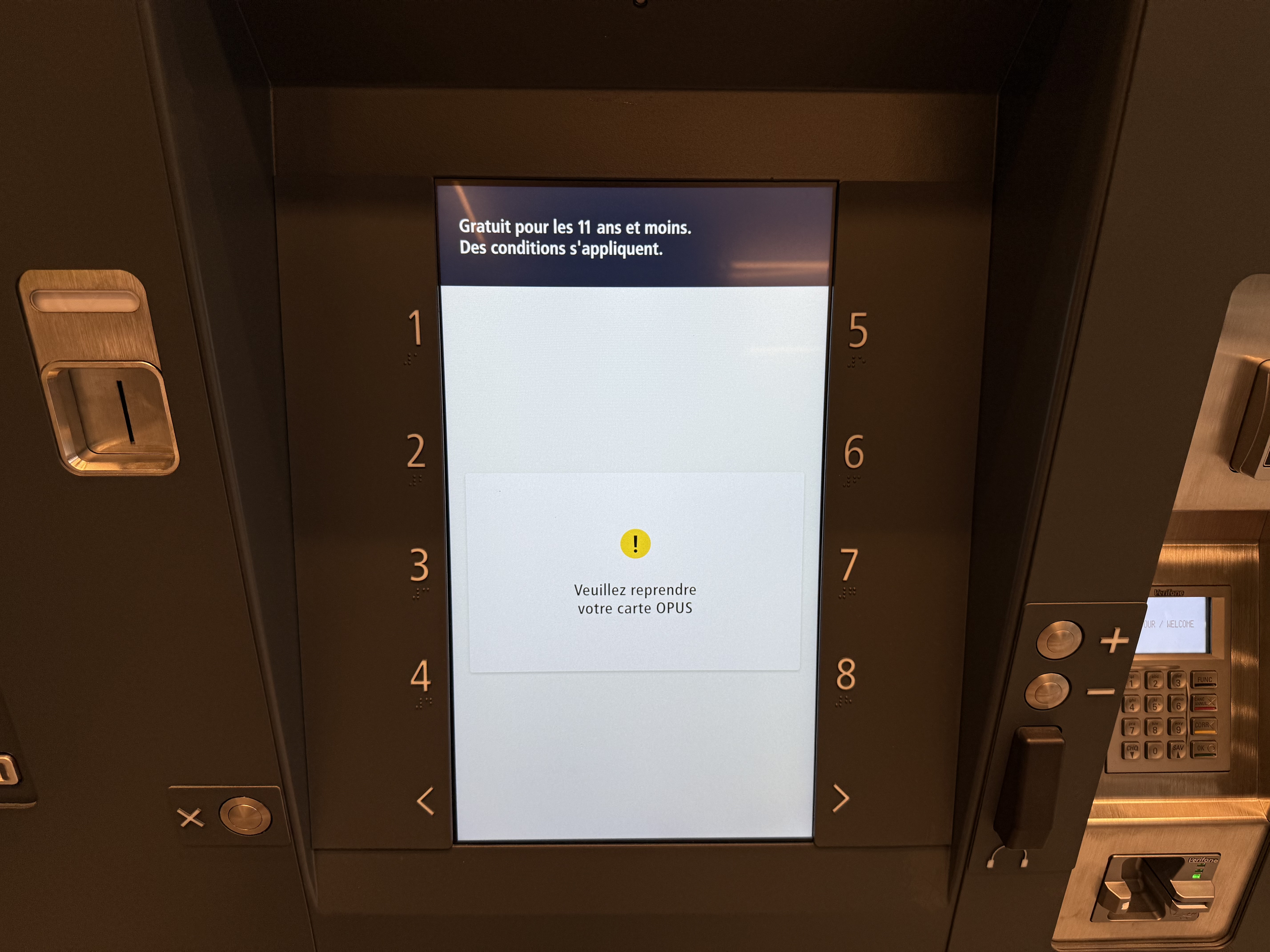 Lorsque la transaction est complétée, si la carte OPUS est laissée dans le socle trop longtemps. La DAT affiche un message visuel et possiblement sonore.
