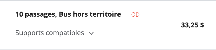 Par ailleurs, vous pouvez acheter 10 billets bus hors territoire pour 33,25$ sur une carte OPUS dédiée Bus hors territoire, donc ça reviendrait encore moins cher, pour un total de 6,65$ au lieu de 8,15$ ![]()