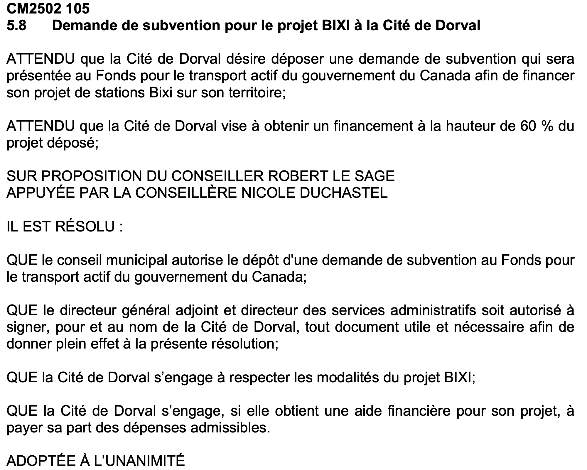 Il y a 600 000$ dans le budget de 2025 pour Bixi à Dorval (approuvé le décembre dernier)