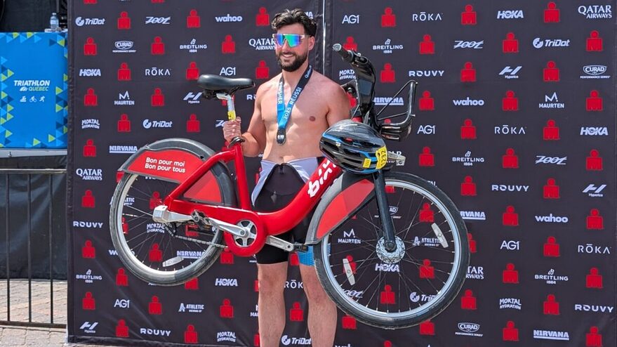 On Sunday at the Mont-Tremblant triathlon, the athlete chose a unique setup for the bike portion: a Bixi — a bike-share ride.