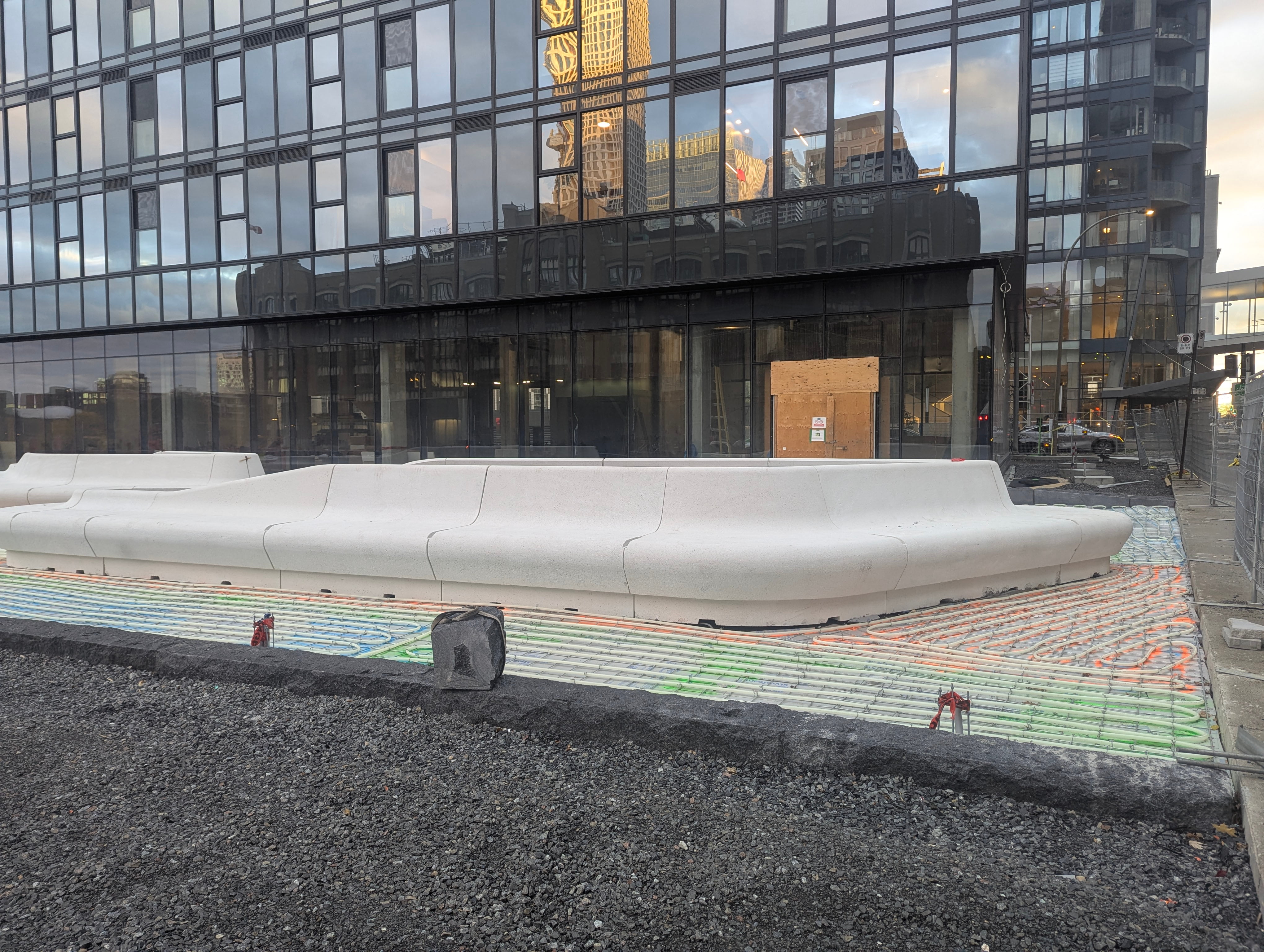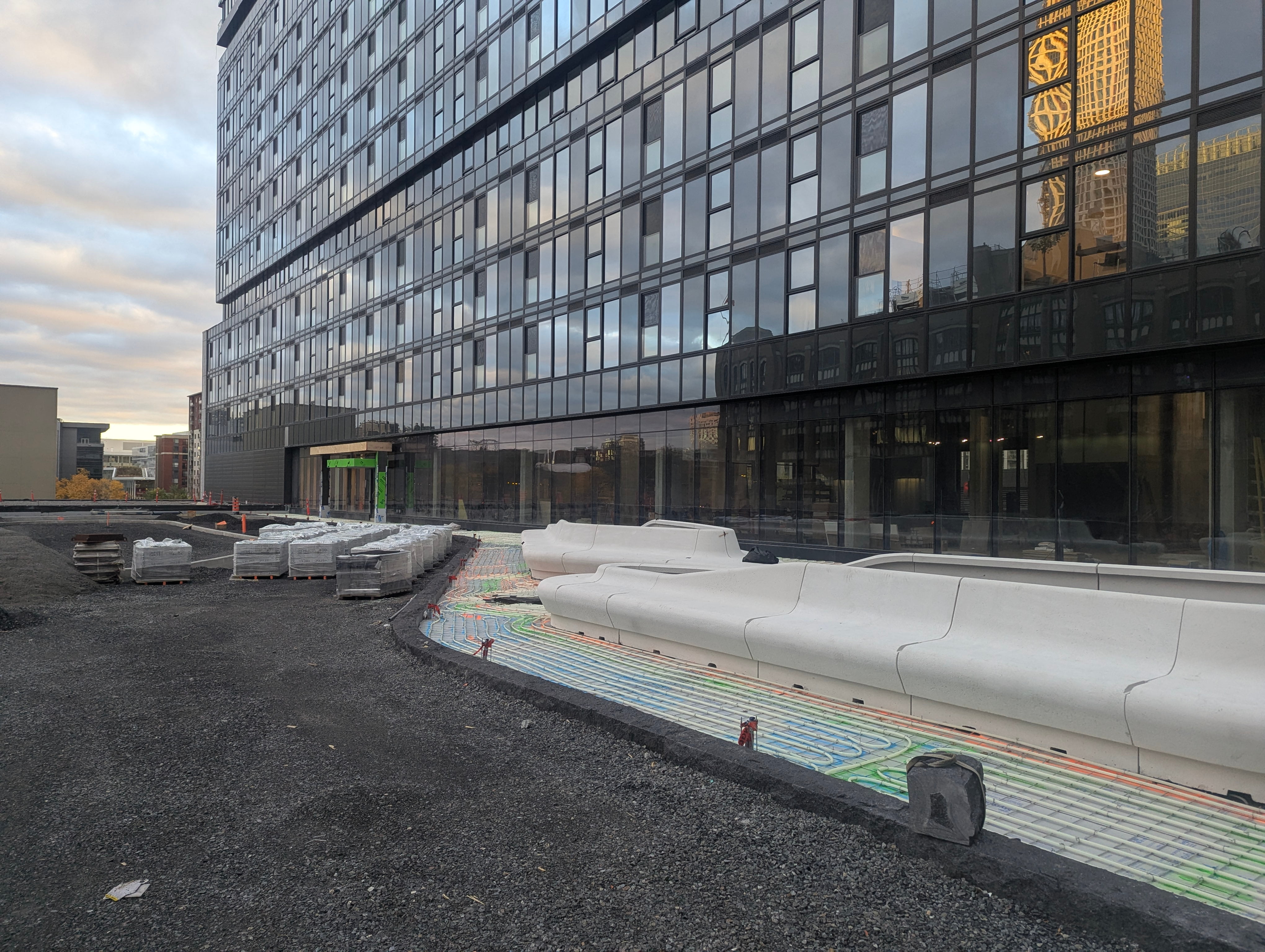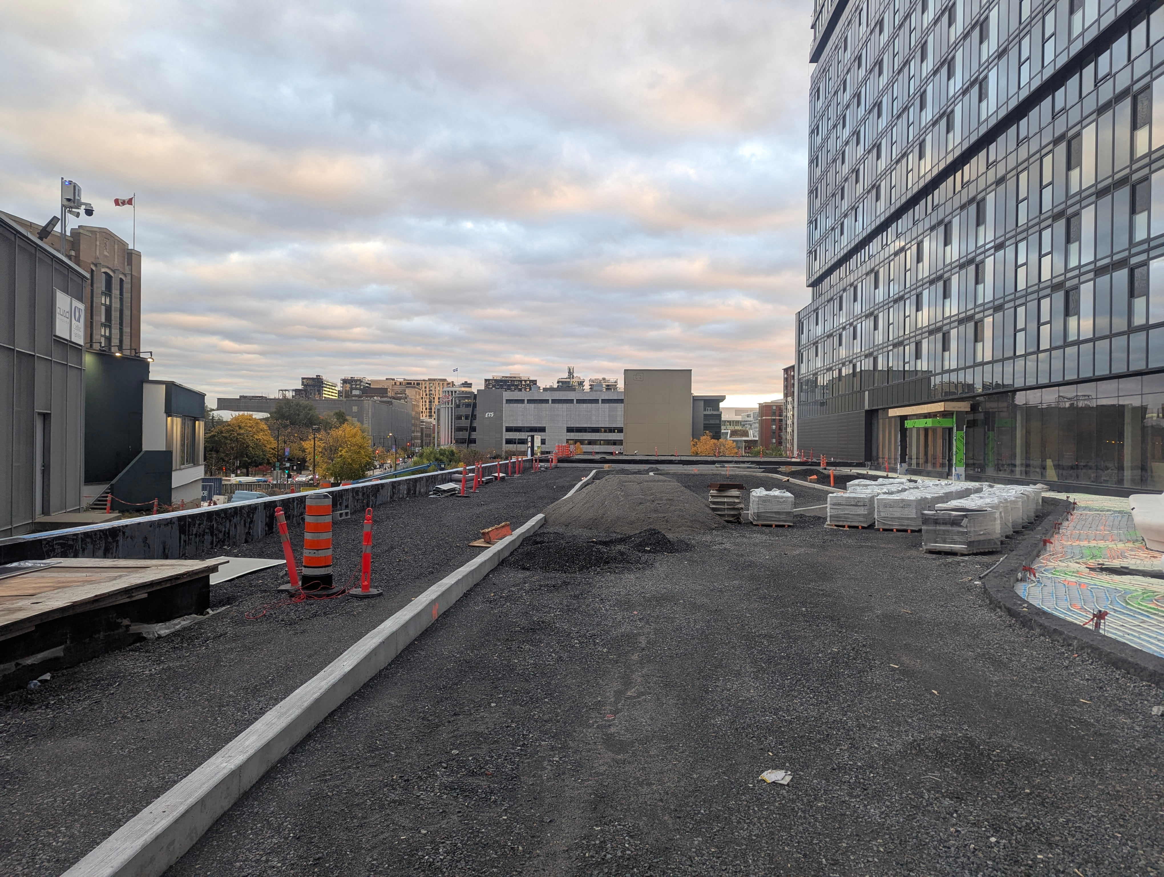 Les lignes blanches en cours d’ajout sur le Carré Windsor sont de plus en plus visibles de l’ouest. L’effet d’escalier avec cette nouvelle tour ajoute un certain mouvement visuel.