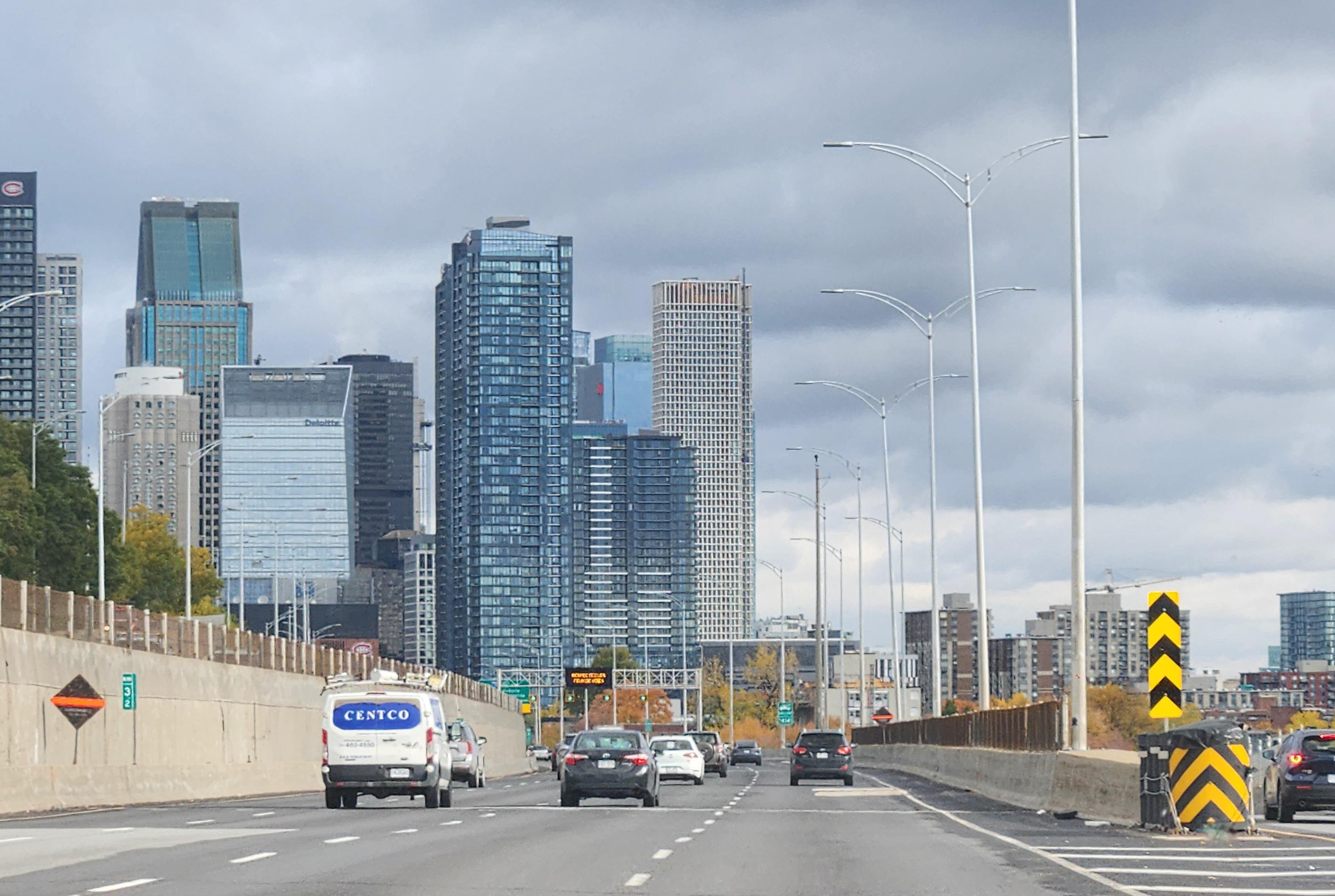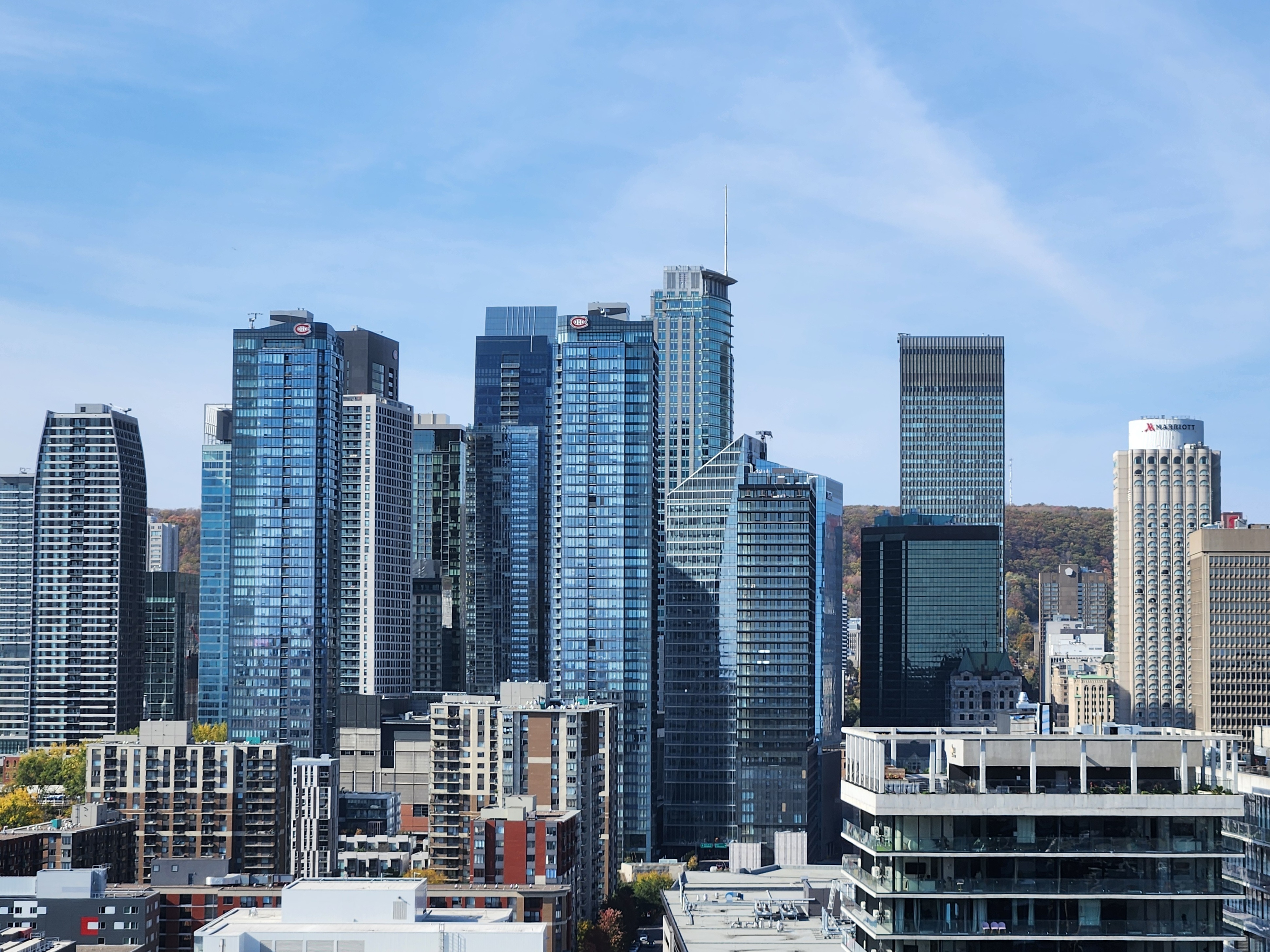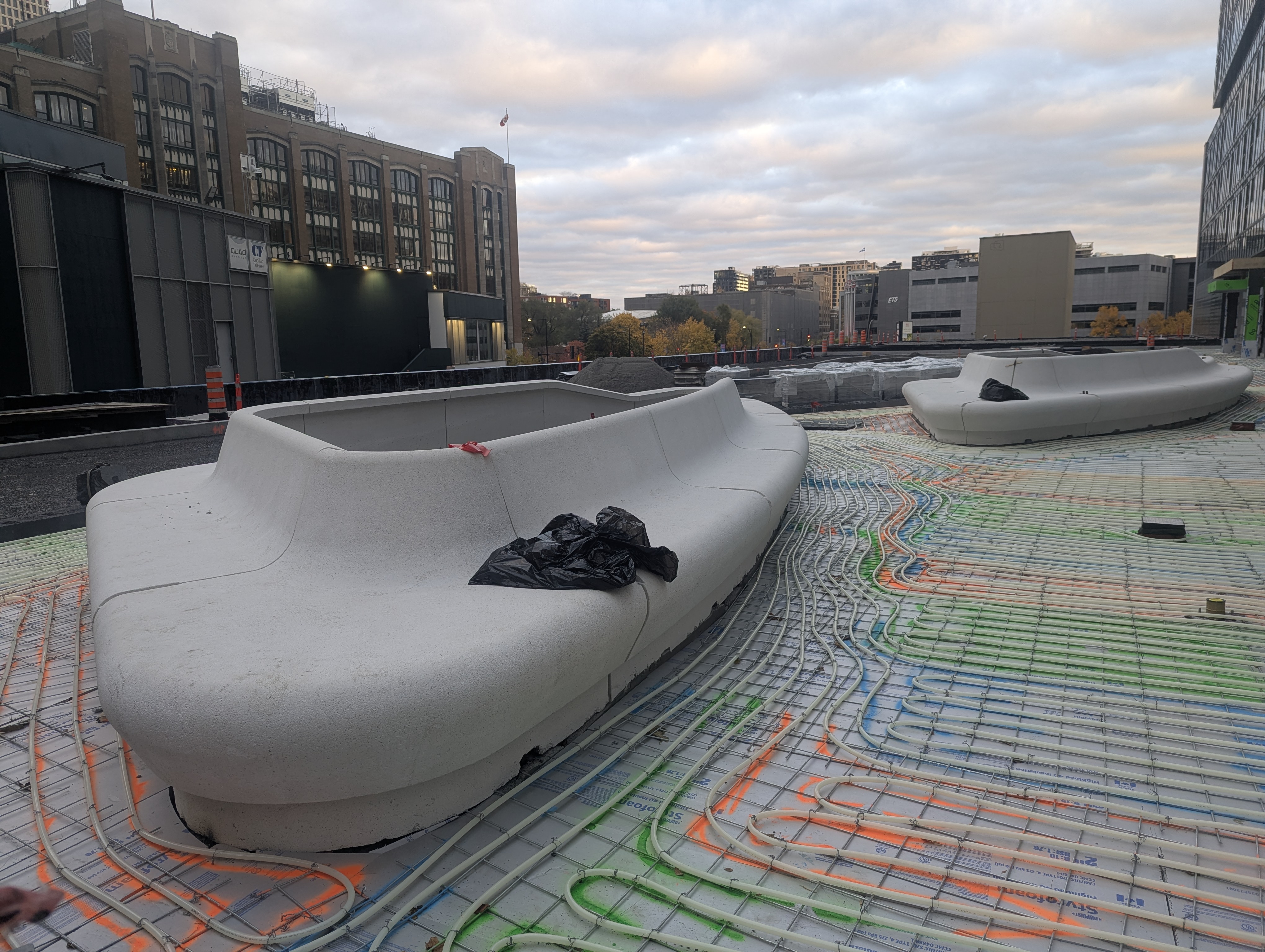 Les lignes blanches en cours d’ajout sur le Carré Windsor sont de plus en plus visibles de l’ouest. L’effet d’escalier avec cette nouvelle tour ajoute un certain mouvement visuel.
