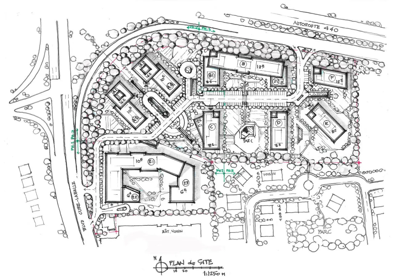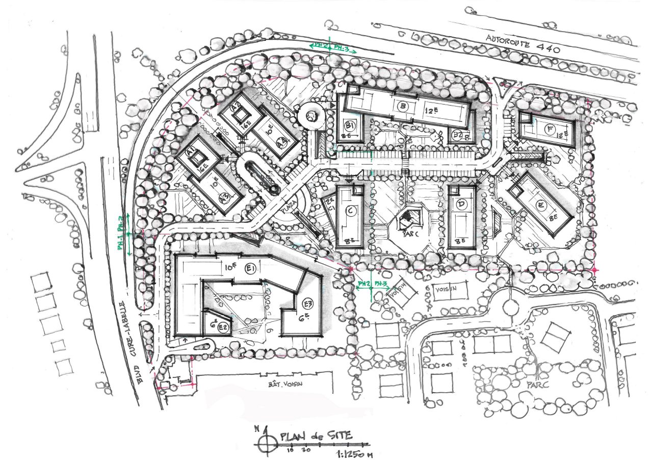 En fait, des documents que j’ai lus, les bâtiments C, D et les E seraient correct pour être résidentiels si Les autres bâtiments sont assez hauts. Les architectes ont aussi judicieusement dessiné leur parc et la plaza à l’intérieur du projet. Leur plus gros crime, ce n’est de pas relier les routes avec le vieux quartier en arrière. Peut-être que les lignes que je vois seront des chemins piétons?