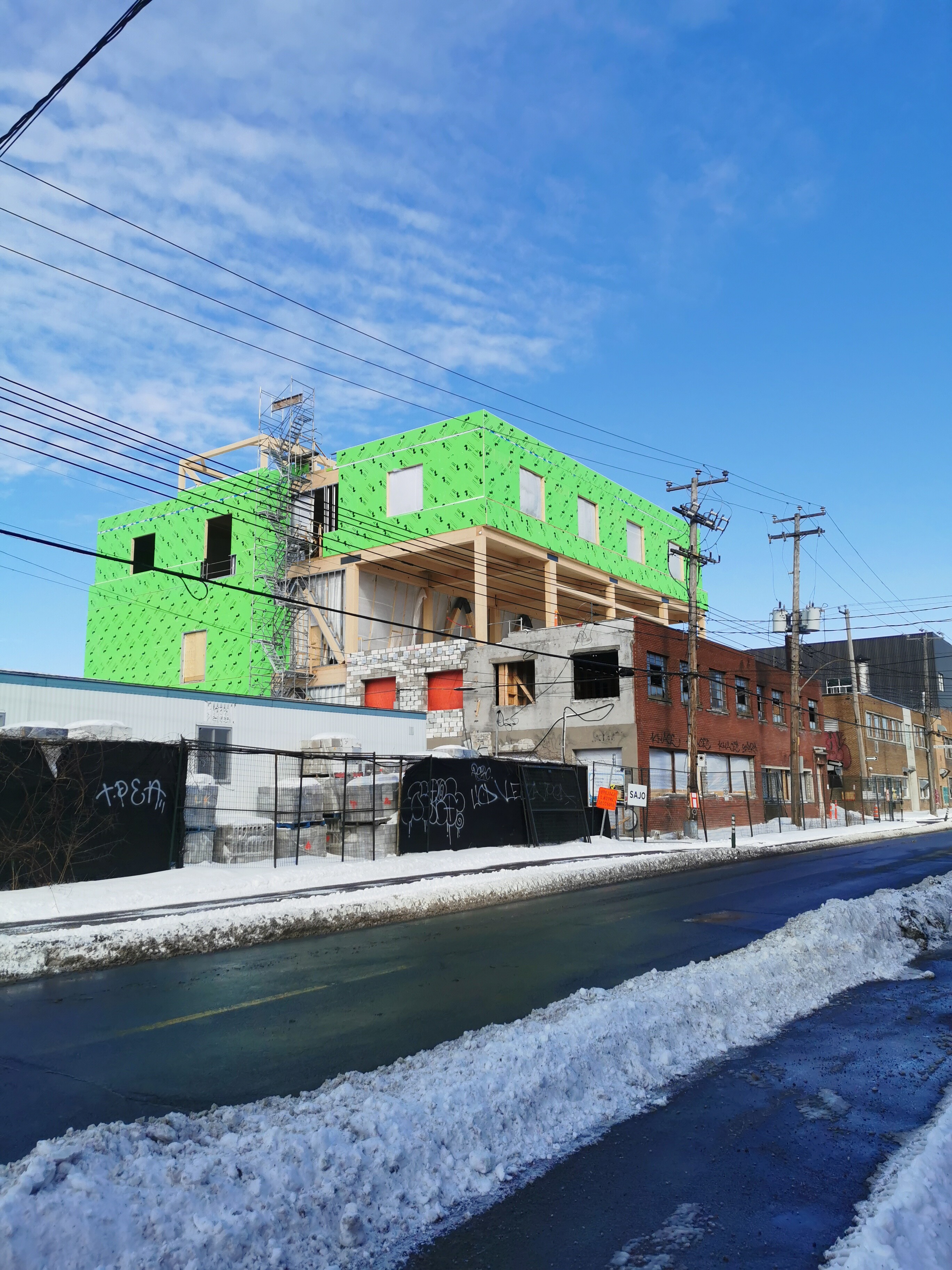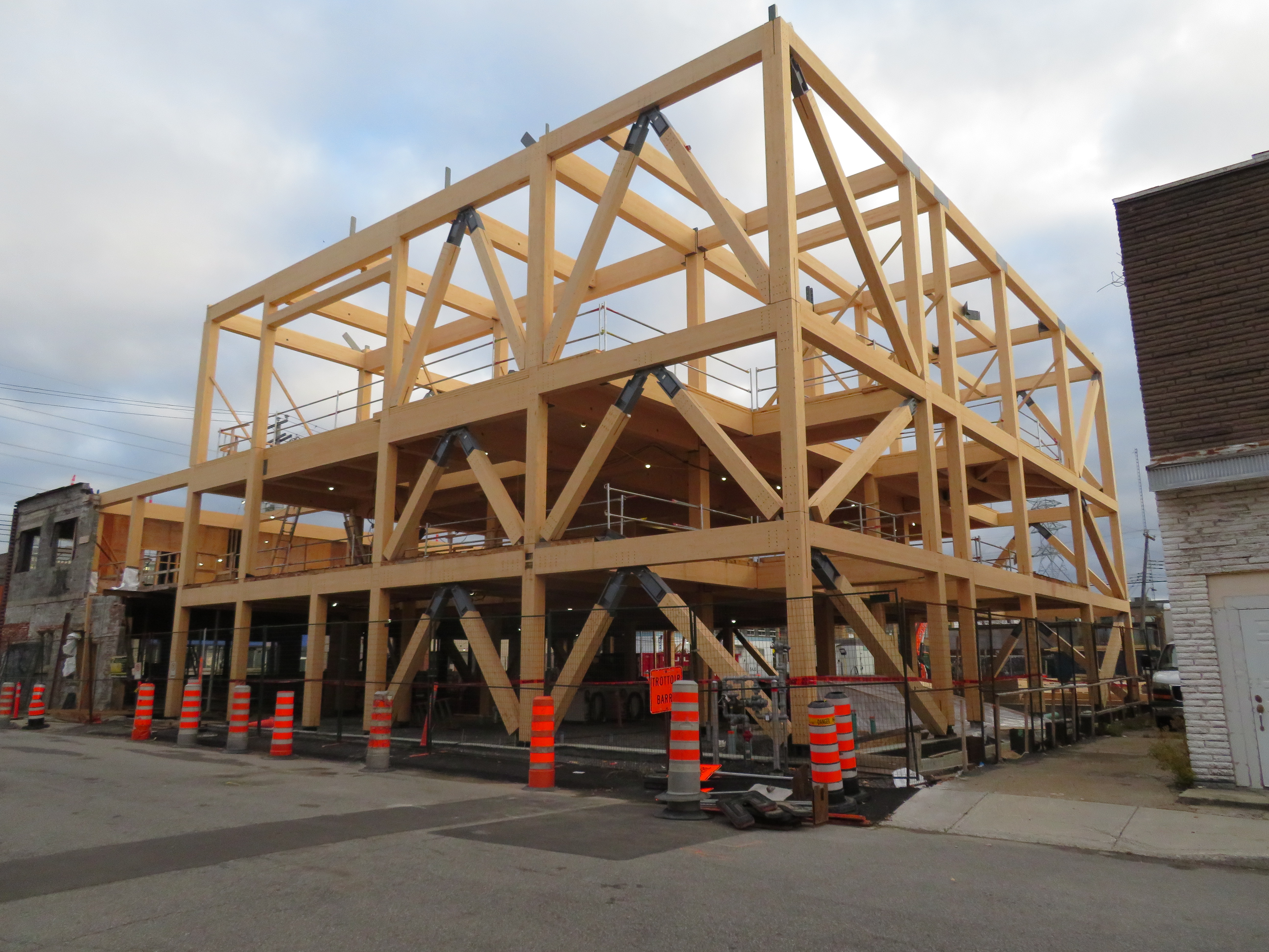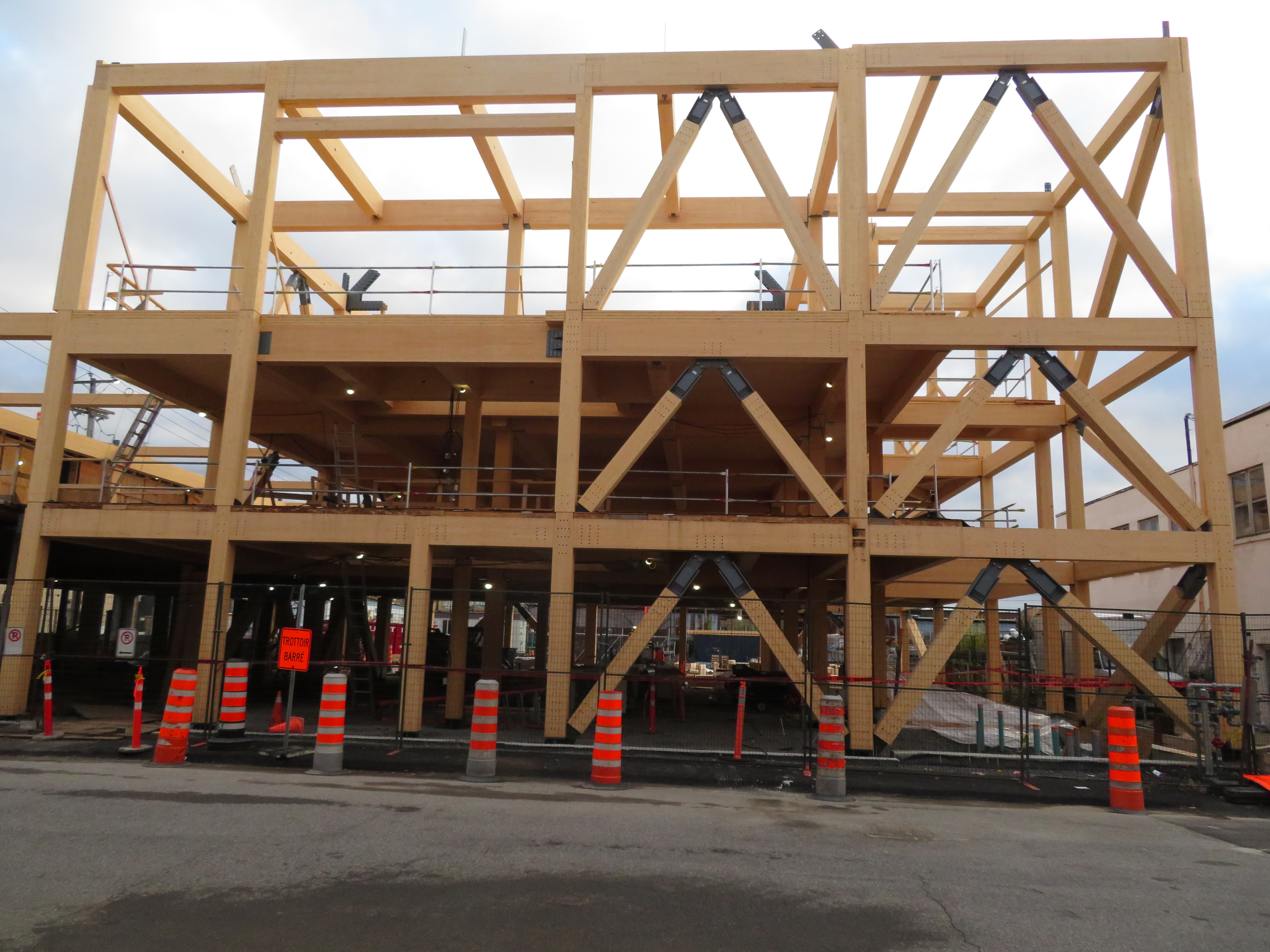 C’est la première fois que je vois une structure de ce type à Montréal. Le contreventement en diagonale avec les plaques d’attache est assez impressionnant.
