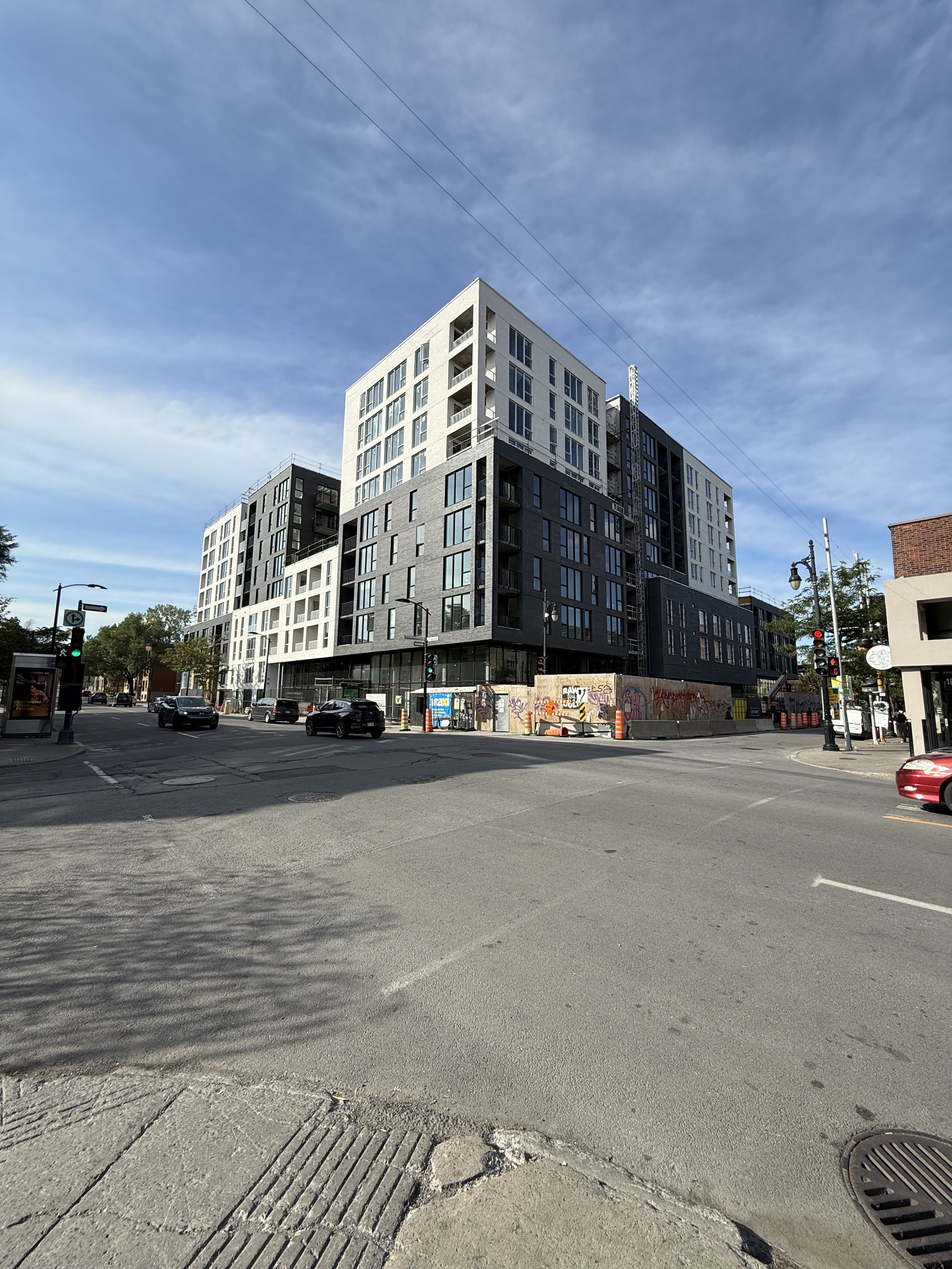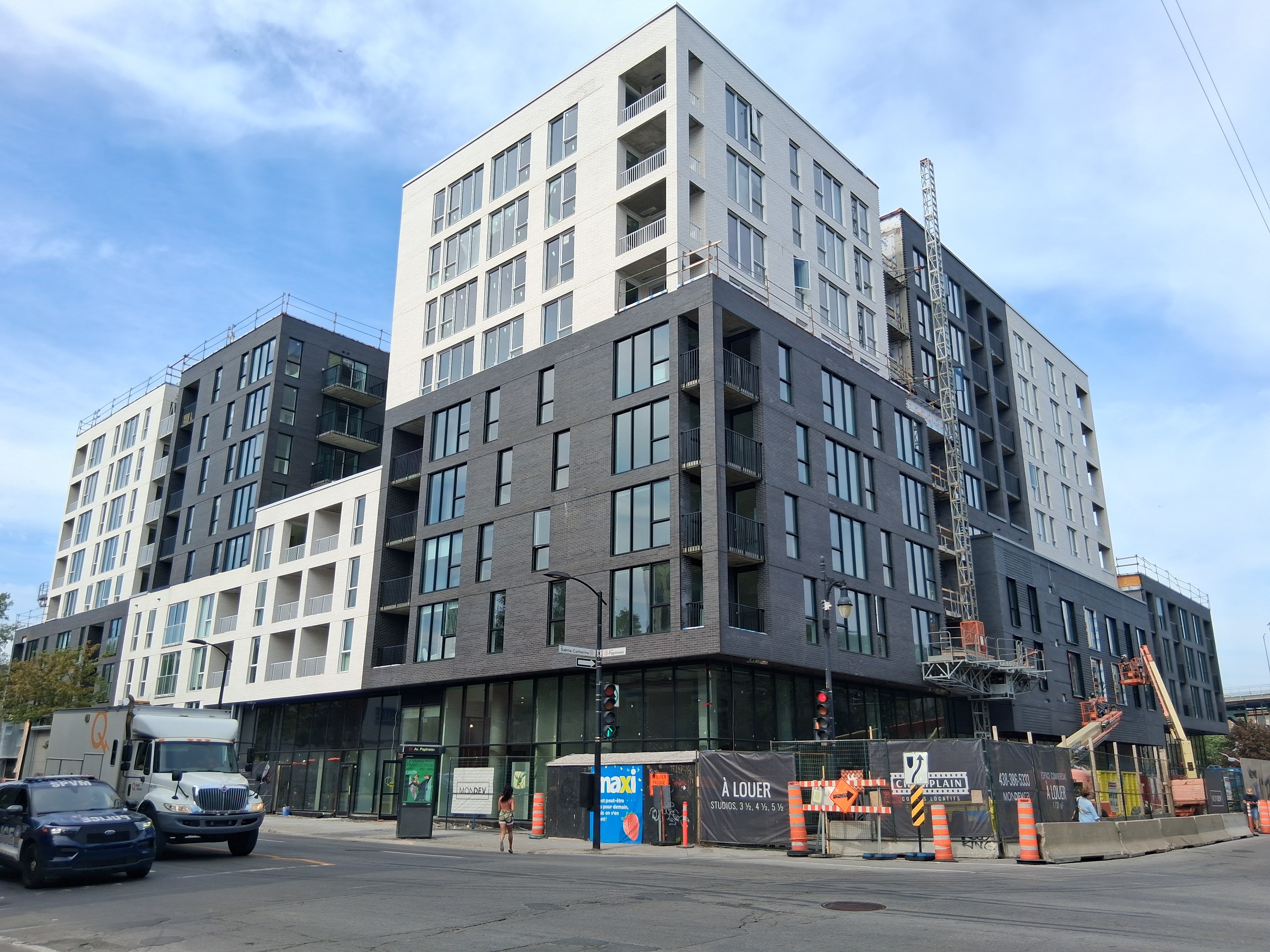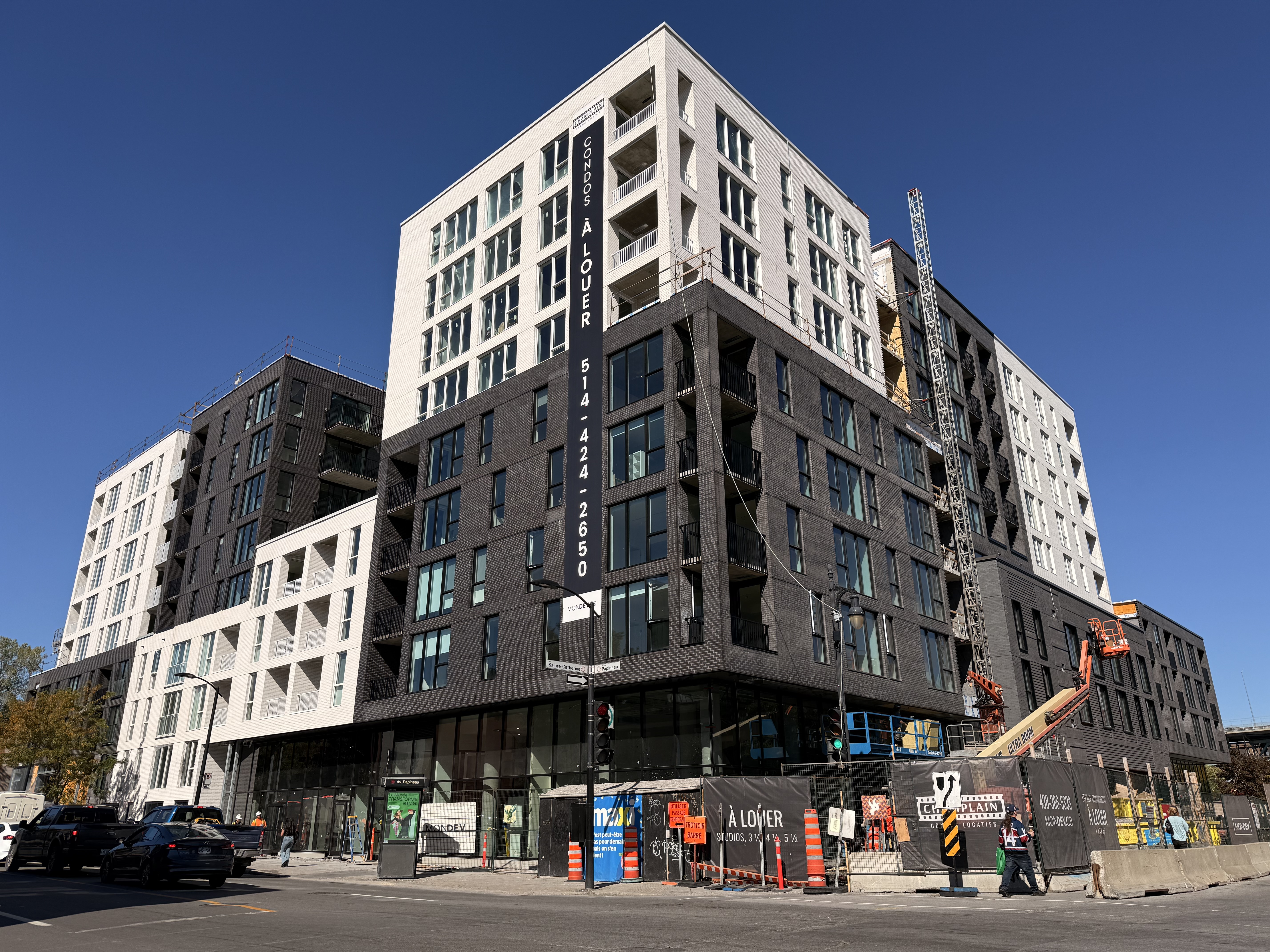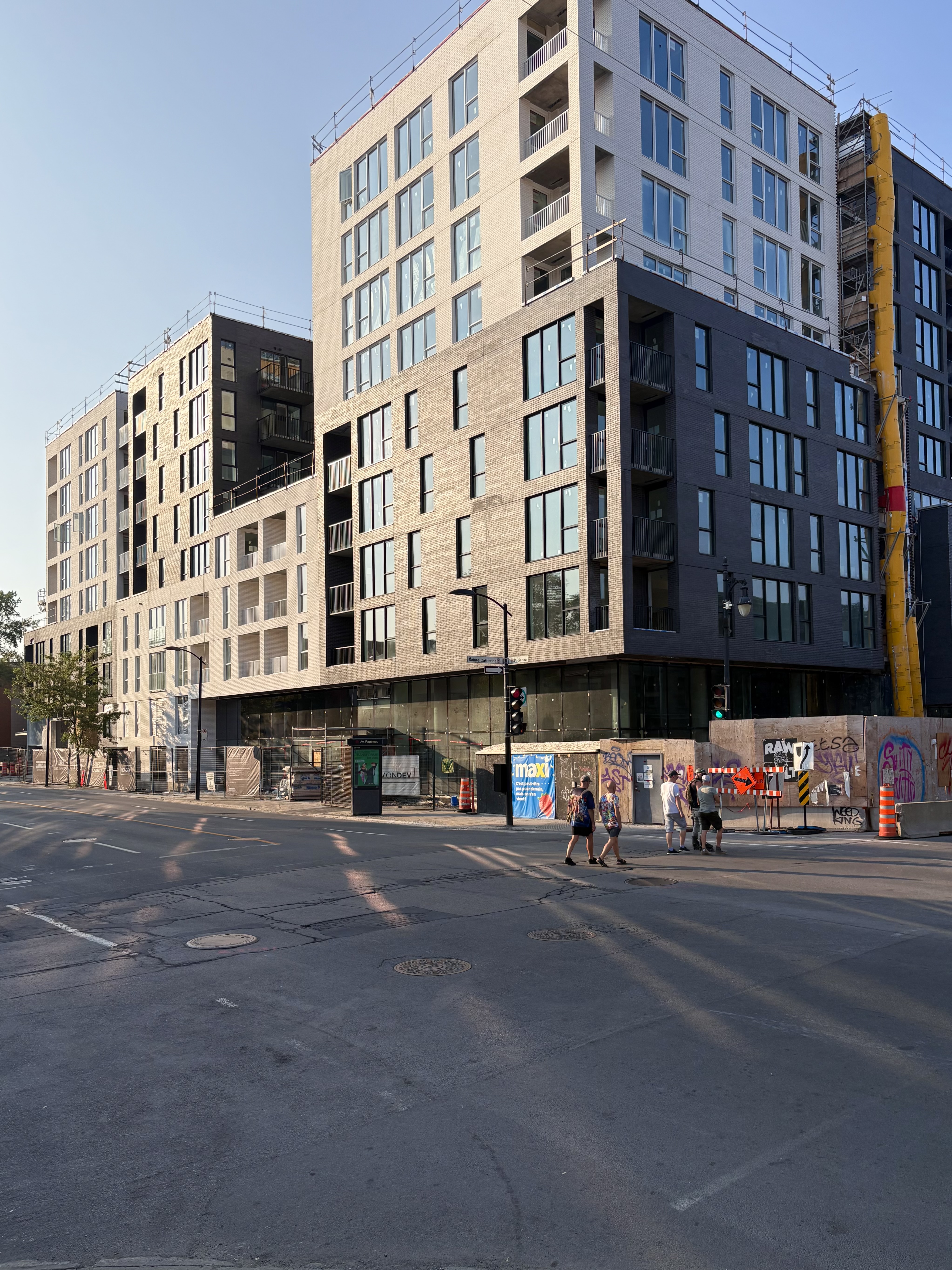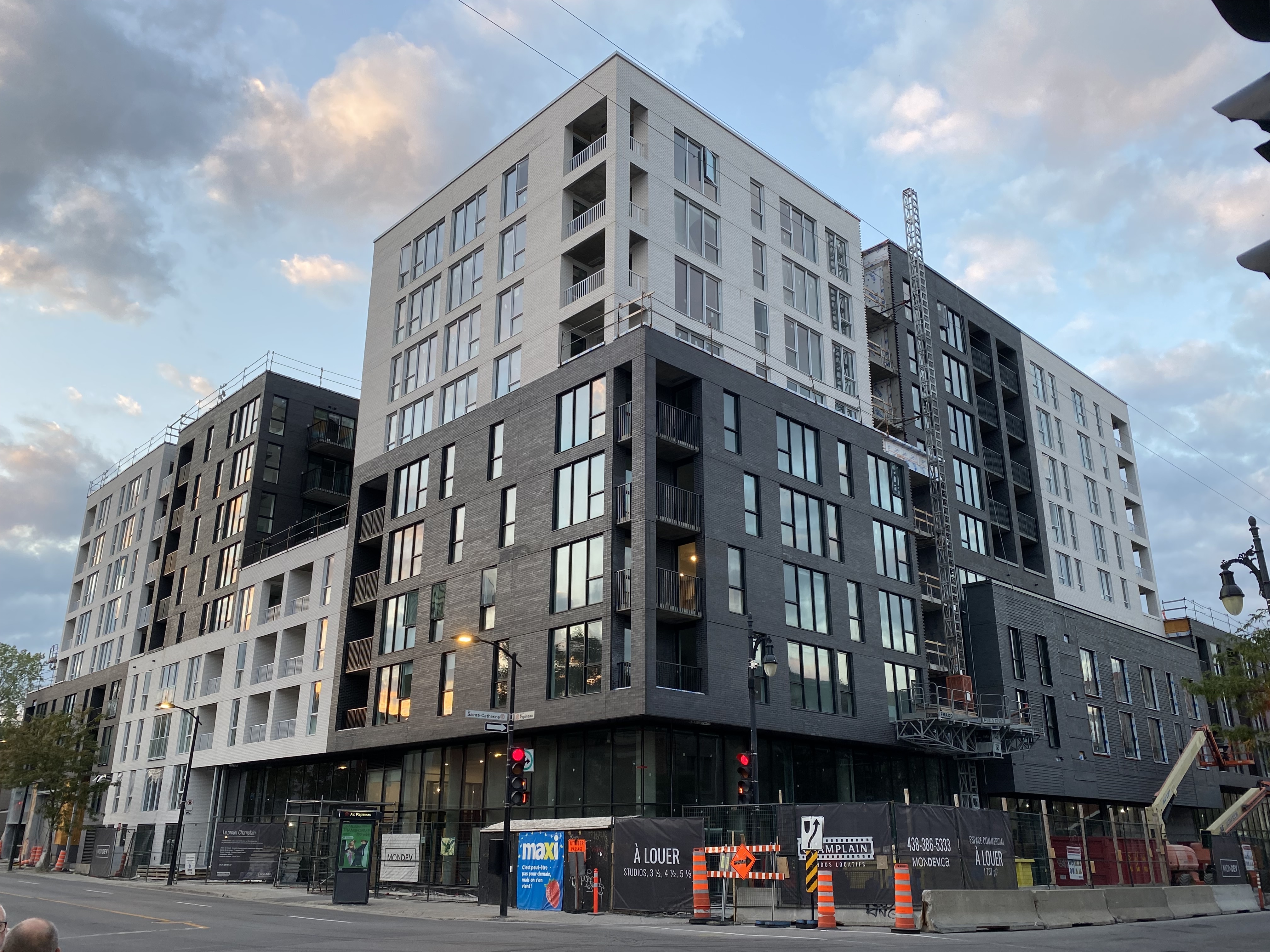 S’insère très bien dans son environnement. J’apprécie particulièrement les différents décrochés qui ajoutent du mouvement, ainsi que le recul au niveau des 2 premiers étages au coin de l’avenue Papineau et Sainte-Catherine, qui permet un trottoir plus large. Le logo du projet rappelle également l’ancien cinéma sur le site avec sa pellicule, joli clin d’oeil.