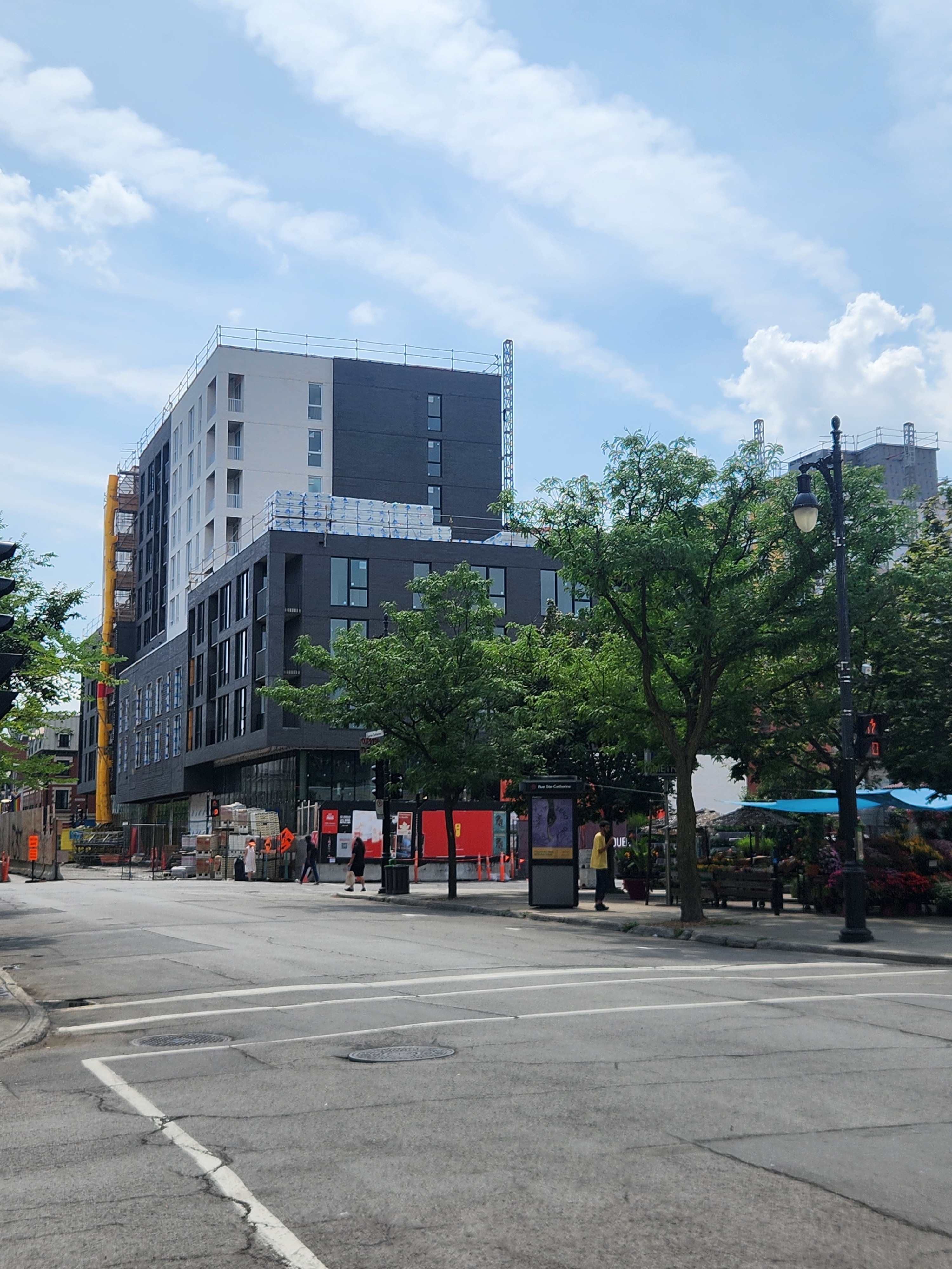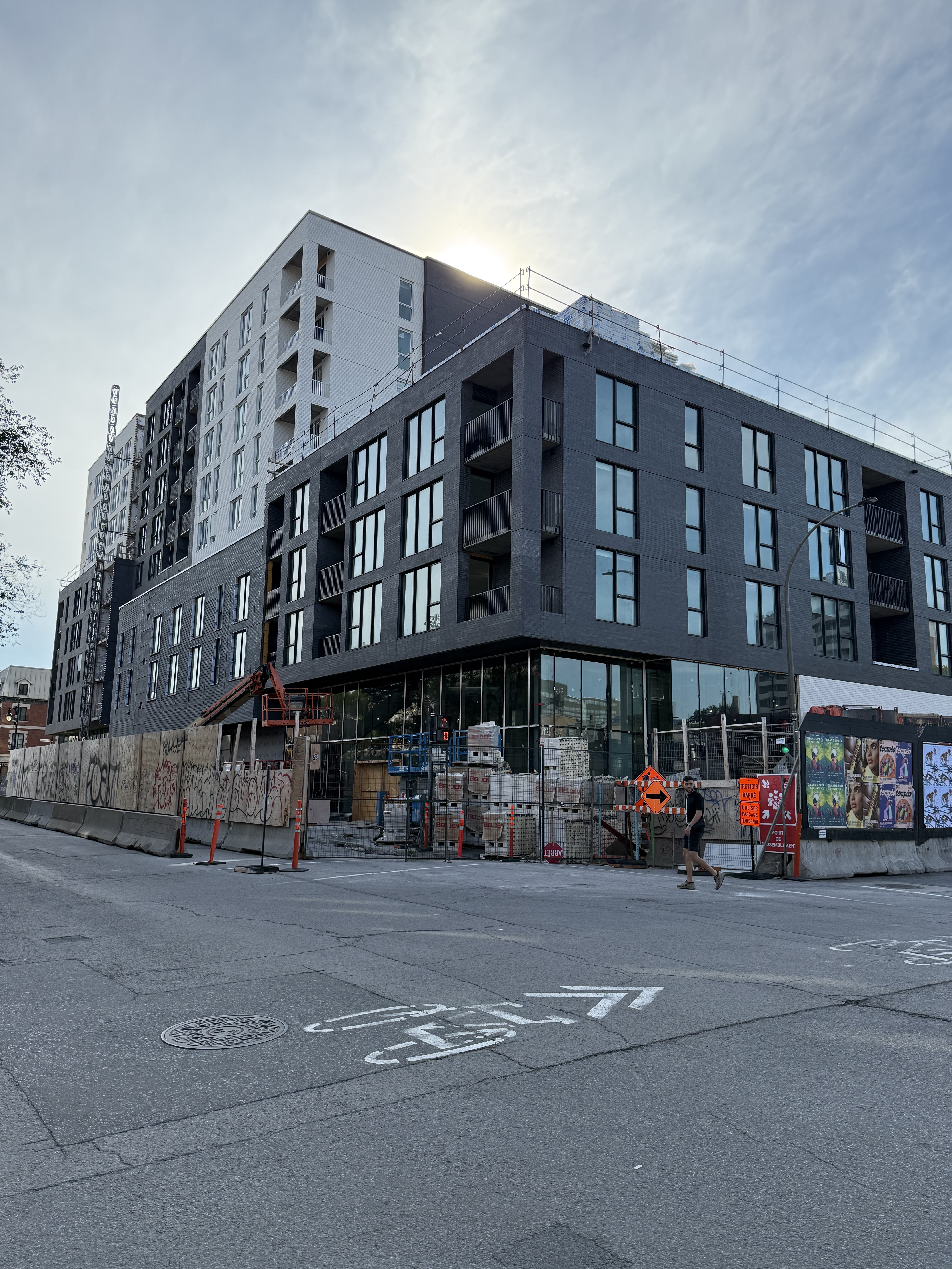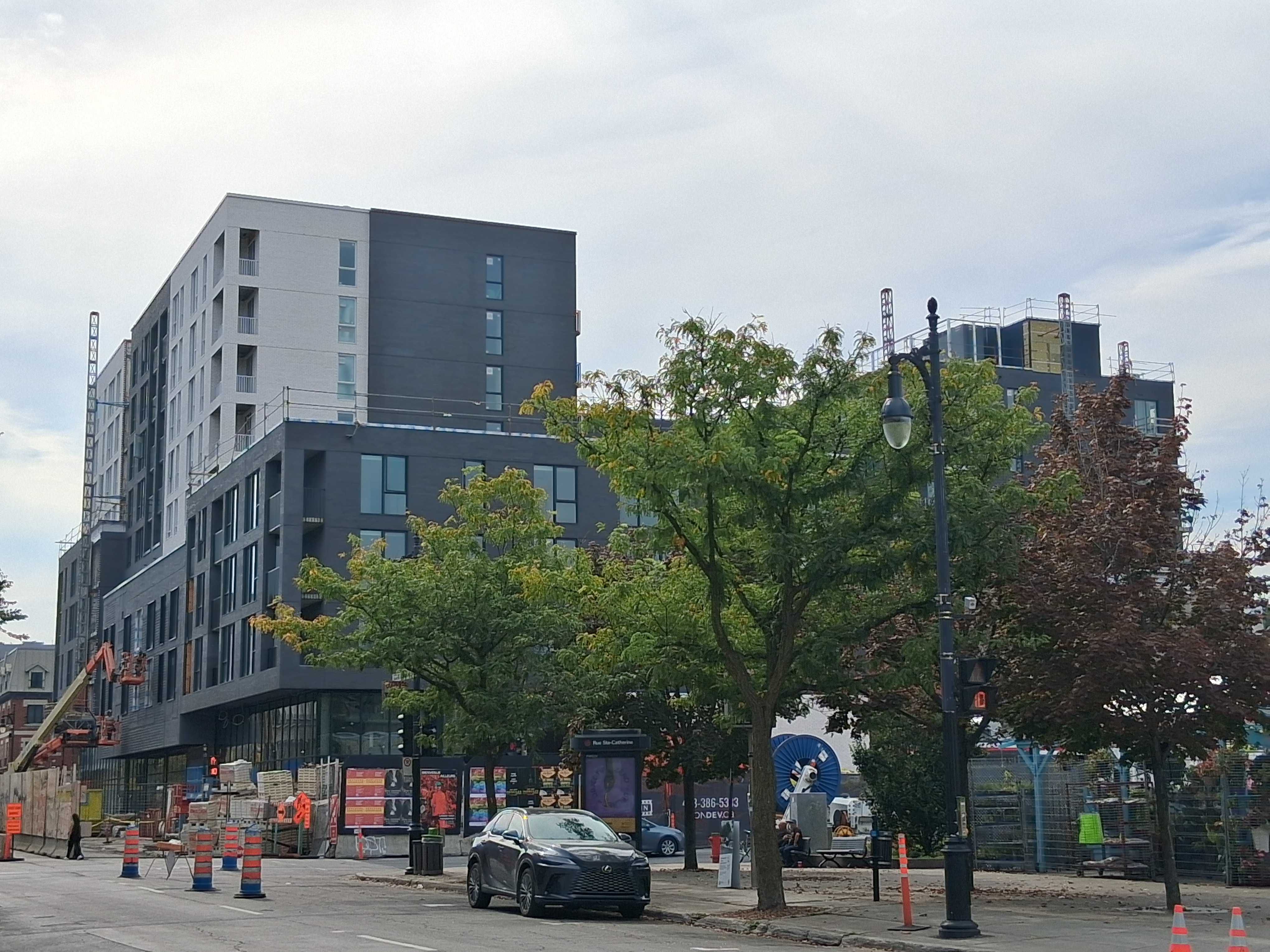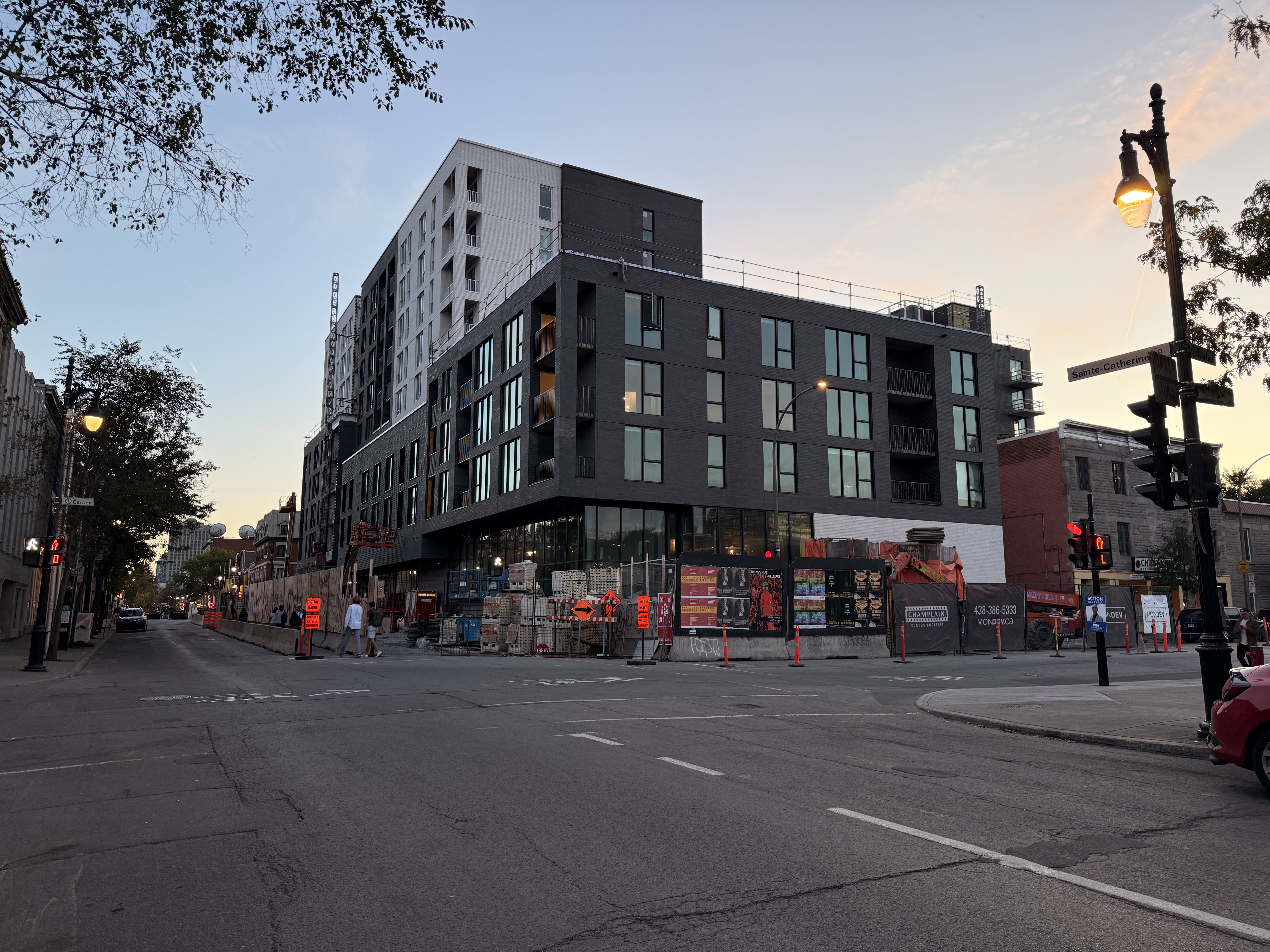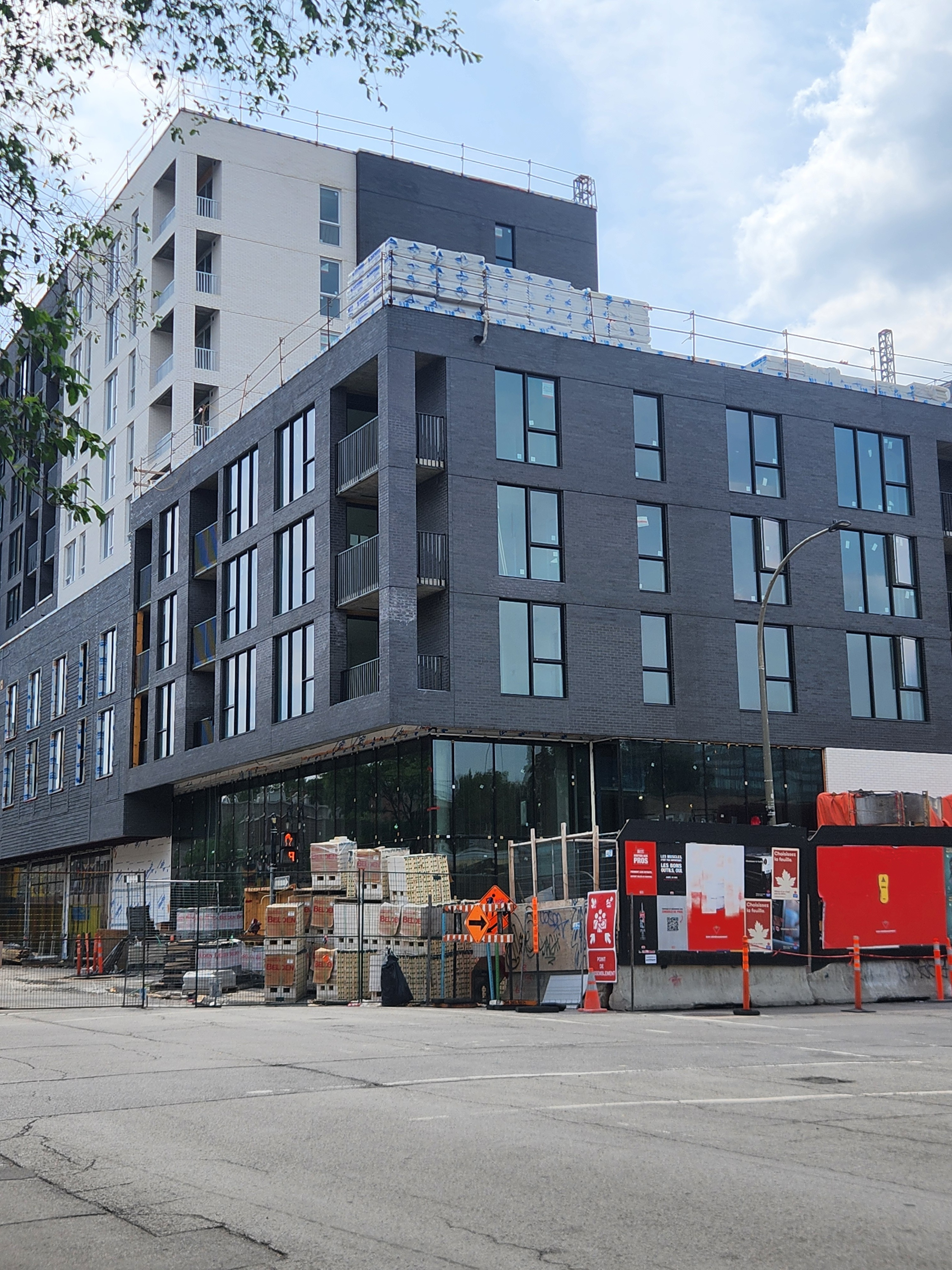 S’insère très bien dans son environnement. J’apprécie particulièrement les différents décrochés qui ajoutent du mouvement, ainsi que le recul au niveau des 2 premiers étages au coin de l’avenue Papineau et Sainte-Catherine, qui permet un trottoir plus large. Le logo du projet rappelle également l’ancien cinéma sur le site avec sa pellicule, joli clin d’oeil.