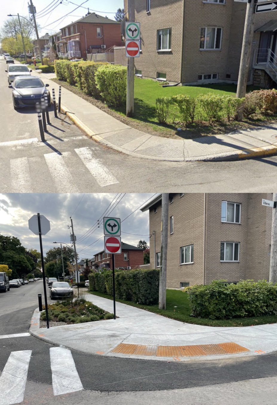 Selon le document, le corridor de marche et en fait élargi. J’imagine que ça semble plus petit parce que l’espace pour les fosses d’arbre est déplacé vers la future piste cyclable (côté rue ou trottoir, dans les deux cas cette section n’est pas encore visible sur tes photos):