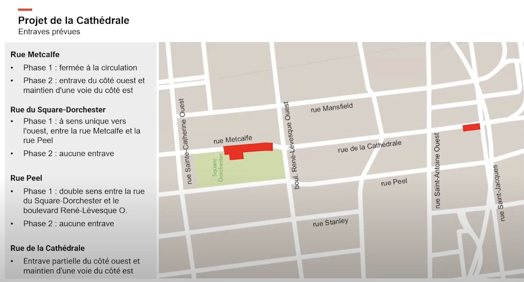 1an de travaux majeurs qui vont déranger grandement, est-ce que c’est travaux vont retarder les travaux de réaménagement de Peel ? Elle va redevenir a double sens pendant presqu’un an