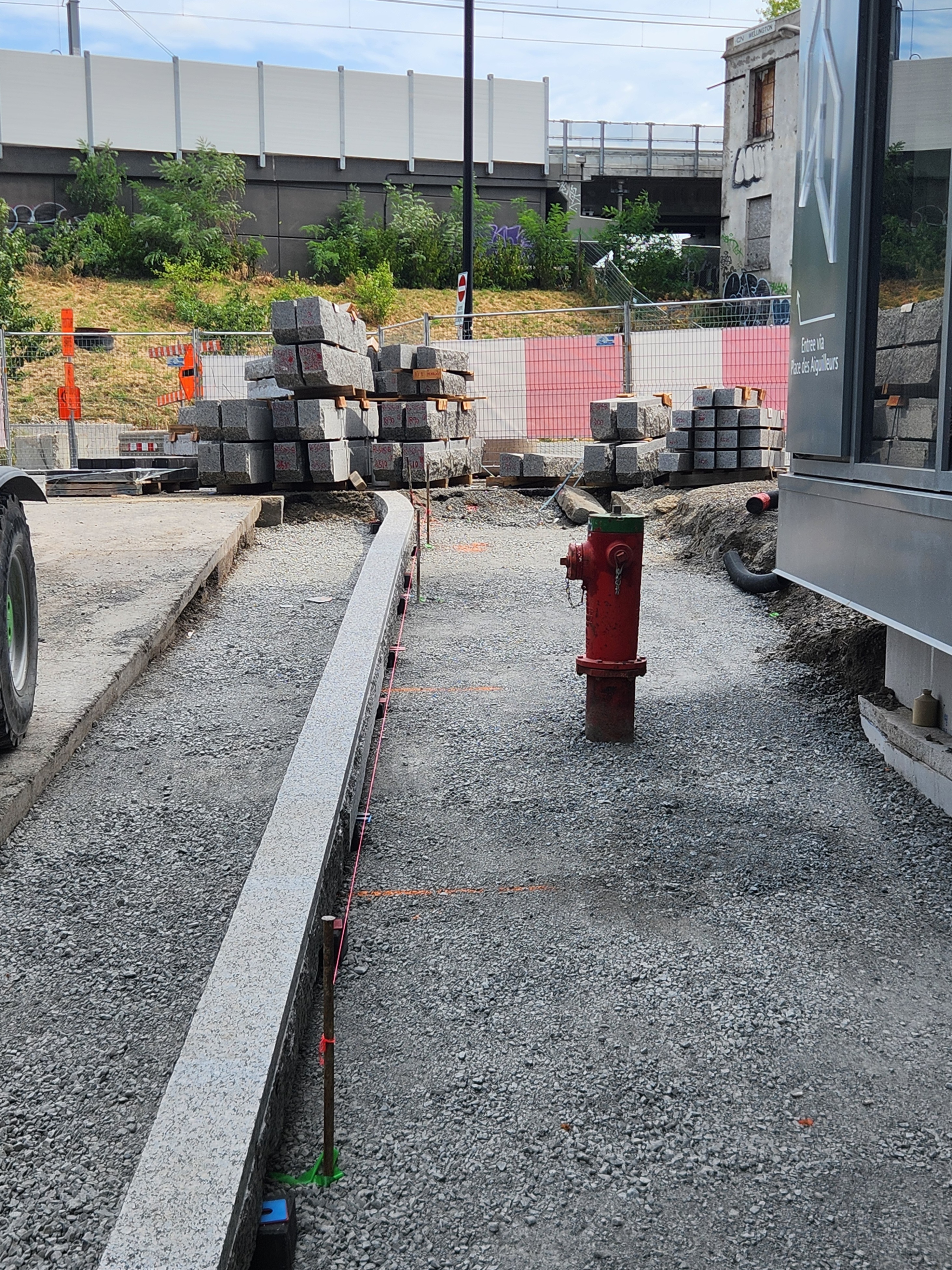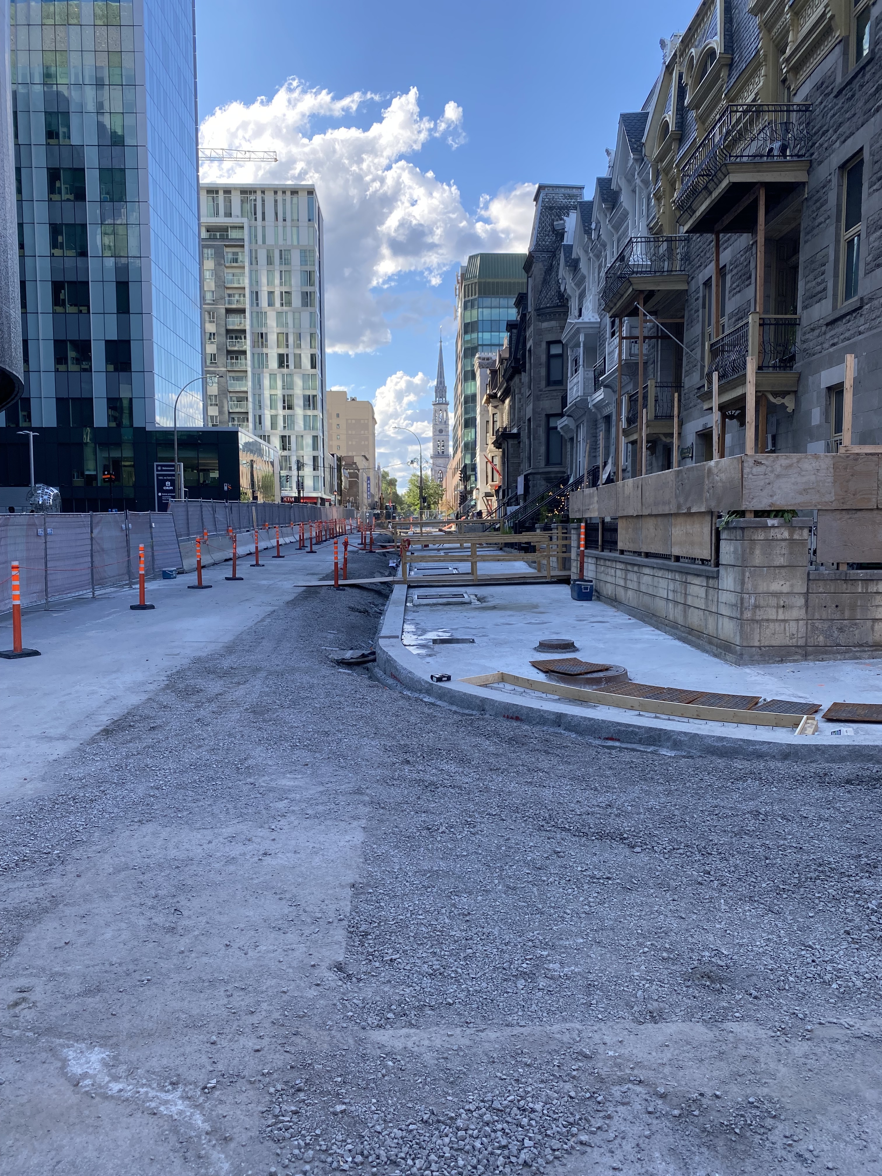 Les travaux de la rue Murray avancent bien. On installe les bordures de granit des nouveaux trottoirs face au Wellington sur le Bassin. La rue à cette hauteur sera à double sens avec une ligne jaune en son centre, selon les rendus.