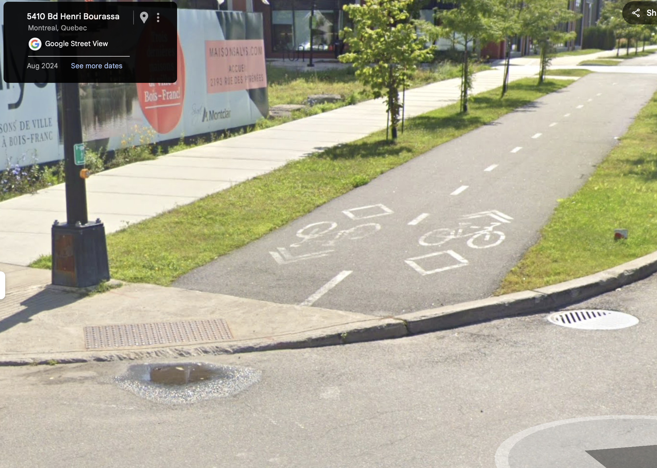 Pire encore, la piste commence à ce niveau juste après le virage vélo. Donc tu tournes et puis soudainement tu as un poteau dans ta face, alors que ton focus est sur l’auto qui fait (ou pas) son arrêt.