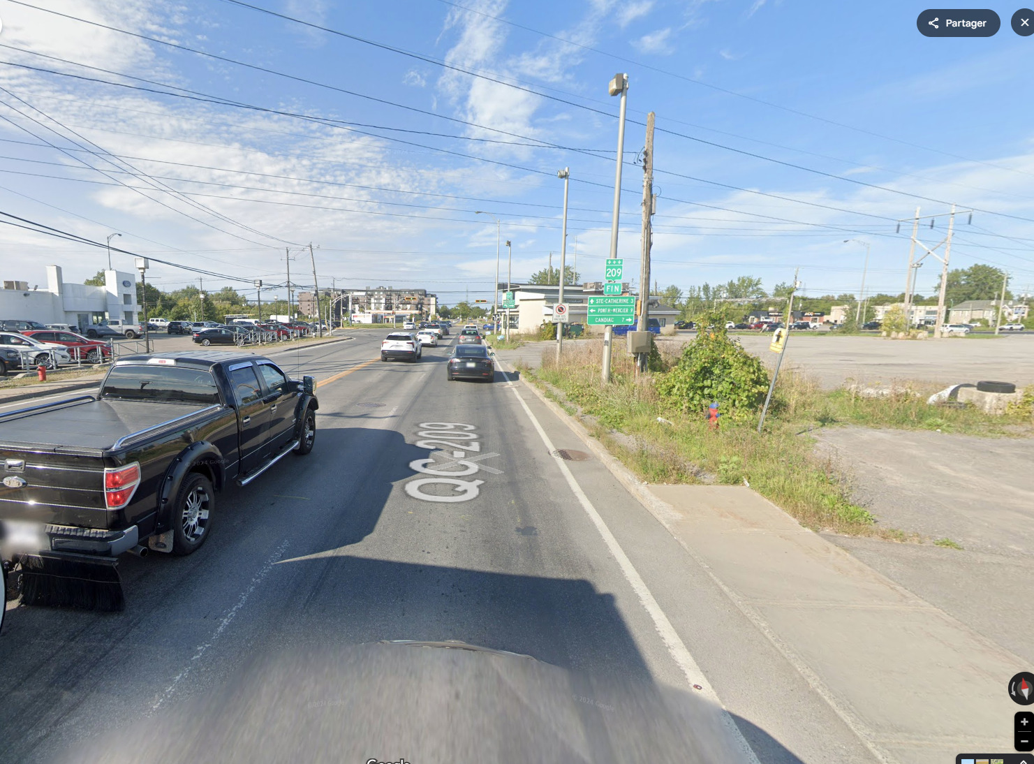 J’ai emprunté cette route tellement de fois en tant que piéton et cycliste et je n’avais jamais remarqué qu’il y avait un trottoir de ce côté. Cette section de la 209 jusqu’au coeur villageois de Saint-Constant est juste horrible. C’est laid à en mourir et c’est hyper dangereux et déplaisant. C’est l’un de mes tronçon de route que j’hais le plud dans la CMM.