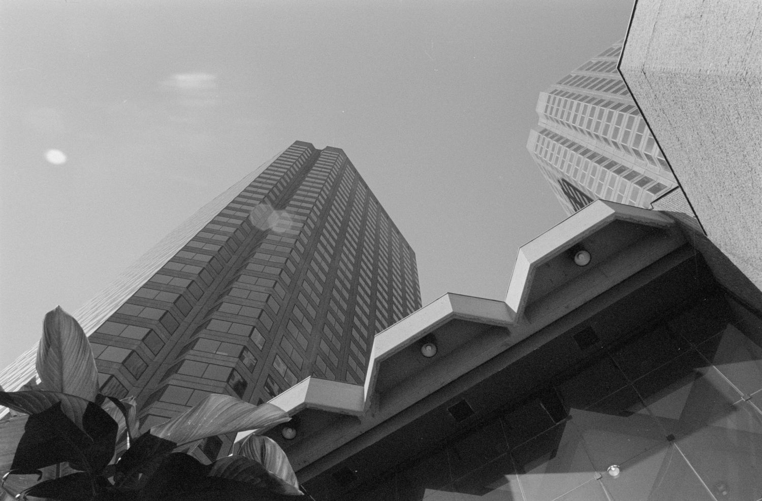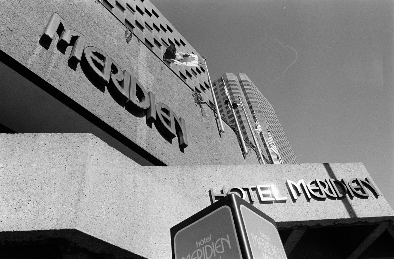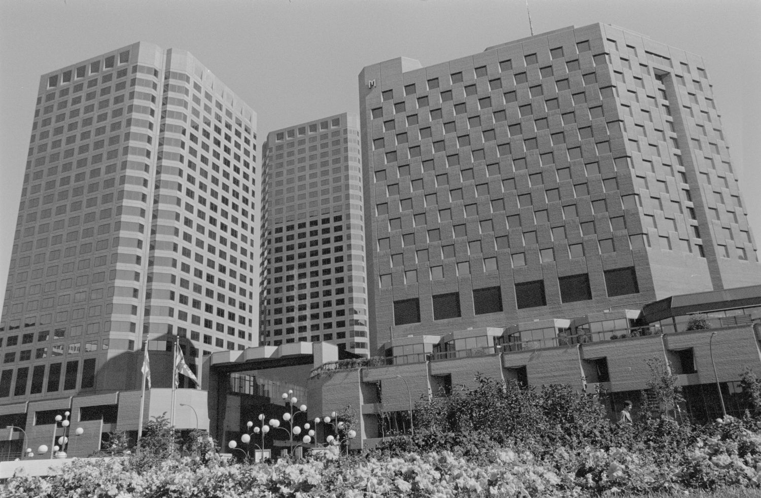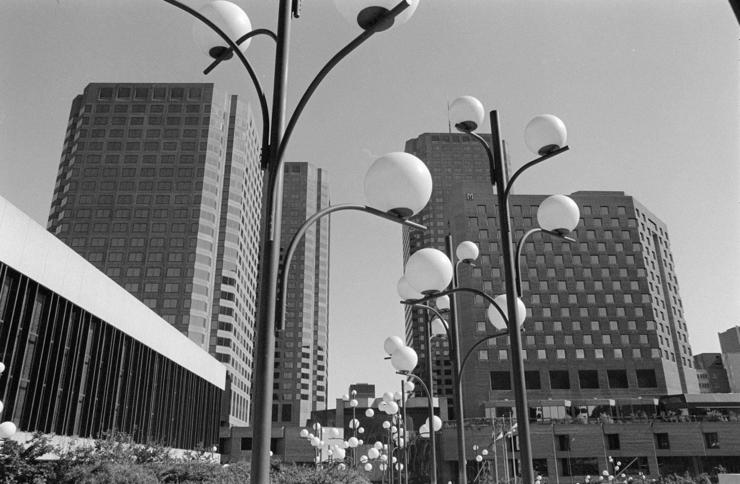 Le Complexe Desjardins quelques années après son ouverture, en 1979. De jolis lampadaires face à la Place des Arts et le premier hôtel, Méridien.
