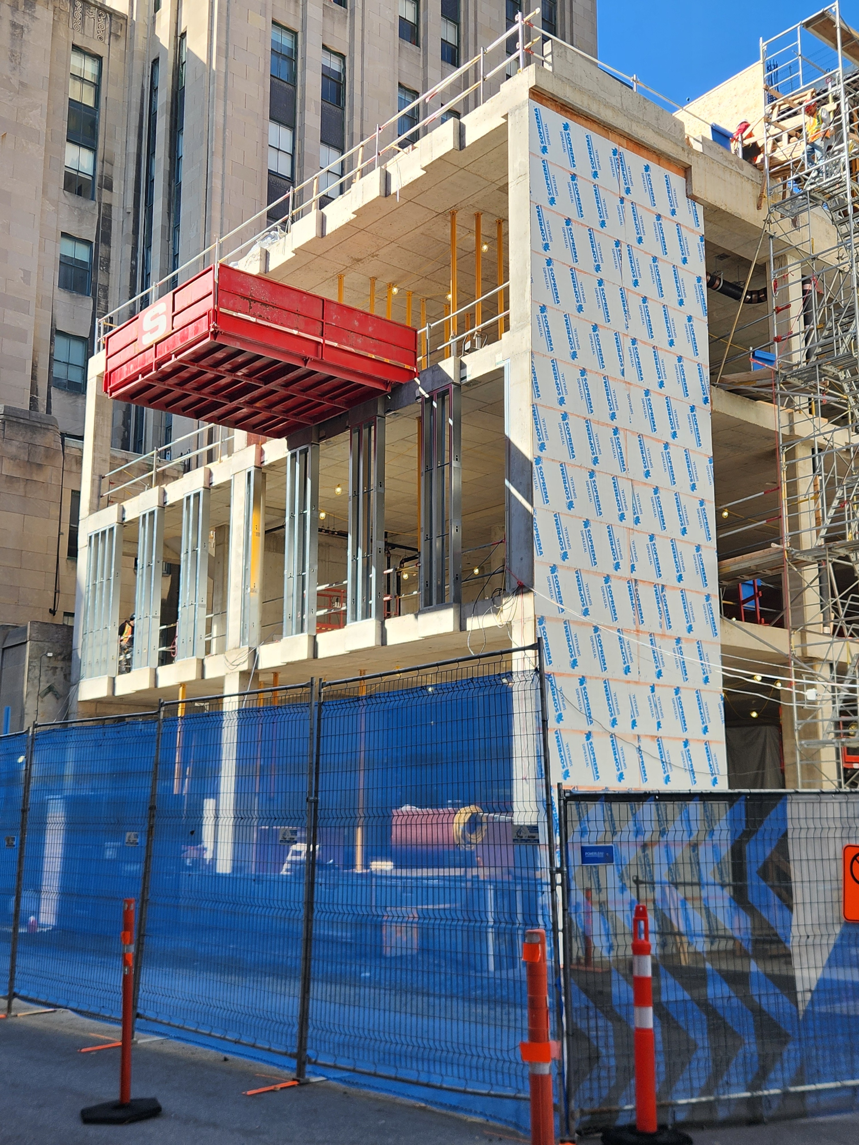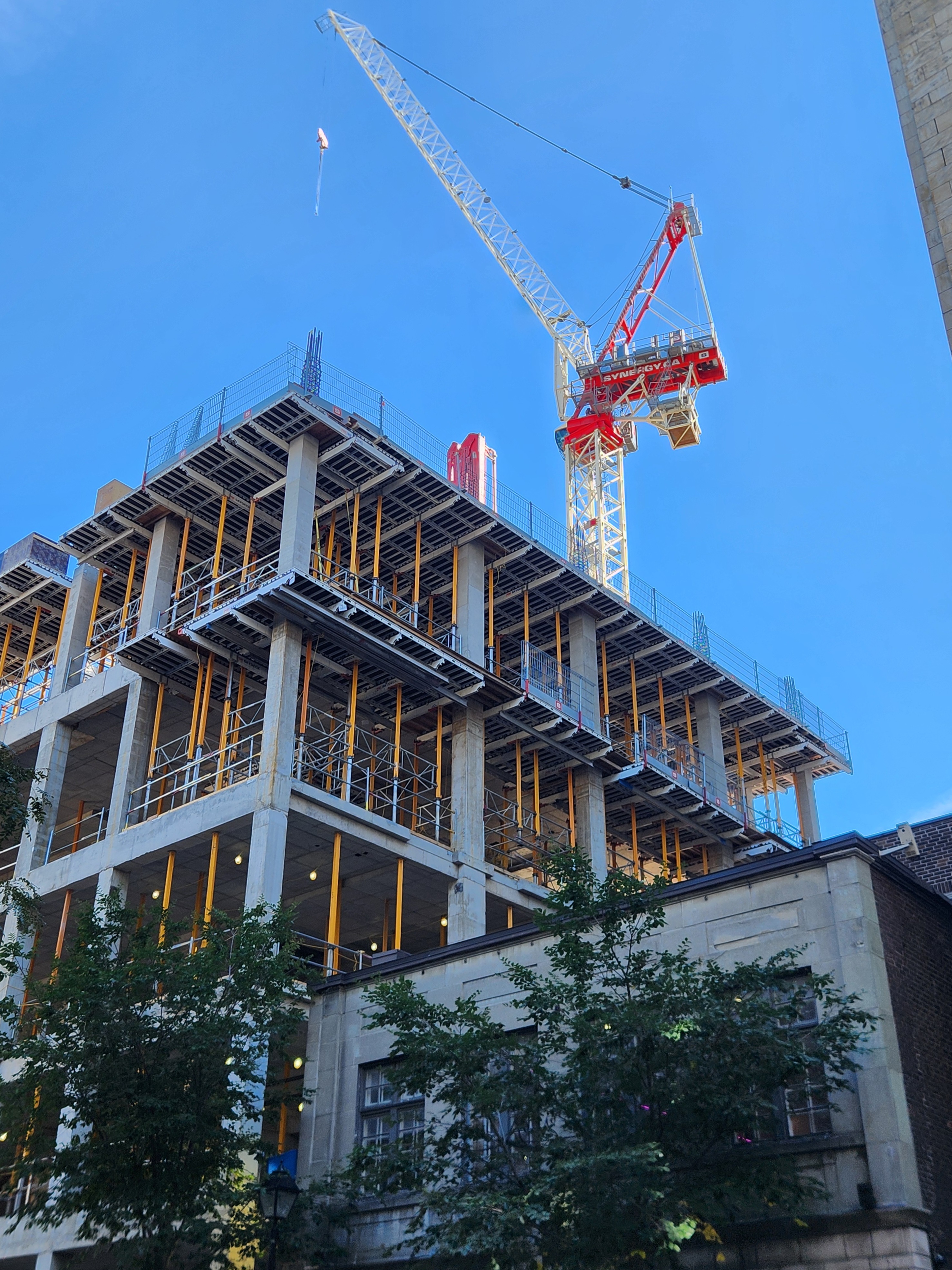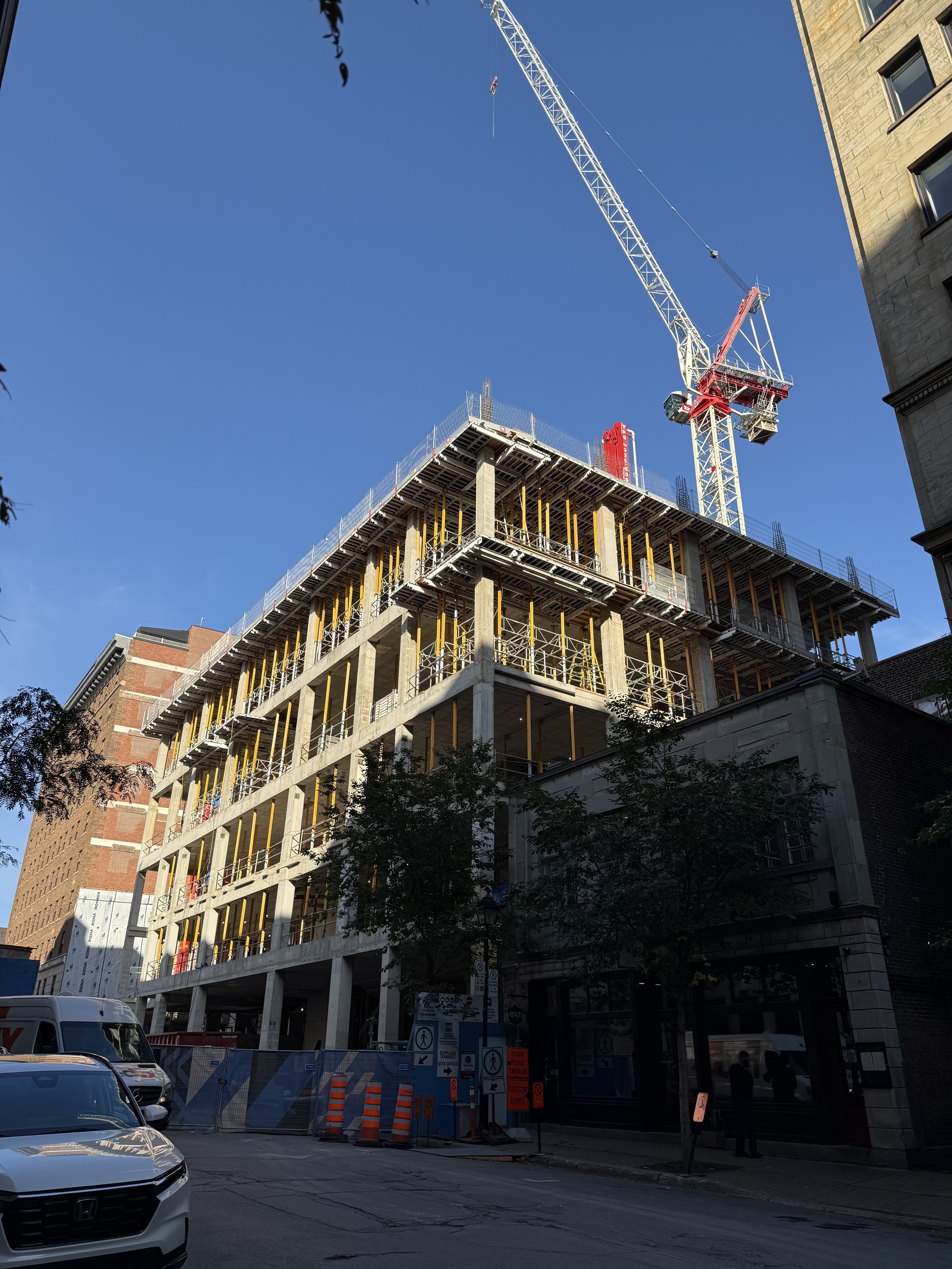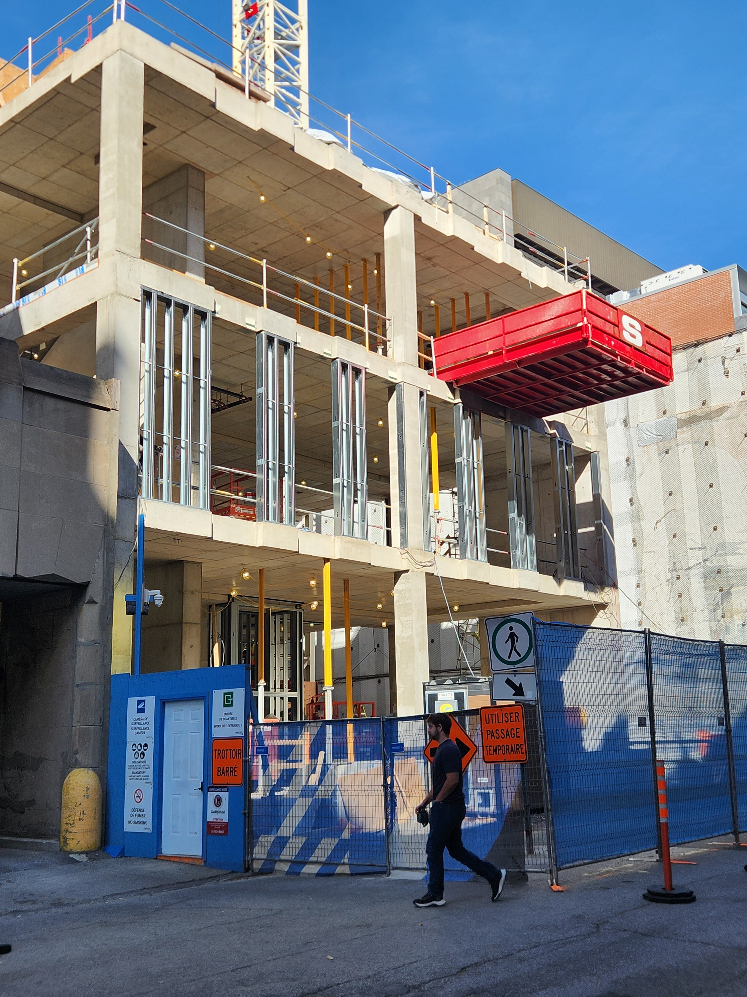 On vient de poser les escaliers de béton intérieurs. Je crois que l’espace vide à l’est, là où se trouve la grue, sera le hall d’entrée surdimentionné.