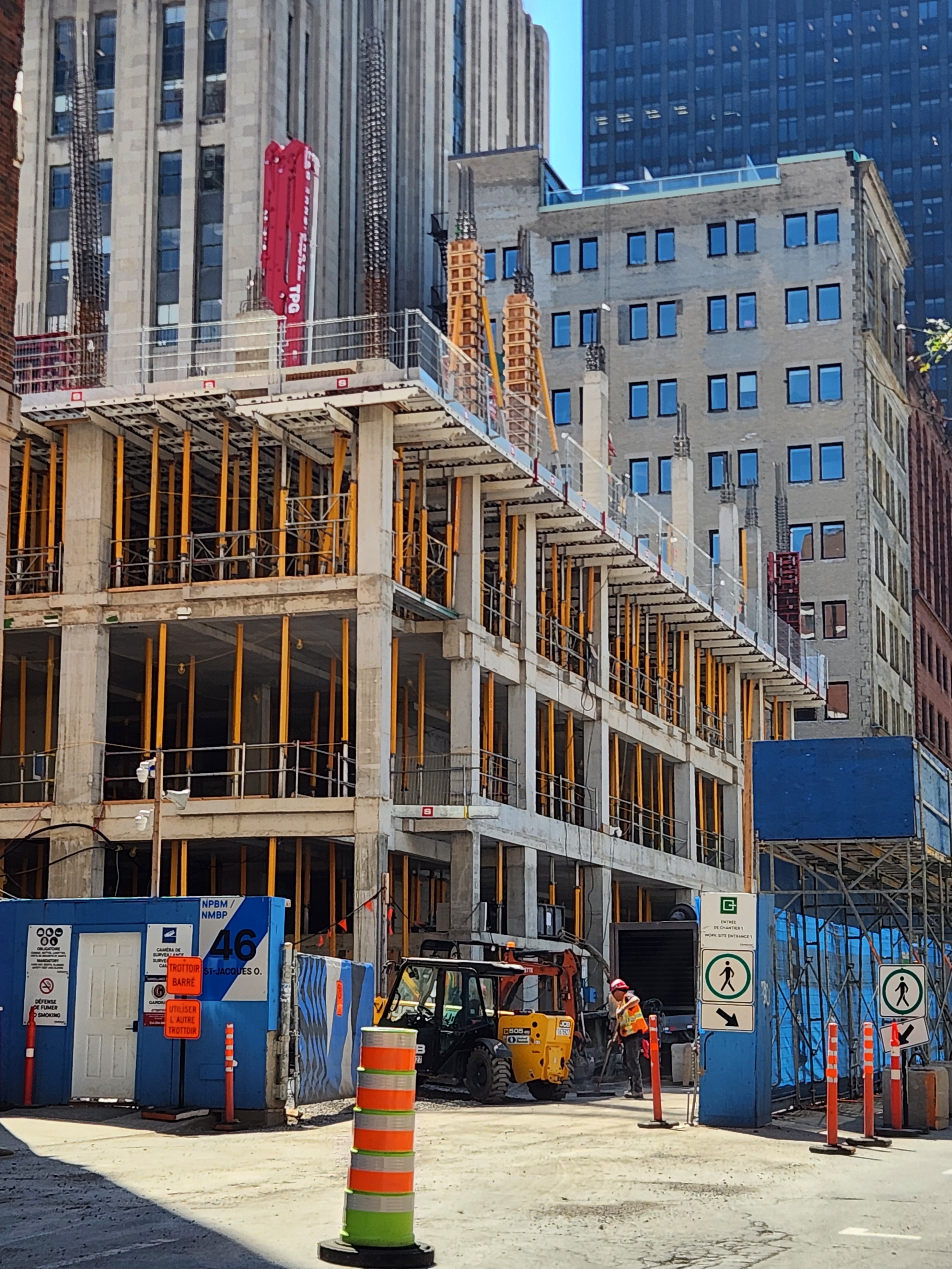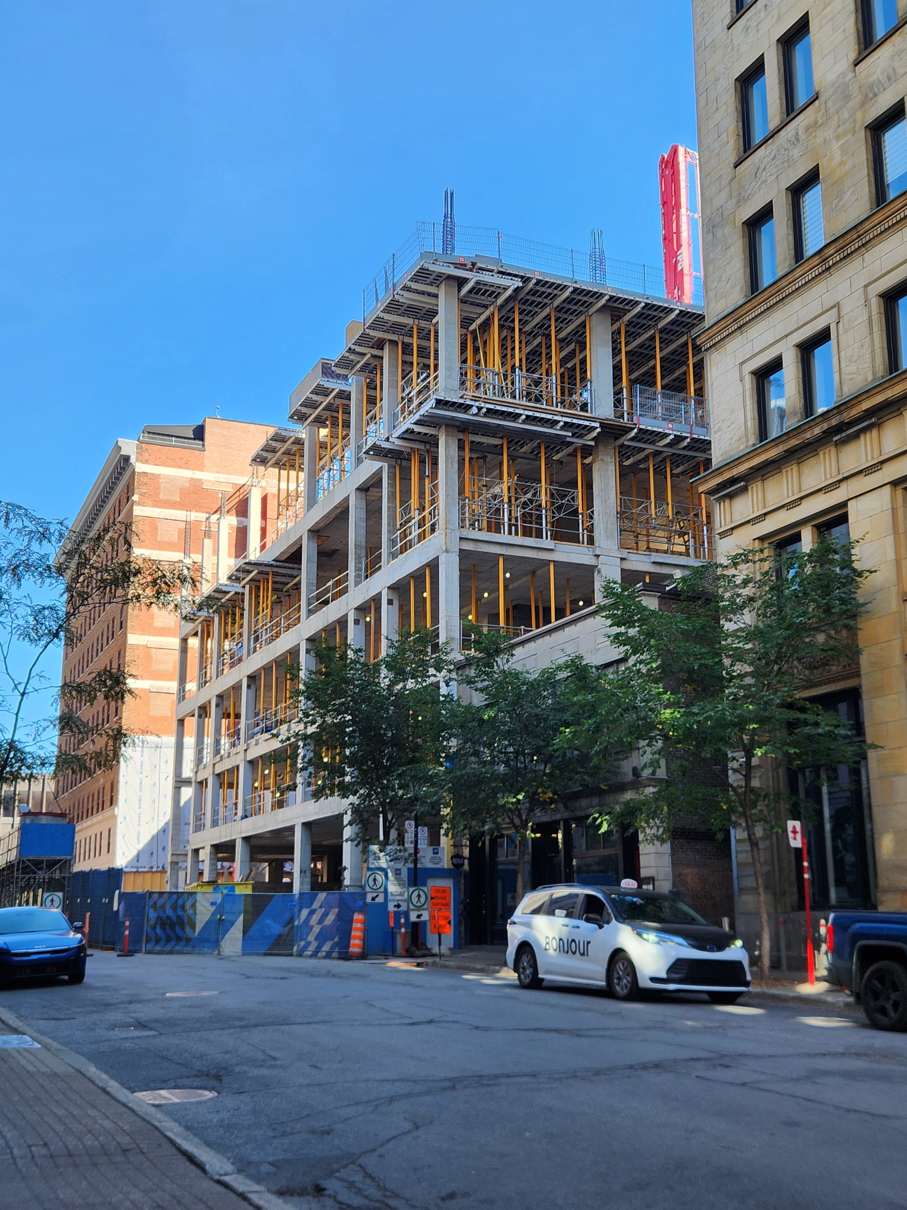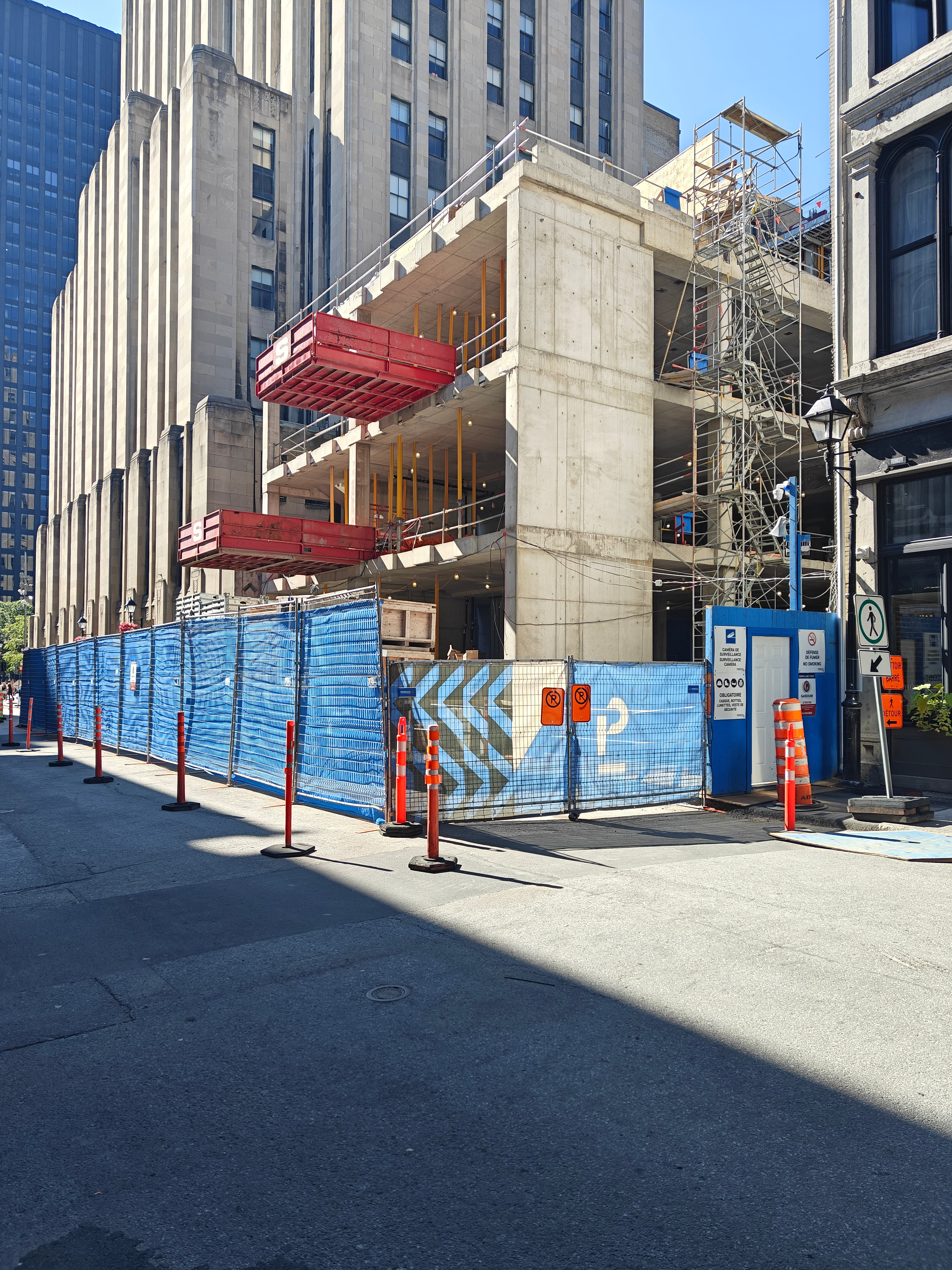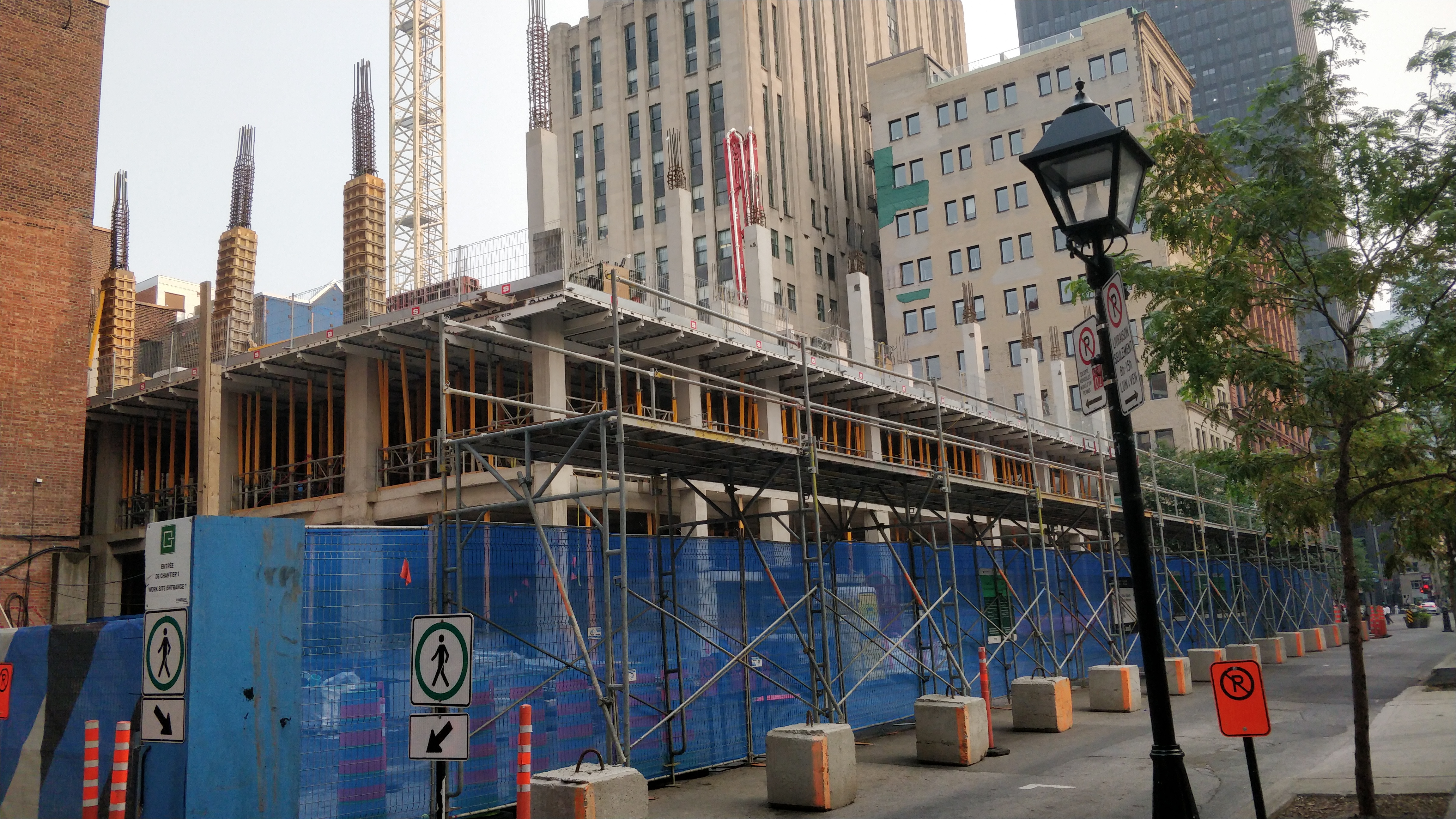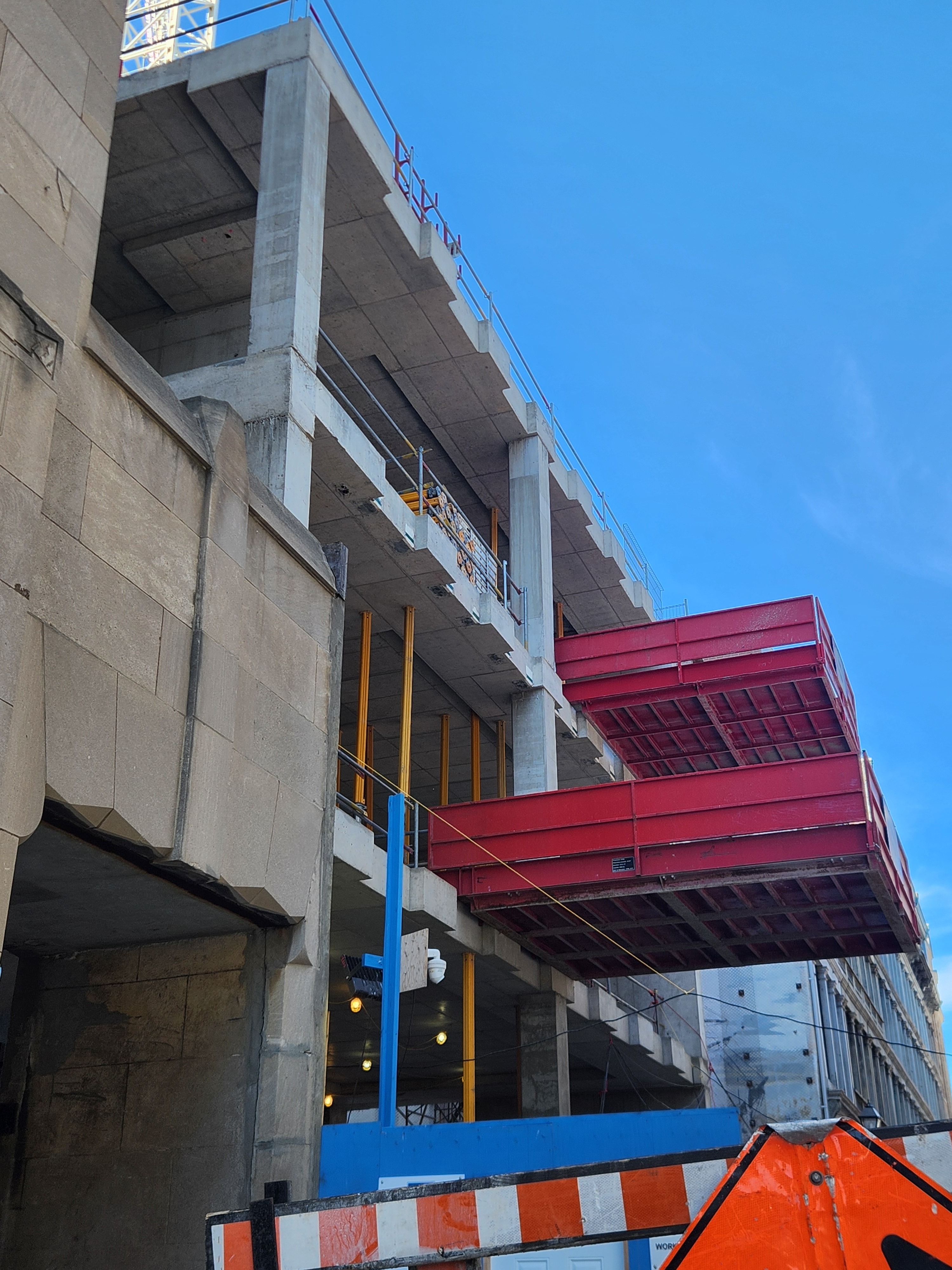 On vient de poser les escaliers de béton intérieurs. Je crois que l’espace vide à l’est, là où se trouve la grue, sera le hall d’entrée surdimentionné.