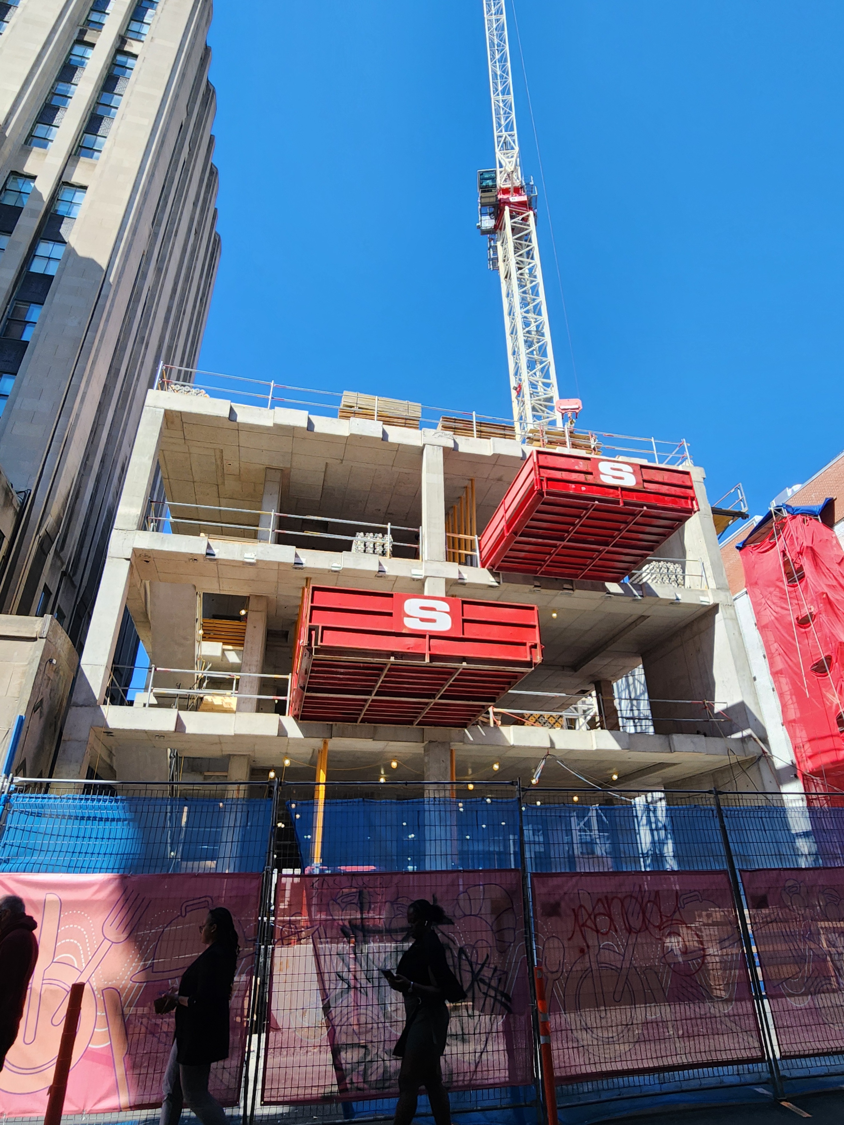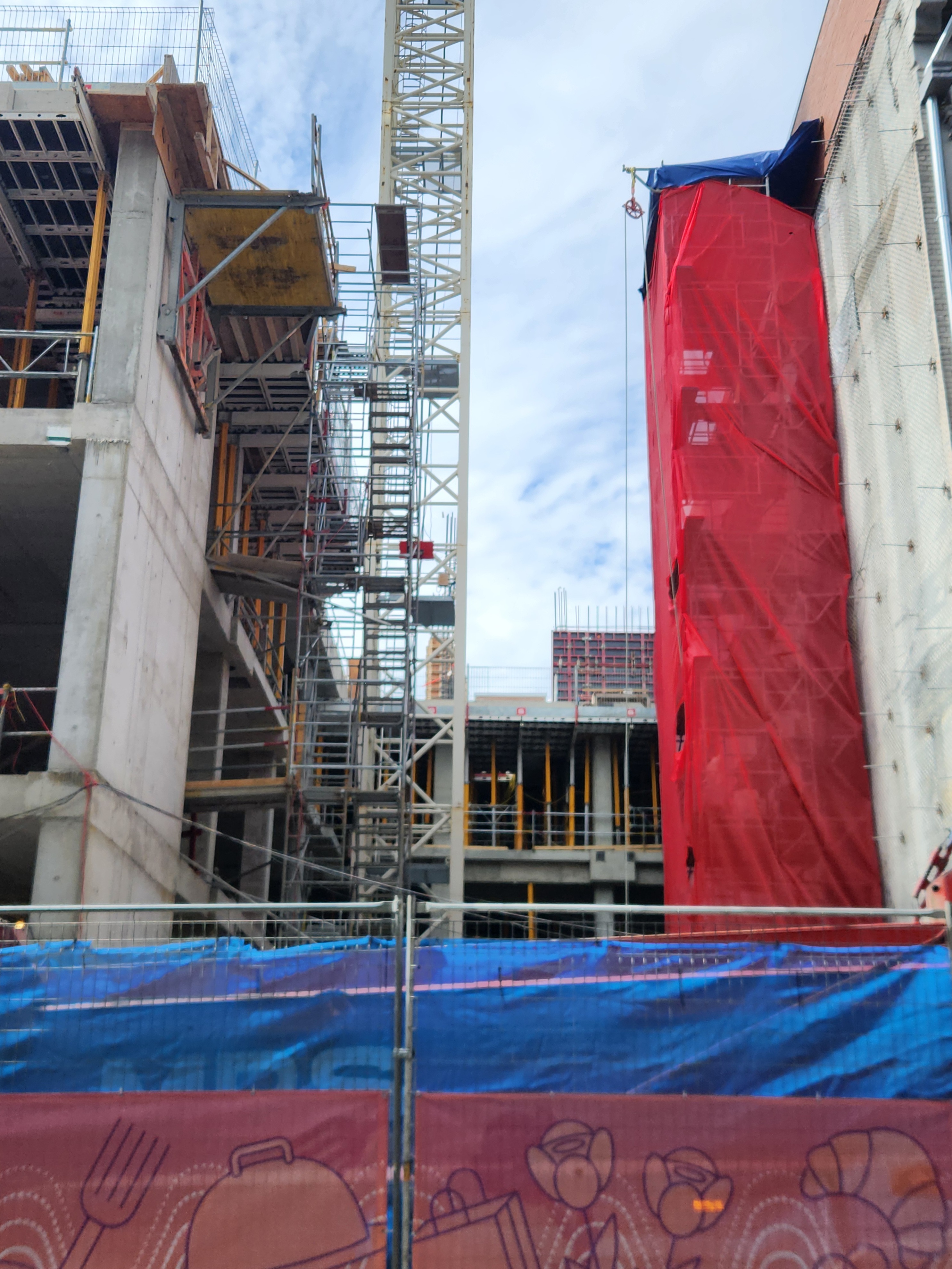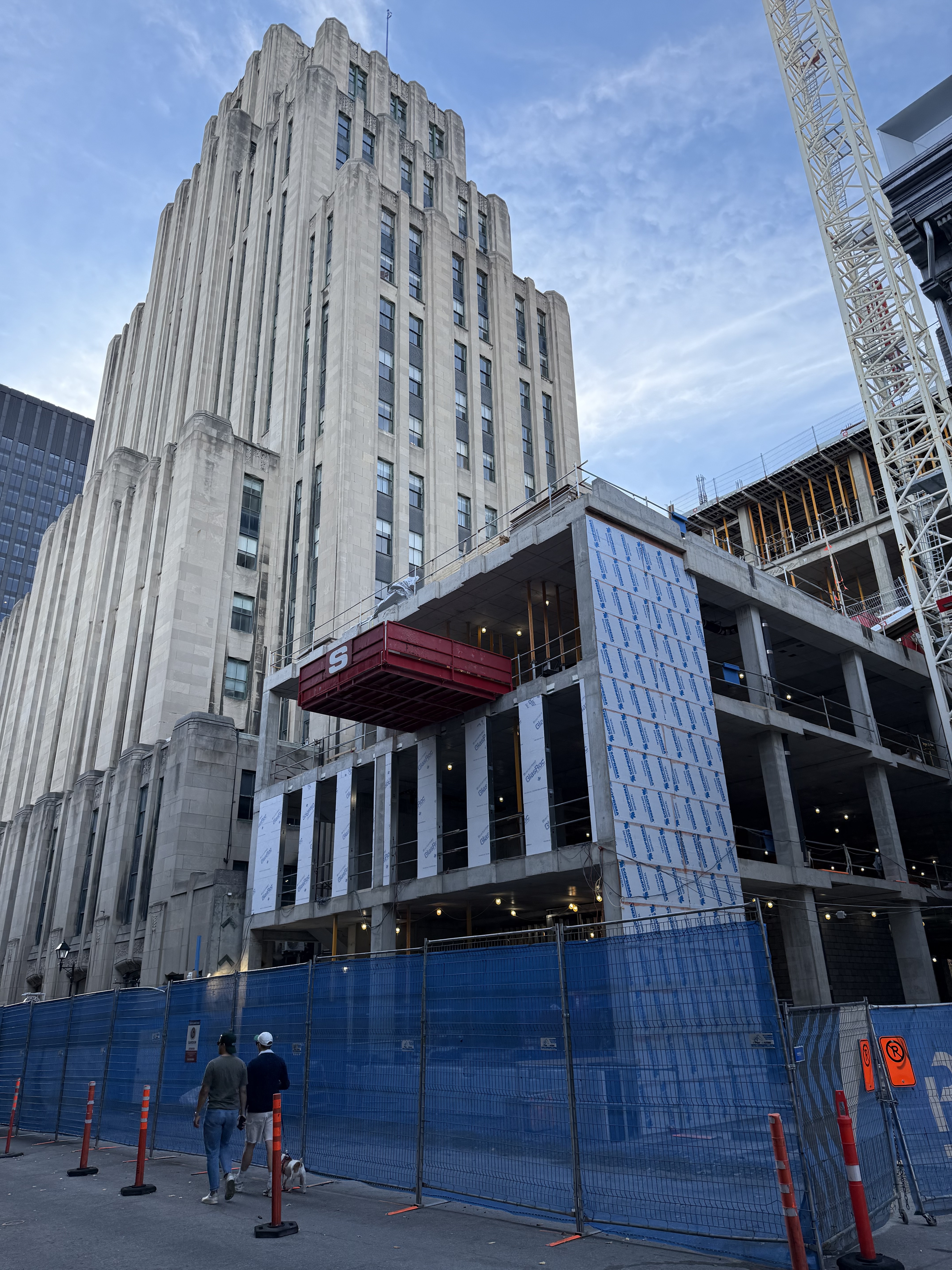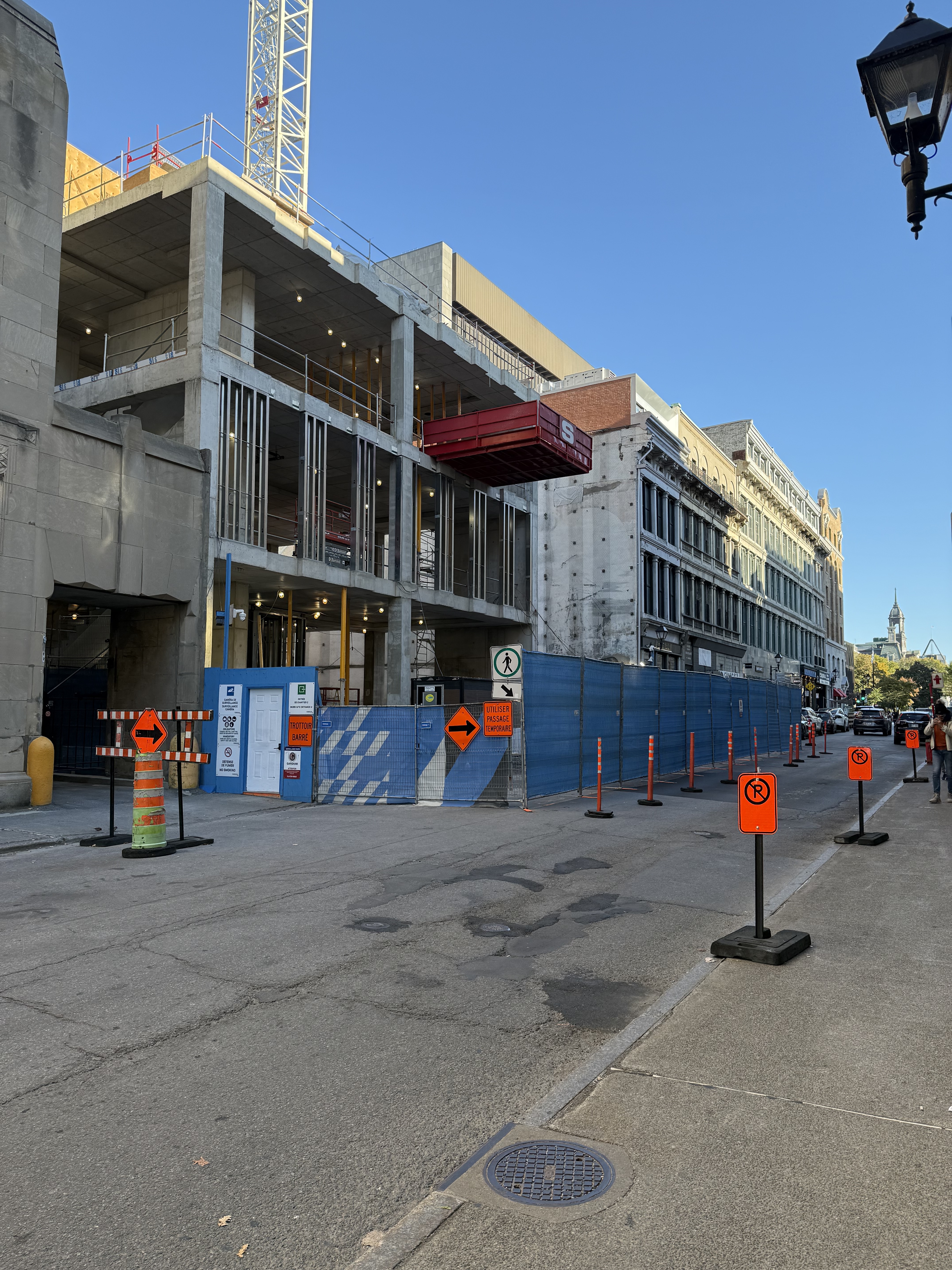 On vient de poser les escaliers de béton intérieurs. Je crois que l’espace vide à l’est, là où se trouve la grue, sera le hall d’entrée surdimentionné.