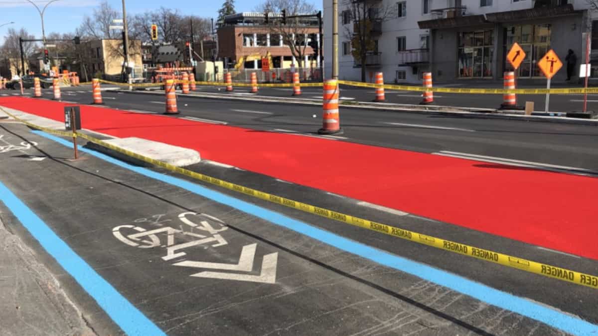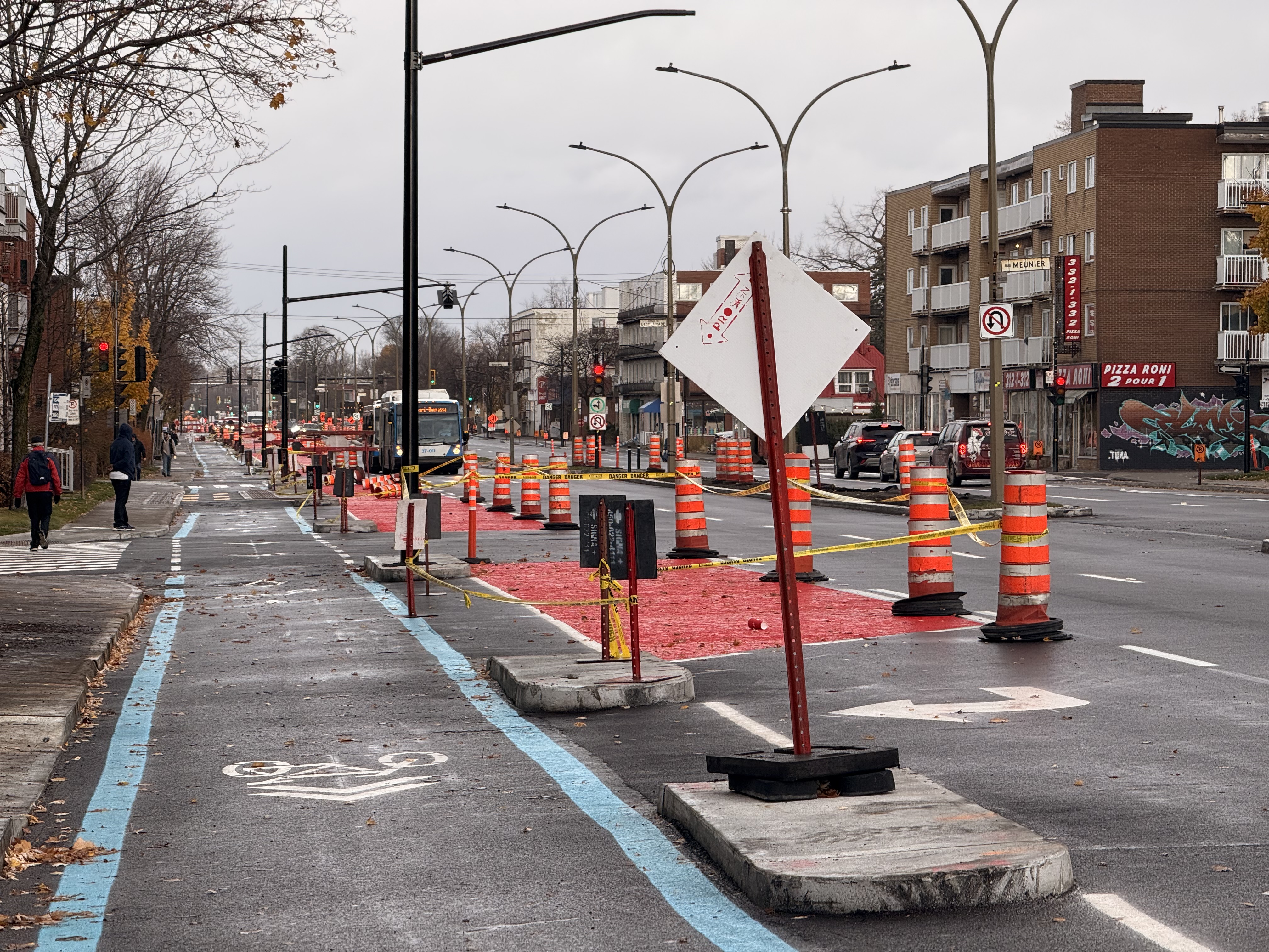 Dans les voies du SRB Pie-IX, le rouge est incrusté dans l’asphalte. Ici ça semble simplement peinturé. Ce n’est pas le même pari.