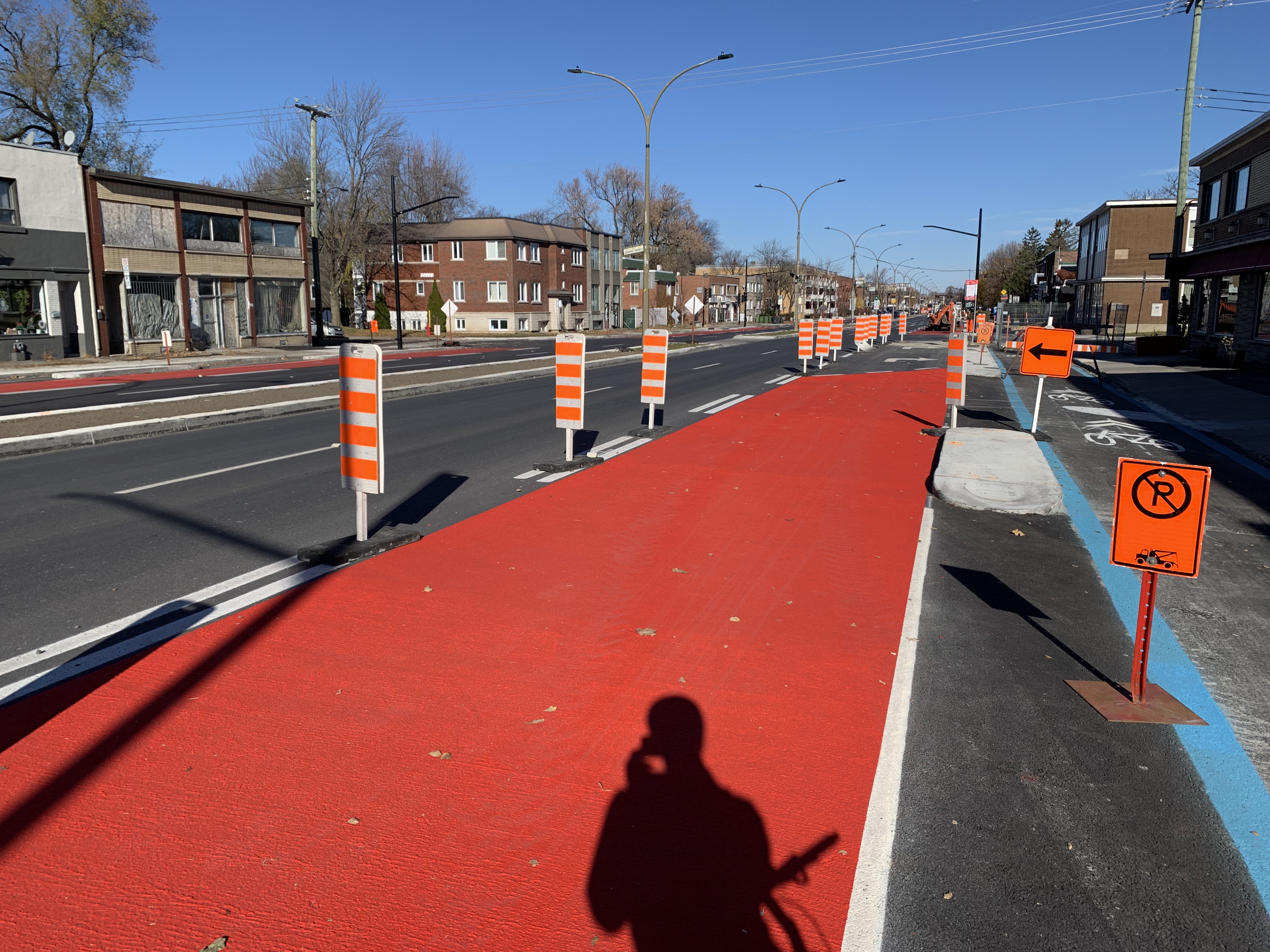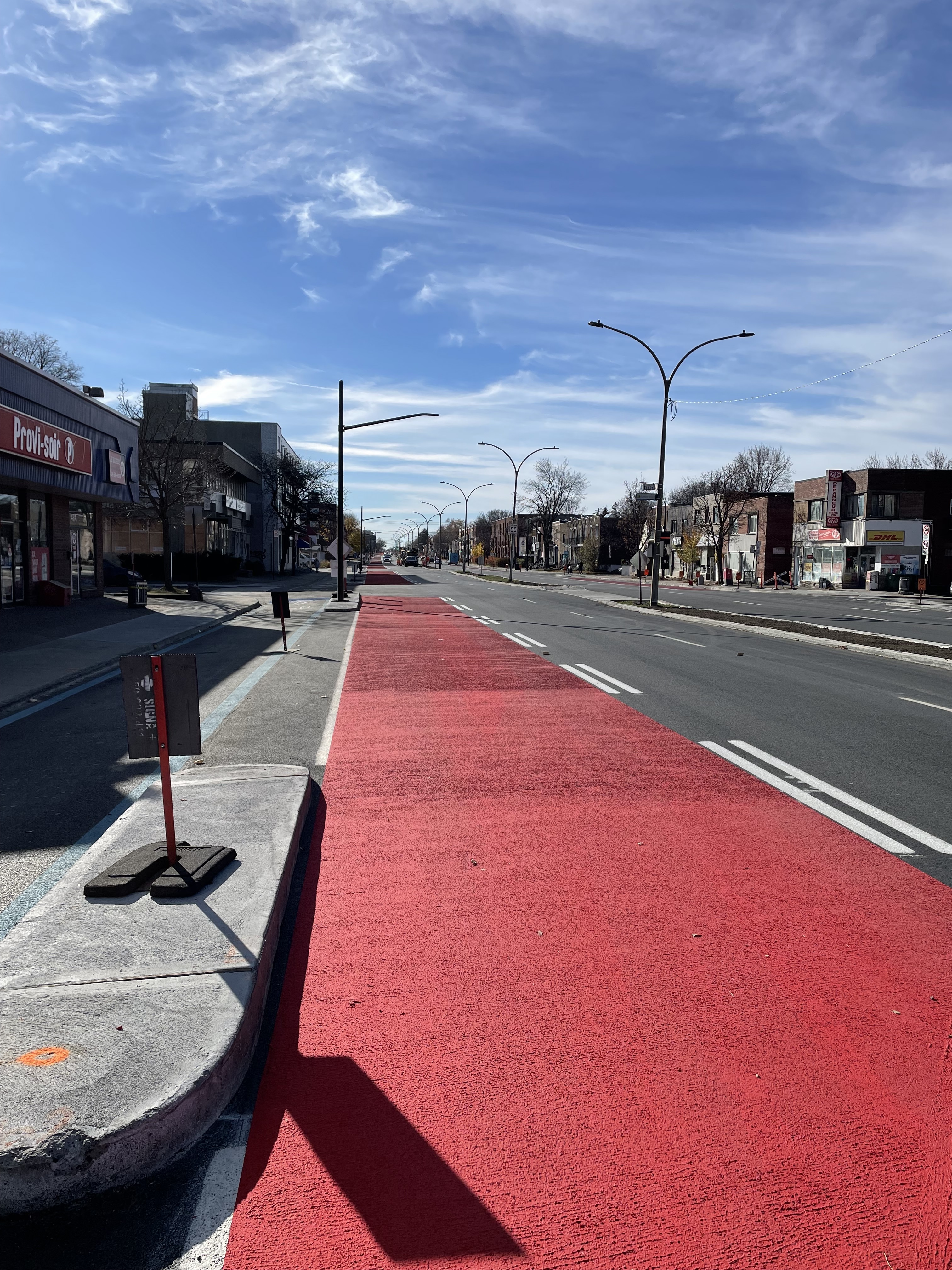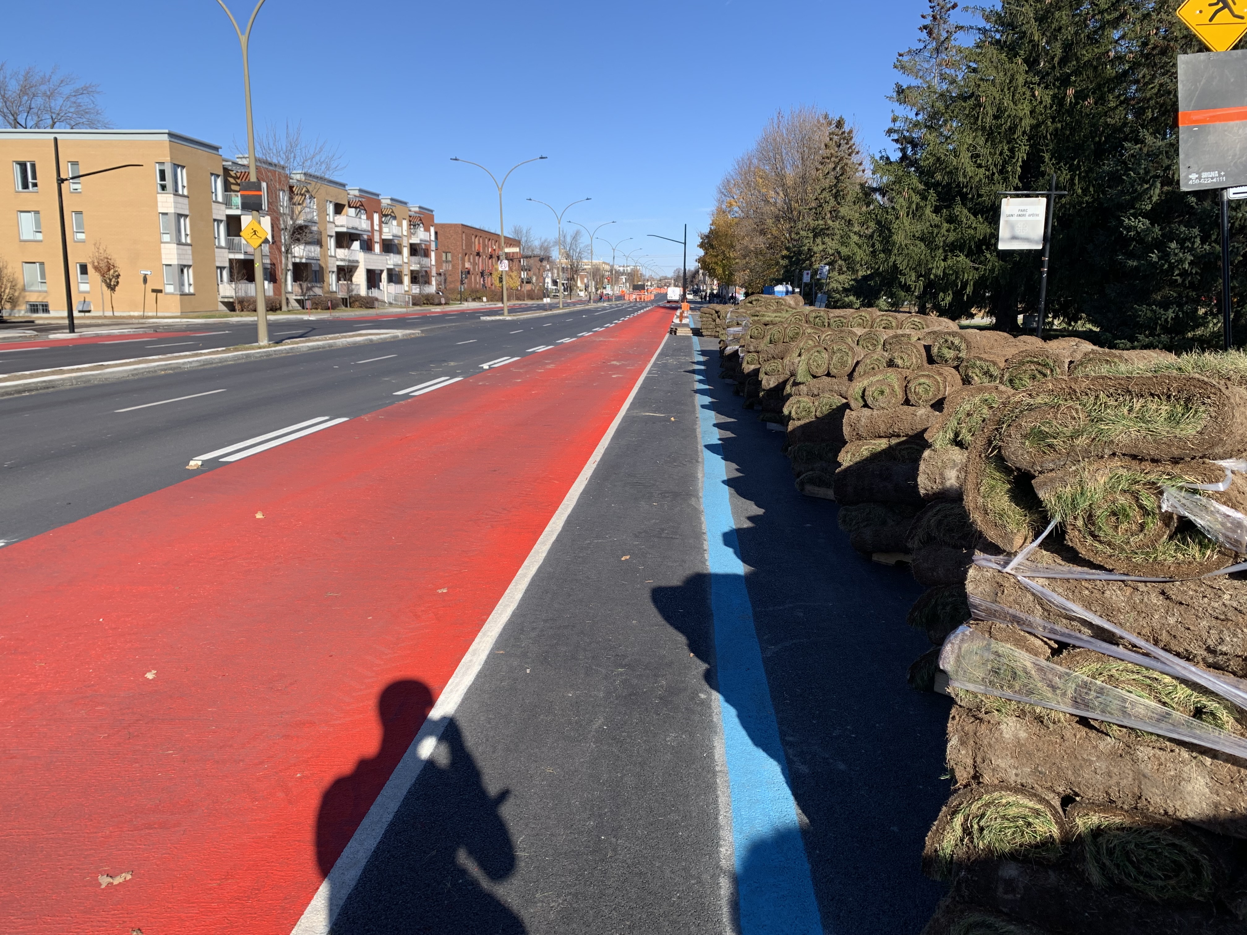 Petite visite du matin: Comme mentionné déjà, l’entièreté de la VR autant du côté sud que nord a été peinte en thermoplastique rouge entre Saint-Laurent et Tanguay à l’exception des voies de virage.