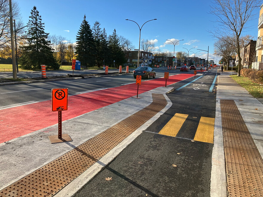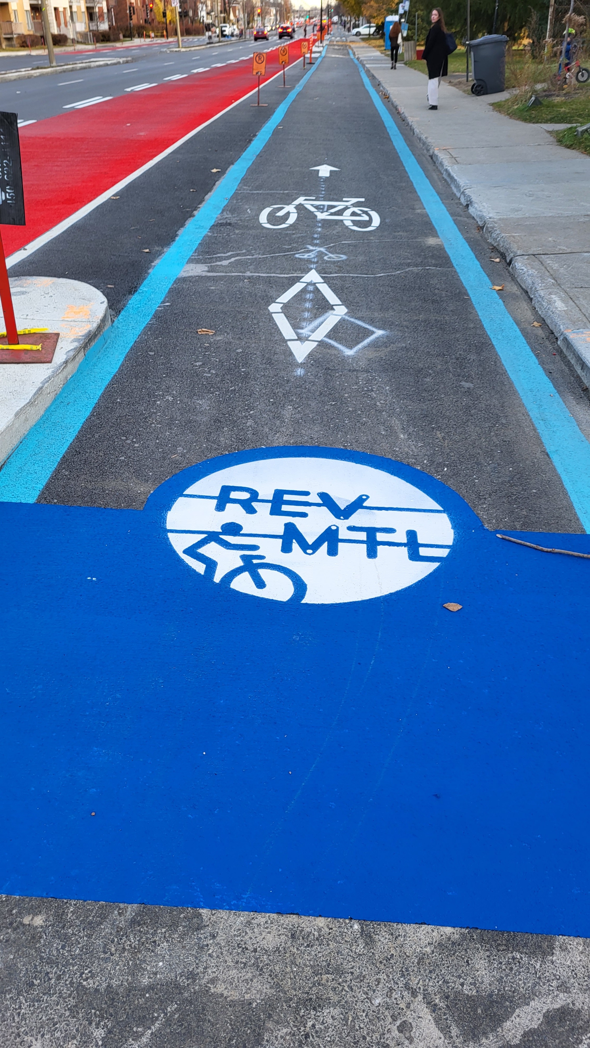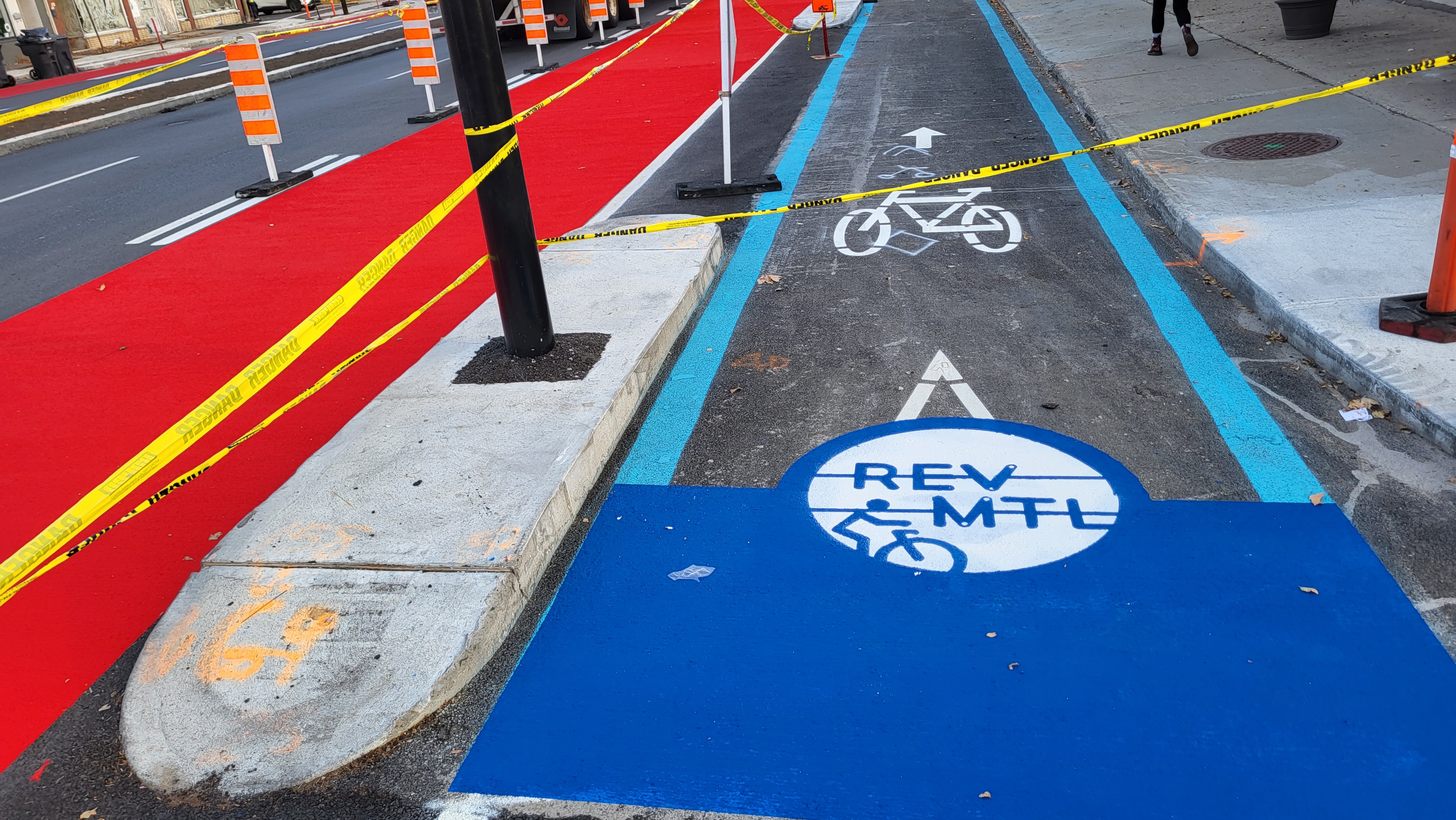 Petite visite du matin: Comme mentionné déjà, l’entièreté de la VR autant du côté sud que nord a été peinte en thermoplastique rouge entre Saint-Laurent et Tanguay à l’exception des voies de virage.