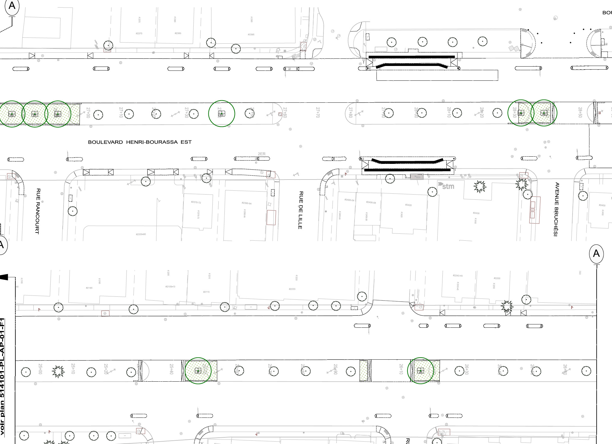 Plantation d’arbres supplémentaires dans la section centrale avec fermeture de passages Nord-Sud.