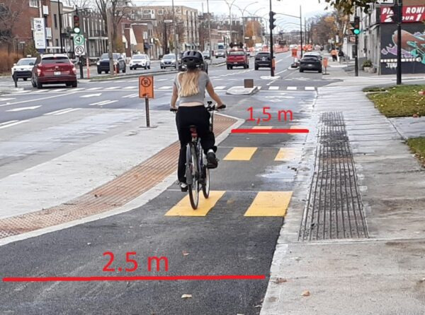 Mon seul commentaire est qu’il manque de verdure. La Ville aurait pu profiter de la largeur des bandes de béton qui séparent la route de la piste cyclable pour planter massivement des arbres, ou à tout le moins des arbustes, tout le long. Ça aurait fait un écran végétal entre les voitures et la piste cyclable.