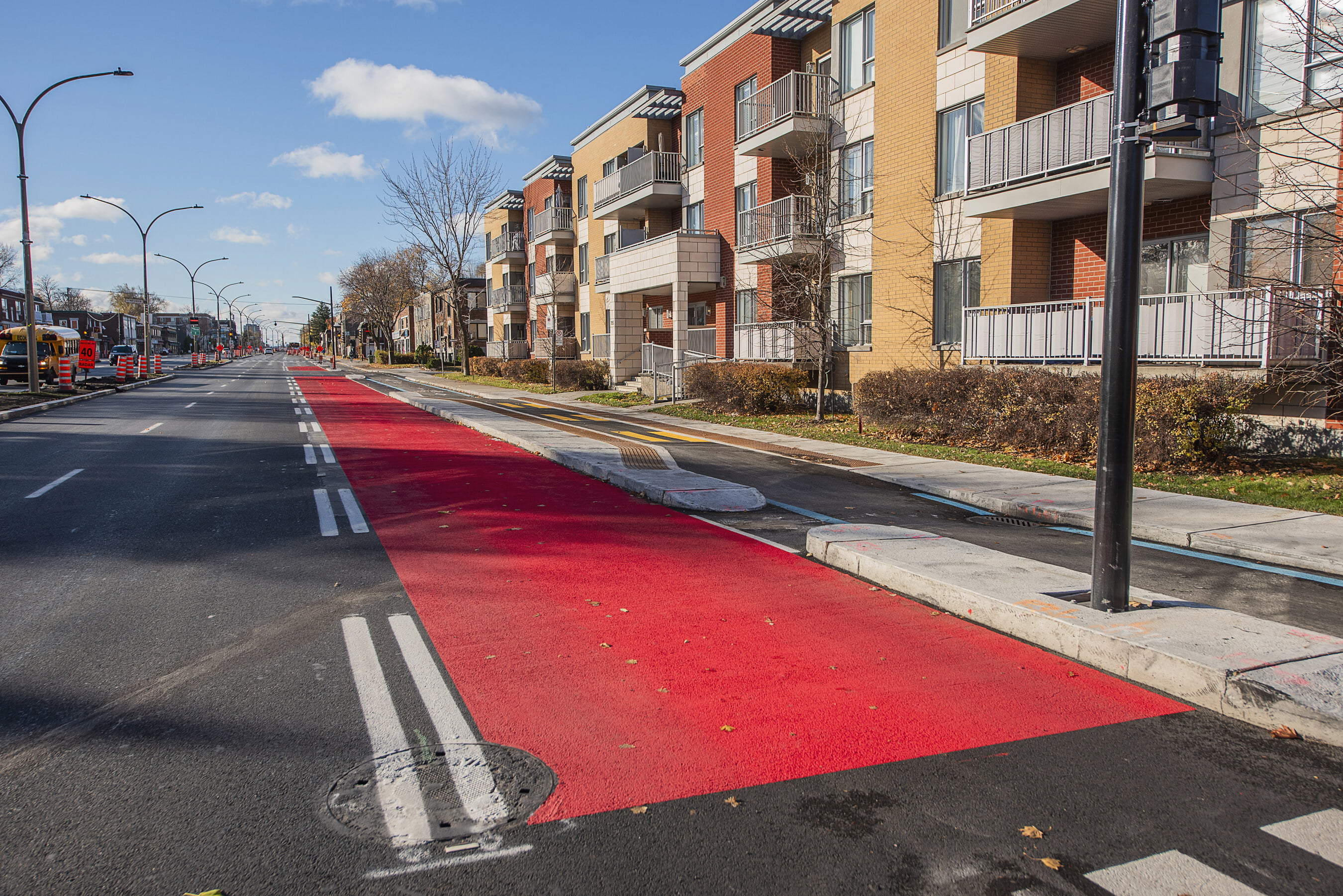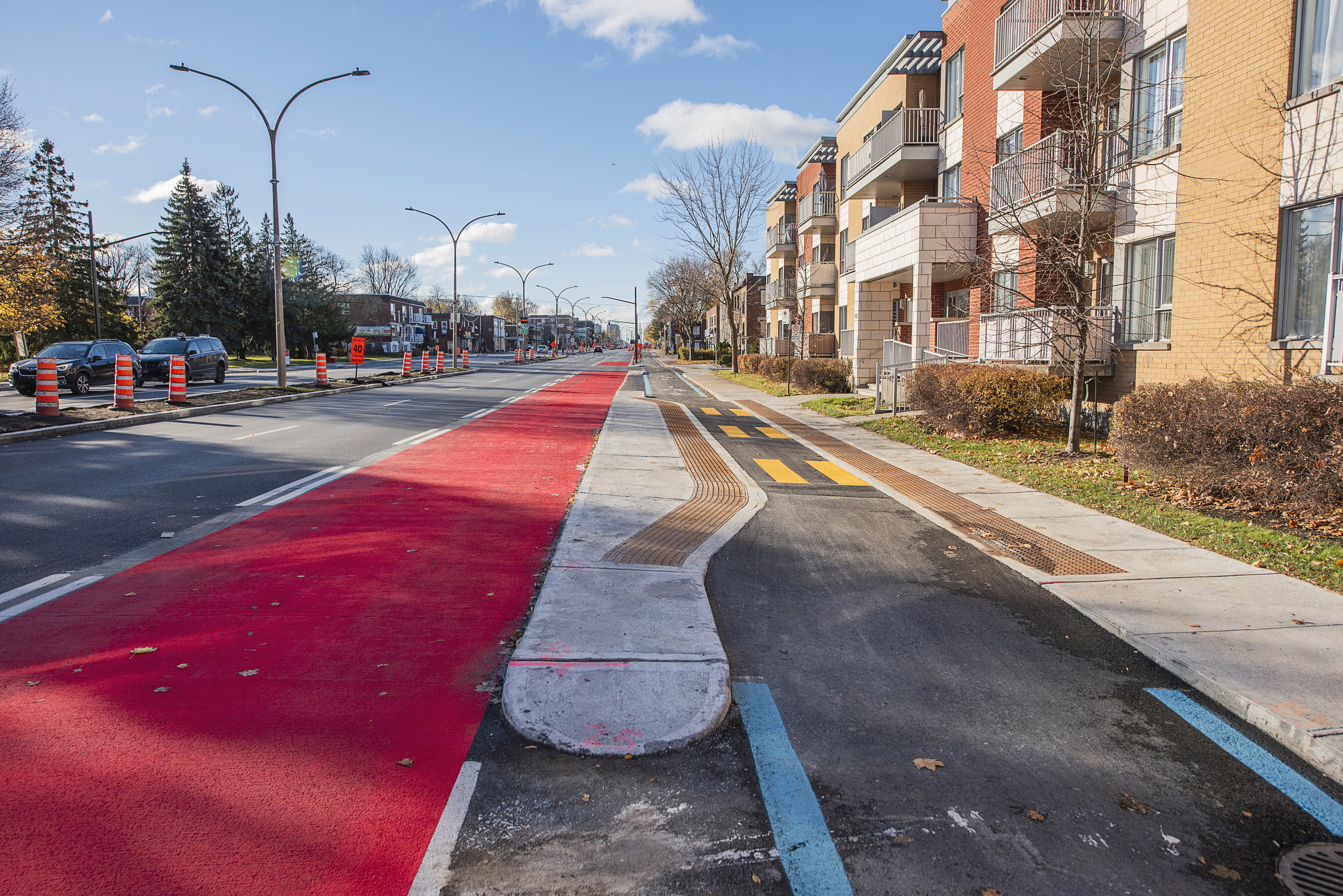 La plantation d’arbres, l’ajout de mobilier urbain, ainsi que l’asphaltage et le marquage permanent du tronçon entre le boulevard Saint-Laurent et la rue Lajeunesse se feront pour leur part au printemps.