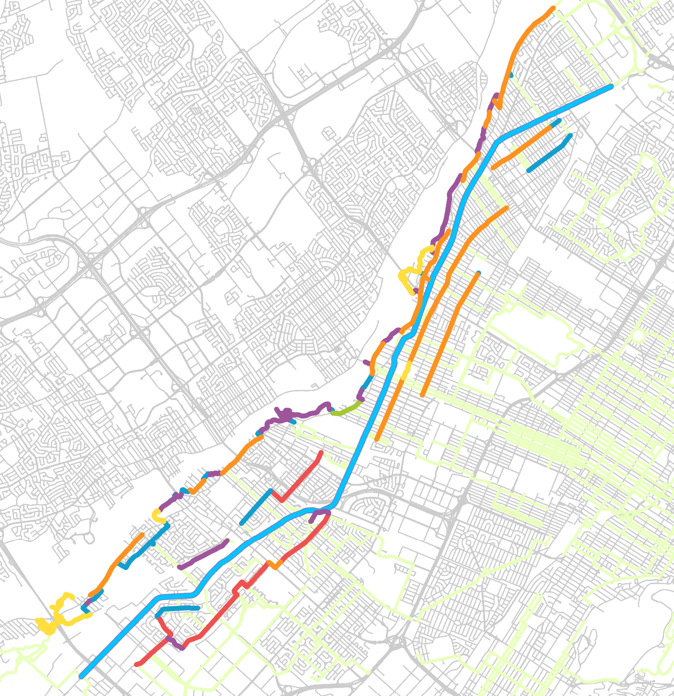 Pour l’instant j’ai ciblé 8 axes cyclables partiellement parallèles au REV Henri-Bourassa (voir photo ci-dessous).