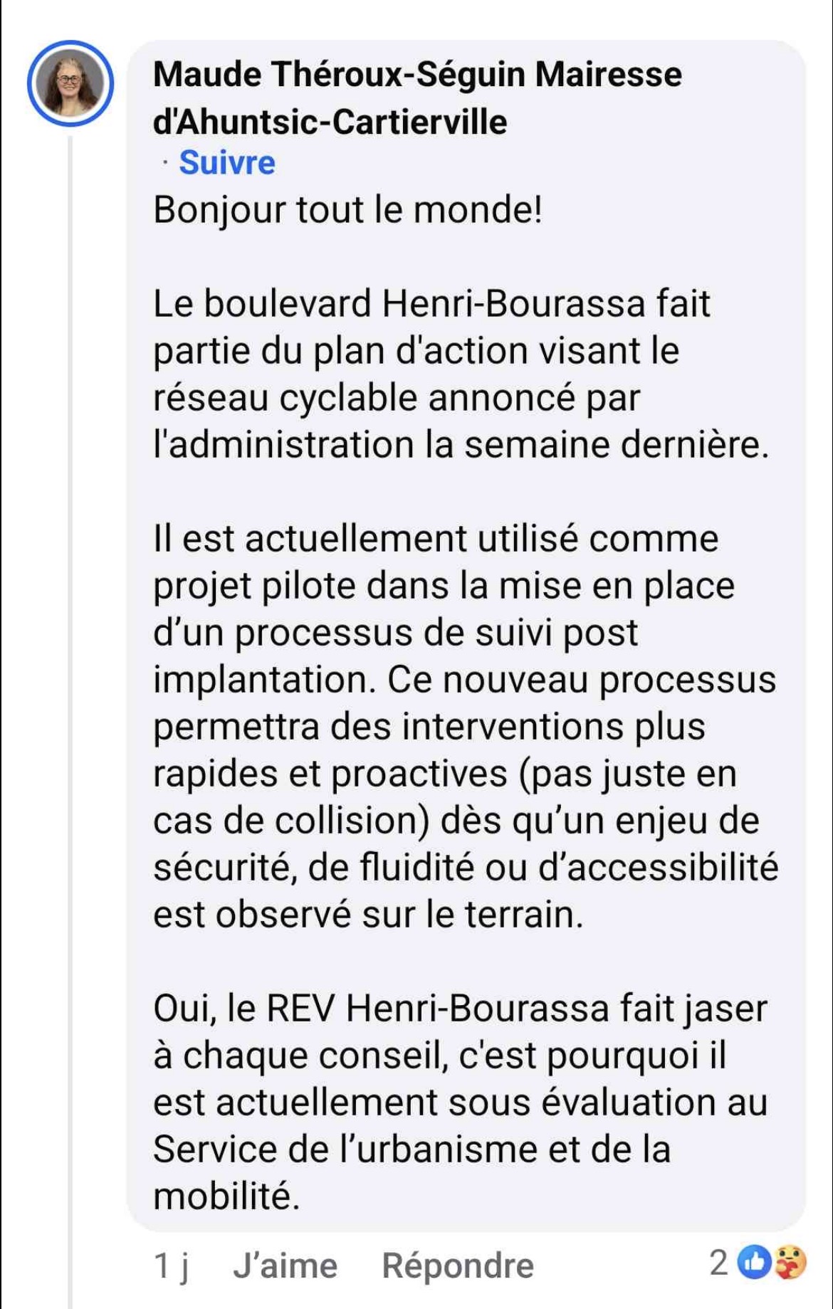 Si vous dites qu’il faut encourager le transport collectif, parce que c’est vraiment ça qui fait une différence et pas le vélo, j’espère que vous serez de ceux à être outré si la mairie actuelle d’Ahuntsic-Cartierville remet le stationnement dans la voie réservée pour bus d’Henri-Bourassa.