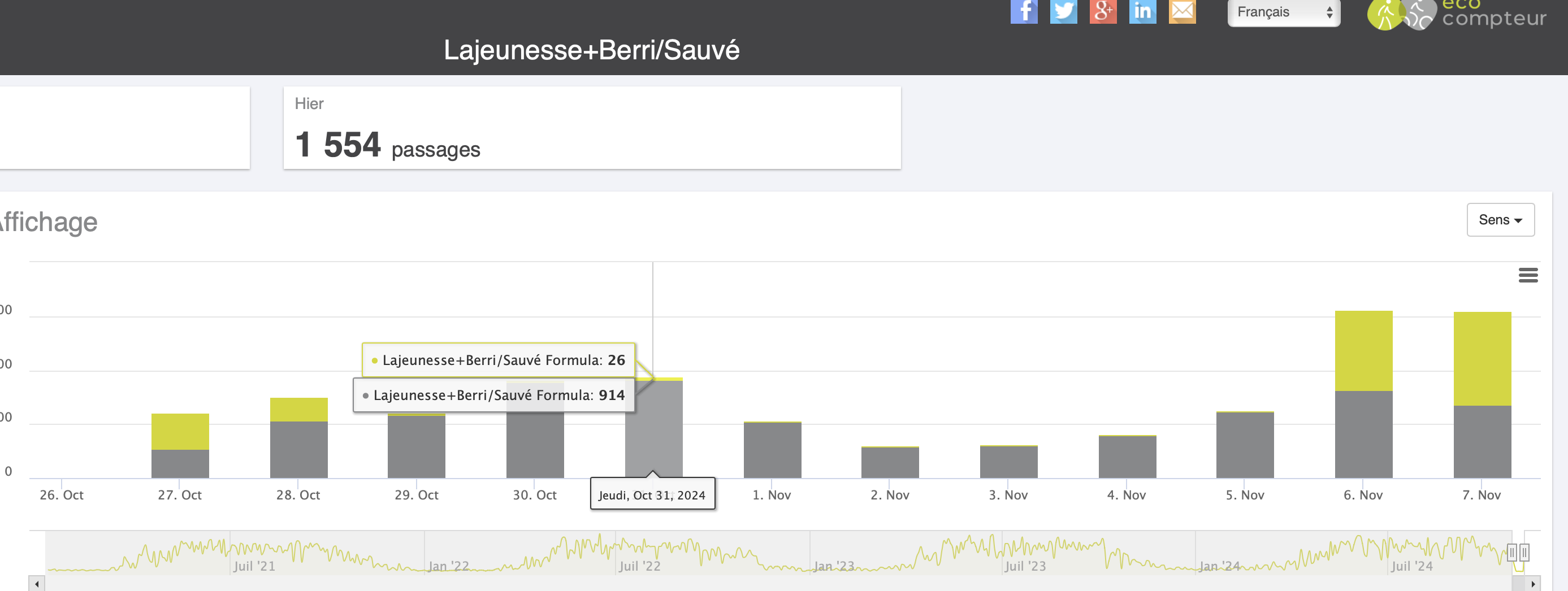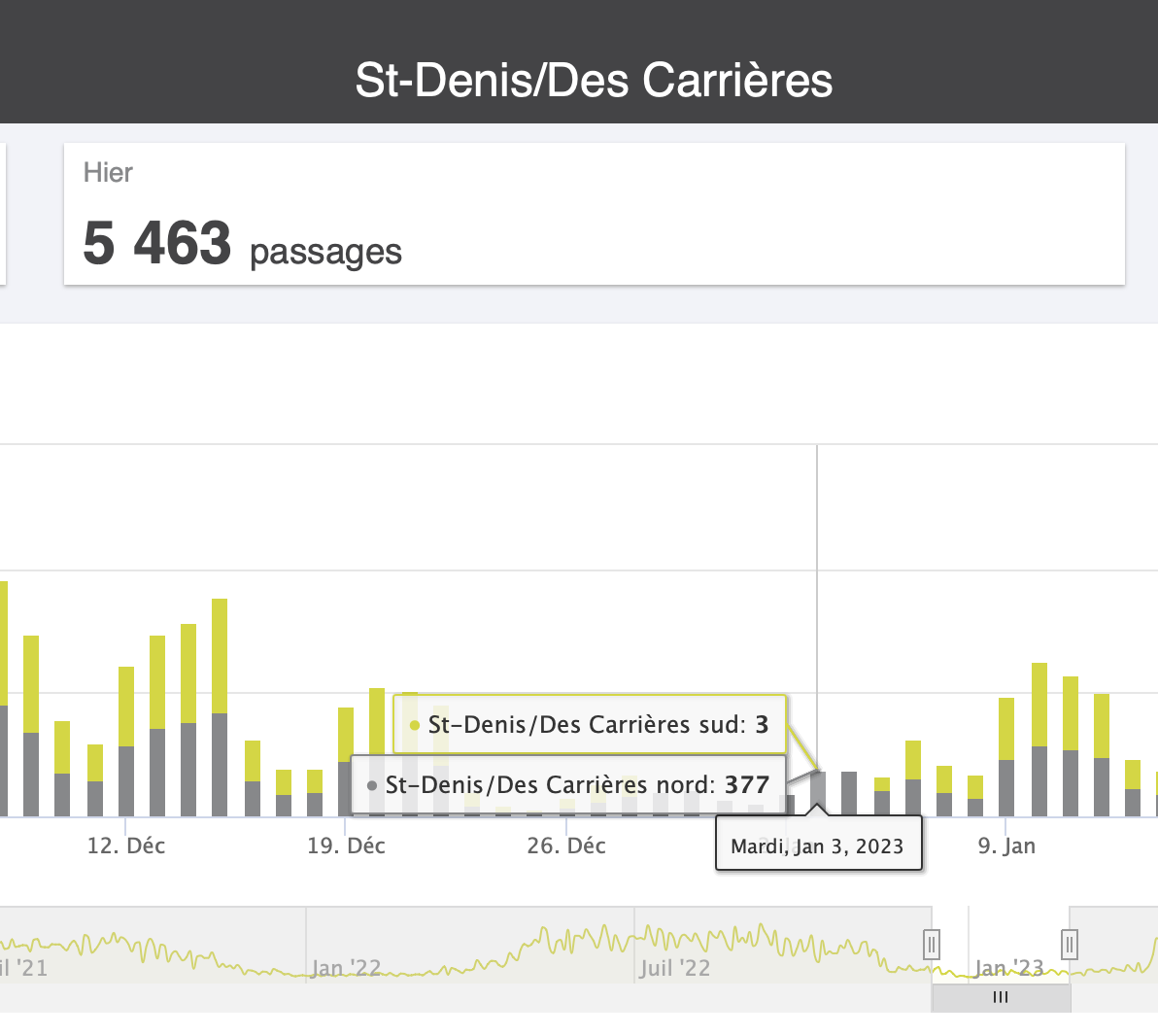 Pour savoir combien de gens vont en sens inverse, il faut attendre qu’un jour le compteur ne fonctionne pas d’un côté de la rue, l’autres compteur va te donner un certain nombre de comptage dans le sens inverse, assez petit : ça te donnerait le nombre de gens qui vont en sens inverse.