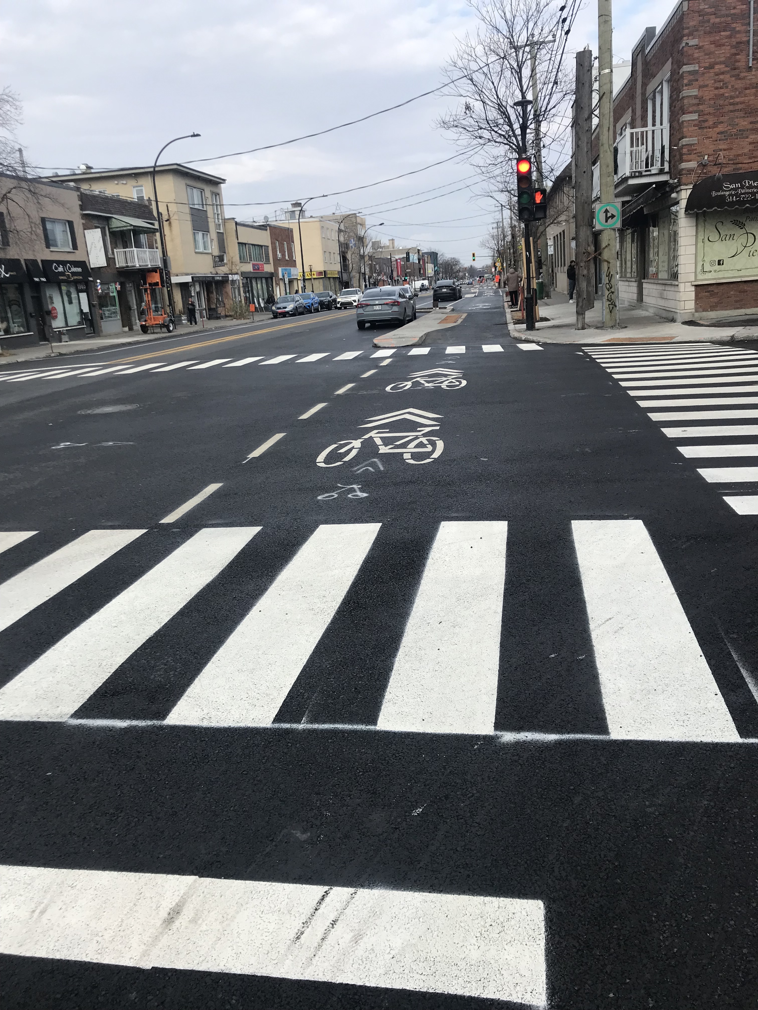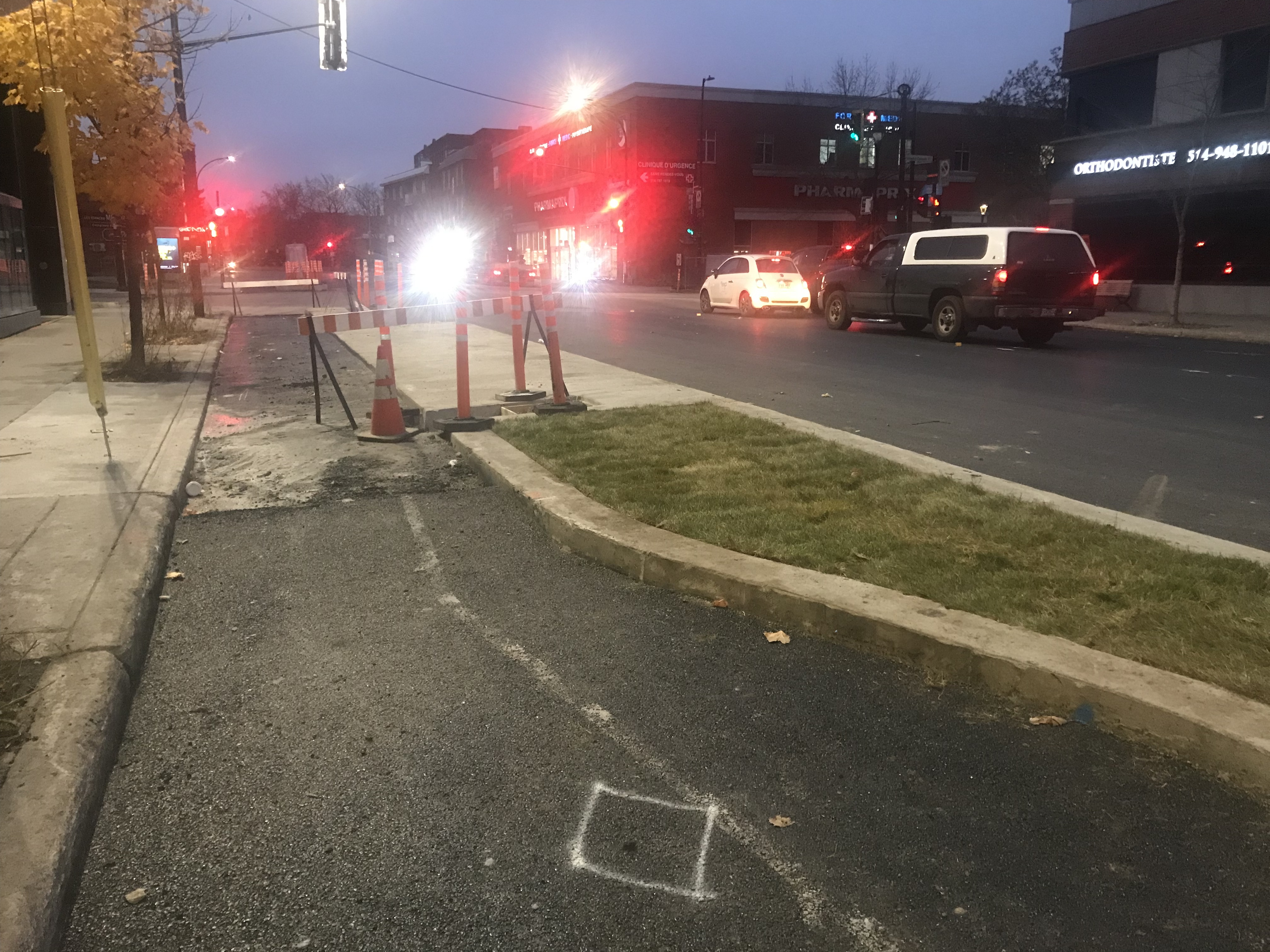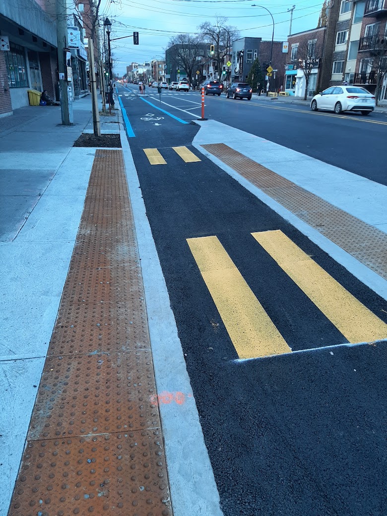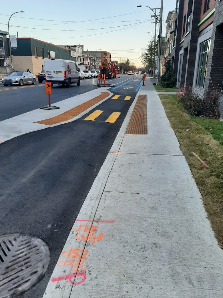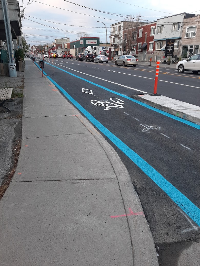 Je suis d’accord. Quand je compare les aménagements «temporaires» (comme à Saint-Denis / Berri) aux aménagements permanents, je préfère les aménagements temporaires. Les jardiniers et les tampons donnent de bon protection. Sur Pierre-de Coubertin ou Peel les autos peuvent sauter le bordure trop facilement pour que je me sente en sécurité, et il n’y a aucun espace de «buffer».