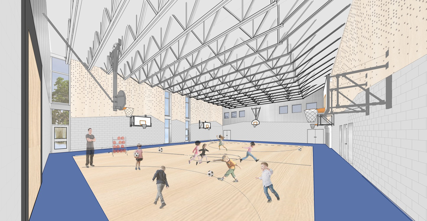 - Agrandissement majeur de 3 385 m2 sur 3 niveaux afin de minimiser l’empreinte au sol et d’offrir un plus grand espace extérieur, où des espaces de jeux, des aires de détente et des espaces verts sont prévus. On y retrouve également des travaux de réaménagement intérieur important dans la partie existante afin d’arrimer les deux interventions en une école unifiée. La réussite des aménagements de ce projet repose sur des circulations fluides permettant un accès rapide aux locaux et aux étages, peu importe où les usagers se trouvent dans le bâtiment. Un corridor lien sous forme de rampe, afin de combler la différence de niveau entre les deux étages, a été conçu de façon à unir l’existant avec le nouveau. Situé seulement au 2e étage, il traverse dans la partie haute des dépôts du gymnase sans encombrer le reste de l’aire de plancher.