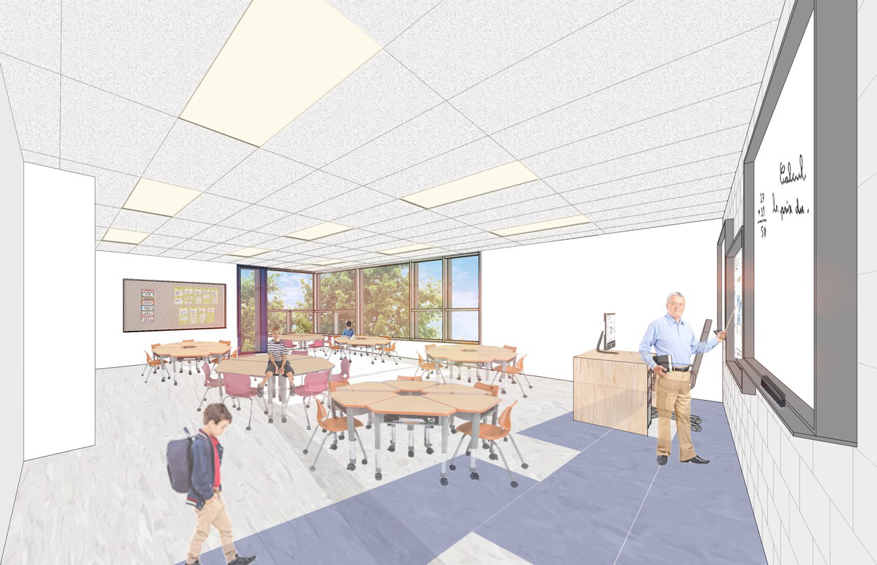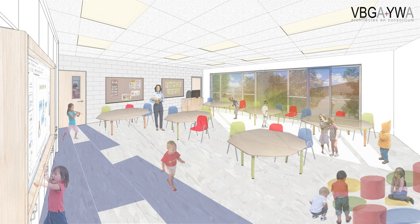 Un des principaux enjeux du projet fût de concevoir un agrandissement sans diminuer considérablement la superficie de la cour d’école. Ce dernier comporte l’ajout de 5 classes régulières, de 10 classes de maternelle, d’une salle polyvalente et d’un gymnase double. De plus, le bâtiment présente plusieurs mesures écoresponsables.
