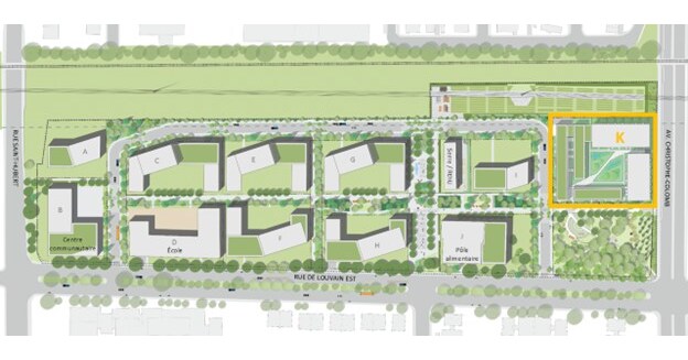 L’immeuble à venir sera situé dans la partie est du site de 7,7 hectares de l’ancienne cour de voirie de la Ville de Montréal sur la rue Louvain Est entre la rue Saint-Hubert à l’ouest et l’avenue Christophe-Colomb à l’est.