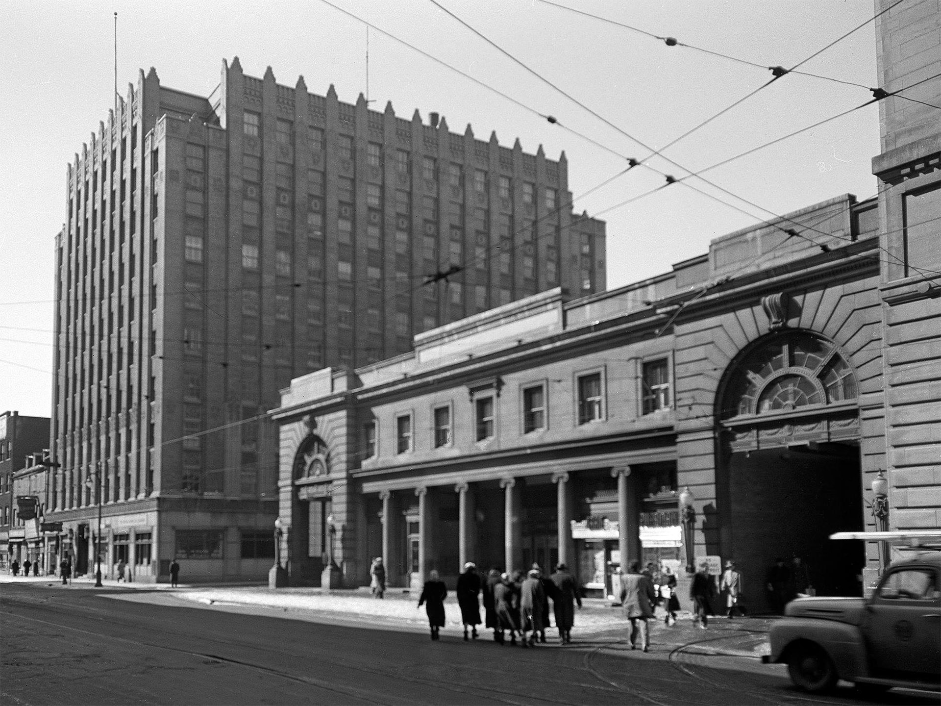 Ci-dessus, le siège de la CTM, avec au premier plan le Terminus Craig (1925, John Smith Archibald). Entre les deux bâtiments, la rue Coté, aujourd’hui disparue. Photo Archives de la STM.