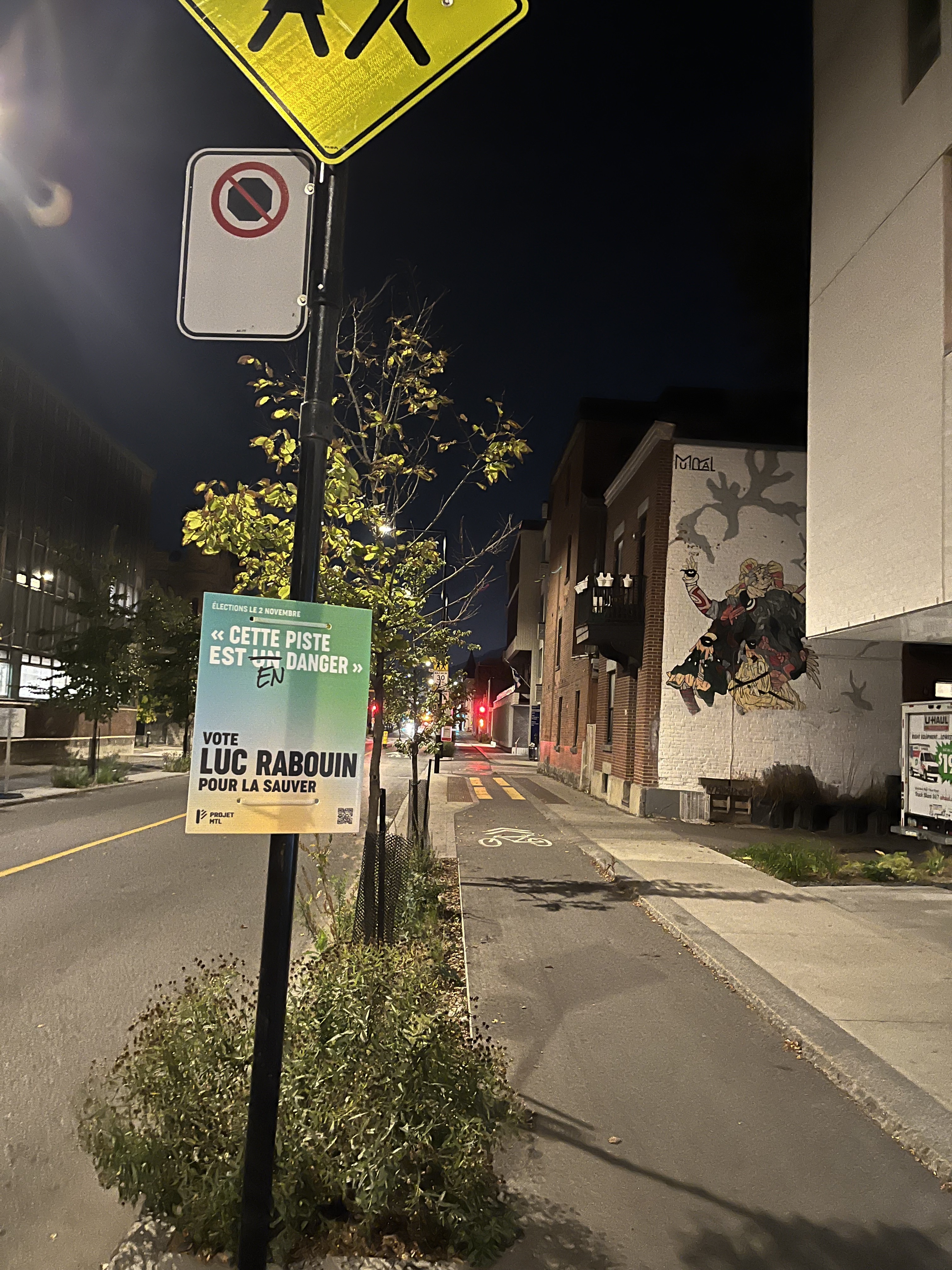 Avec ma fille et son amie hier soir, on a installé plus de 100 pancartes thématiques. On avait littéralement une usine de production ambulante : préparer les pancartes, installer, tirer, ajuster, couper le tiewrap et ainsi de suite. On a parcouru Laurier puis on a été donner du renfort sur Saint-Denis où, je pense, on était un peu trop nombreux à le faire. C’était littéralement une course!
