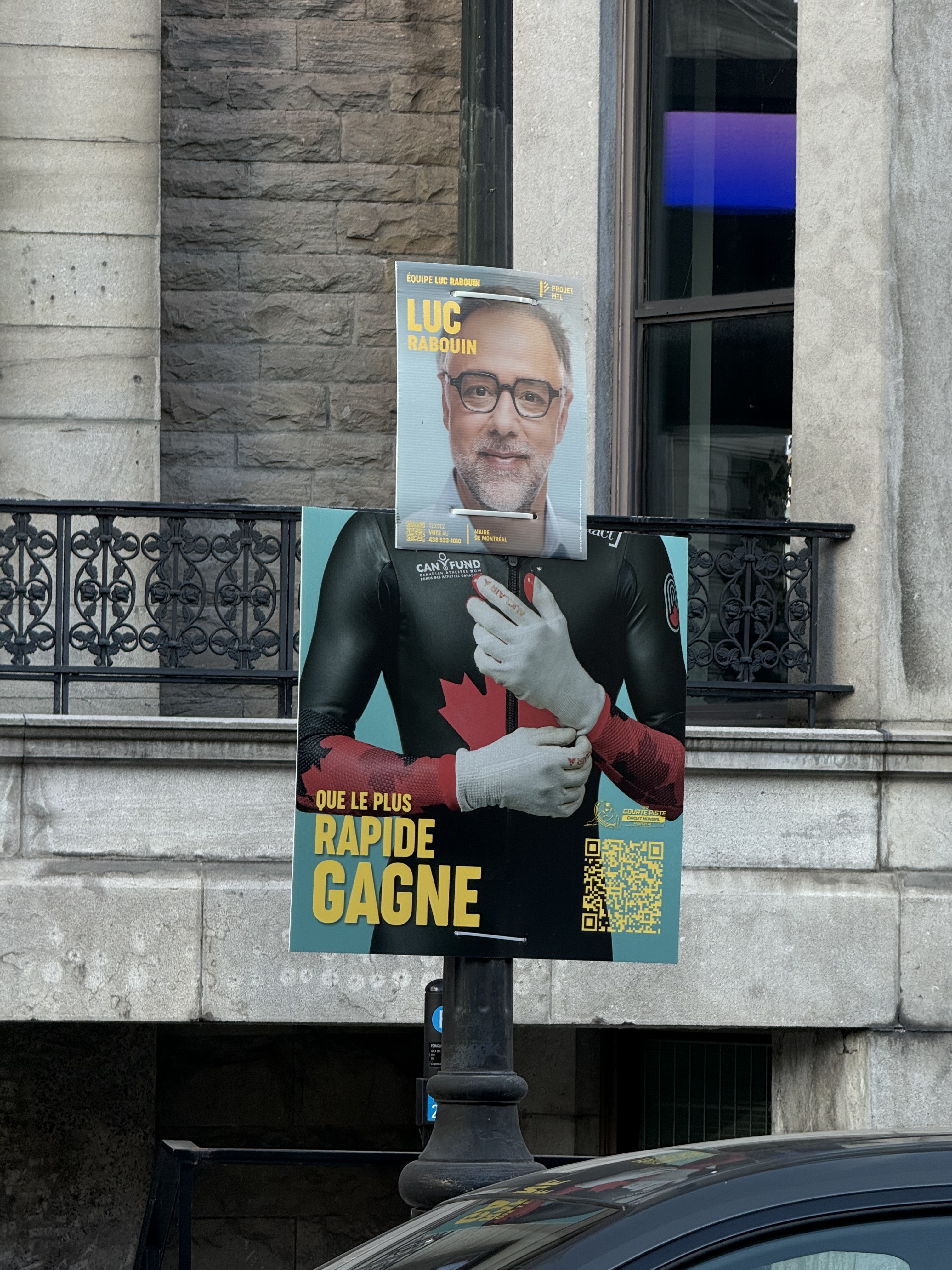 Non seulement l’affiche est dans le mauvais district, mais il est aussi interdit d’afficher des pancartes électorales dans ce secteur du Vieux (site patrimonial de Montréal)…