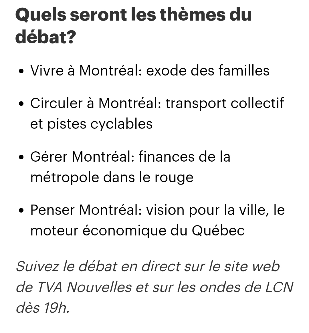 Mes impressions du débat: Soraya Martinez Ferrada, Craig Sauvé et Gilbert Thibodeau se sont démarqués. Luc Rabouin, assez effacé. Je suis agréablement surpris de la pugnacité de M. Sauvé, je comprends pourquoi plusieurs membres de Projet Montréal vont voter pour lui, dans un contexte où Transition et Projet se ressemblent. Gilbert Thibodeau, malgré le ton caricatural, représente assurément une frange de la population. Je ne suis pas surpris qu’il chauffe Transition et Projet. Au final, Mme Martinez Ferrada semble en contrôle au niveau du ton et des idées. Elle me donne l’impression d’être au bon endroit, au bon moment. Un duo (improbable) Ferrada-Sauvé serait franchement intéressant, d’autant plus que les deux semblaient sur la même longueur d’onde, avec chacun assez de poigne et de charisme, dans ce débat.