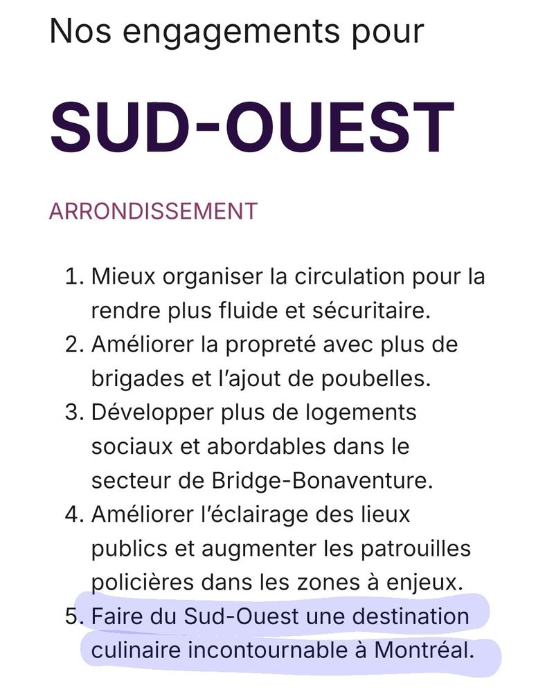 Est-ce vraiment sérieux @ensemblemontreal.bsky.social? Que le Sud-Ouest devienne une “destination culinaire incontournable” dans votre top 5 des priorités pour l’arrondissement? #polmtl#somtl