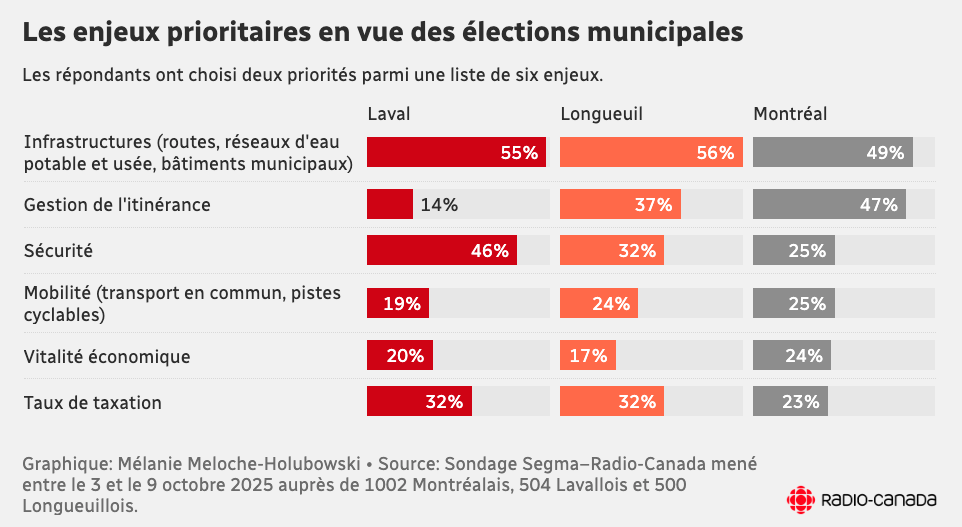Appelés à choisir leurs priorités parmi une liste de six enjeux en vue des élections municipales du 2 novembre prochain, la moitié des répondants ont mentionné les infrastructures (réseau d’aqueduc, gestion des eaux usées, routes et bâtiments municipaux).