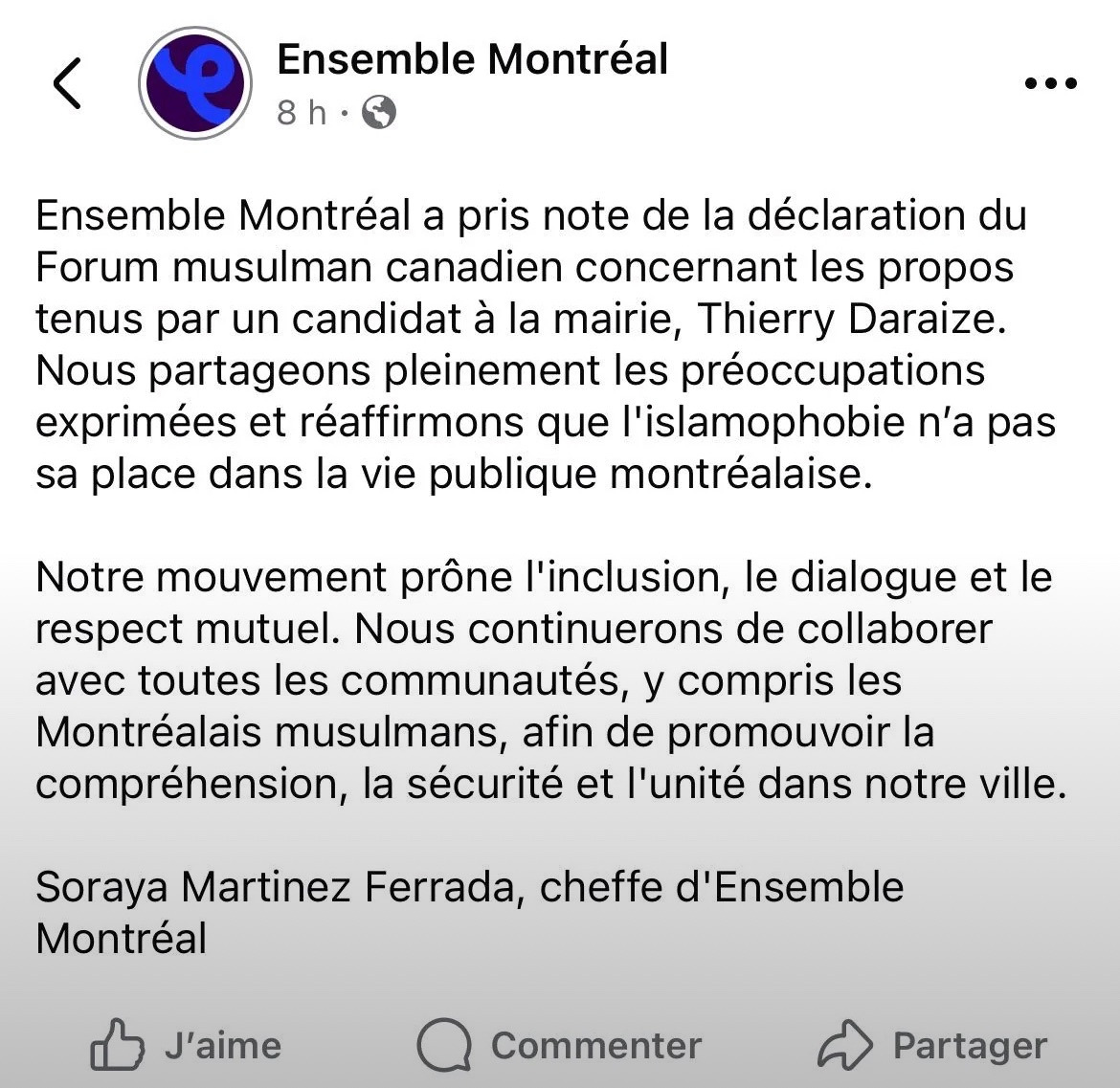 Pour le scrutin du 2 novembre prochain, il s’est entouré de 59 candidats. Le programme de son parti se décline sur 29 thèmes. On y propose notamment de réduire le nombre d’élus, de retirer ou de reconfigurer les pistes cyclables « nuisibles ou improvisées », d’éliminer les « dépenses inutiles » en révisant les projets « coûteux et mal planifiés », d’étudier « sérieusement » la possibilité d’accepter la crypto-monnaie comme mode de paiement pour les services municipaux, d’interdire les prières spontanées sur le domaine public et d’augmenter l’offre de stationnement avec la construction de stationnements souterrains ou en hauteur dans les secteurs à forte demande.