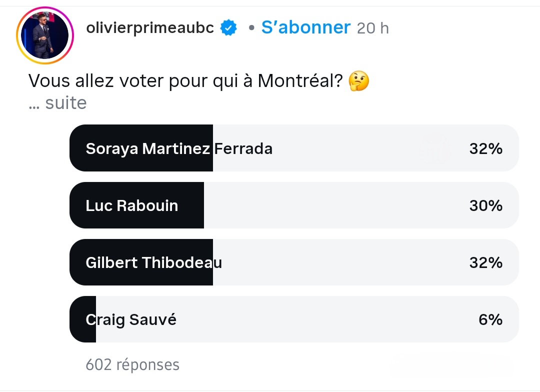Encore une fois, le québécois de Lévis peut répondre à ce sondage autant qu’un citoyen de Rosemont. Je crois que Gilbert Thibodeau a un plus gros fan base en dehors de l’île avec ses nombreuses participations à des podcasts que je qualifierais de conservateur pour rester poli.
