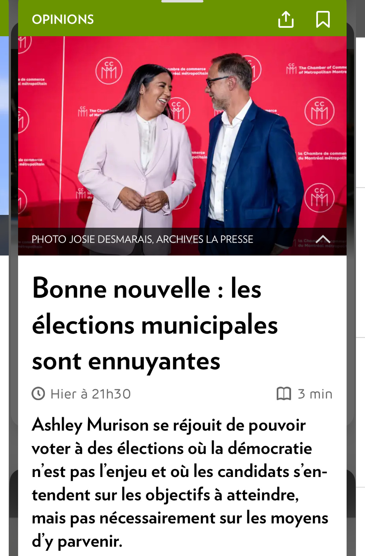Sur le cas des candidats tout croches d’Ensemble Montréal, je suis surpris qu’aucun média ni citoyen n’ait souligné que la candidate d’EM à la mairie de Lachine avait été évincée par Coderre en 2021 parce qu’elle n’était pas vaccinée.