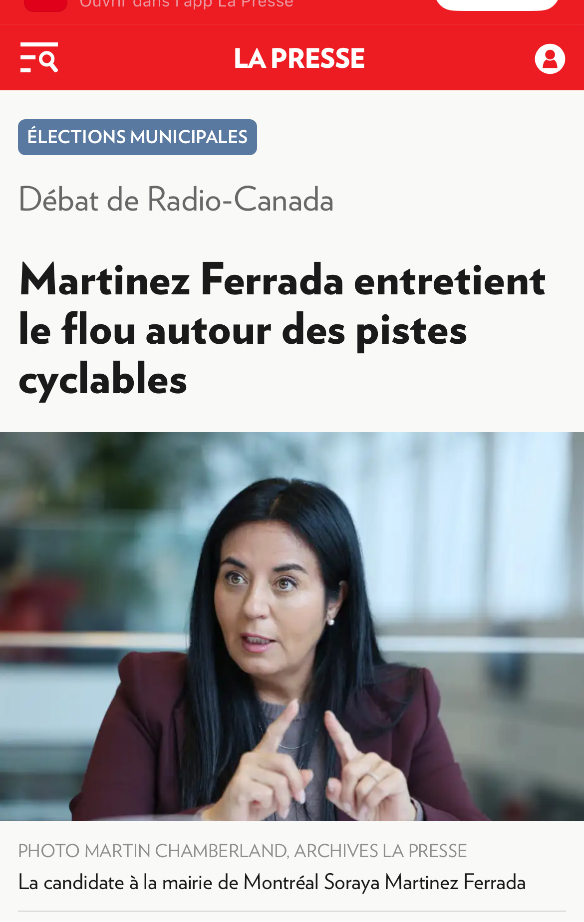 “En réaction, Mme Martinez Ferrada a répliqué qu’« on ne peut pas détruire toutes » les pistes cyclables. « On ne peut pas détruire tout, juste un petit peu ? », l’a questionné le chef de Projet Montréal Luc Rabouin. « Oui, c’est ça, juste un petit peu », de répondre Mme Martinez Ferrada, en souriant.”