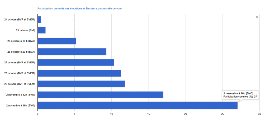Par exemple: Valérie Plante a été élue mairesse en 2021 par les votes de 19.75% de la population et le soutien non-opiniatré de 62% de la population. Donc 19.75% de la population on prit le temps de voter pour elle et un autre 62% étaient contents peu importe le résultat, incluant si c’était elle.