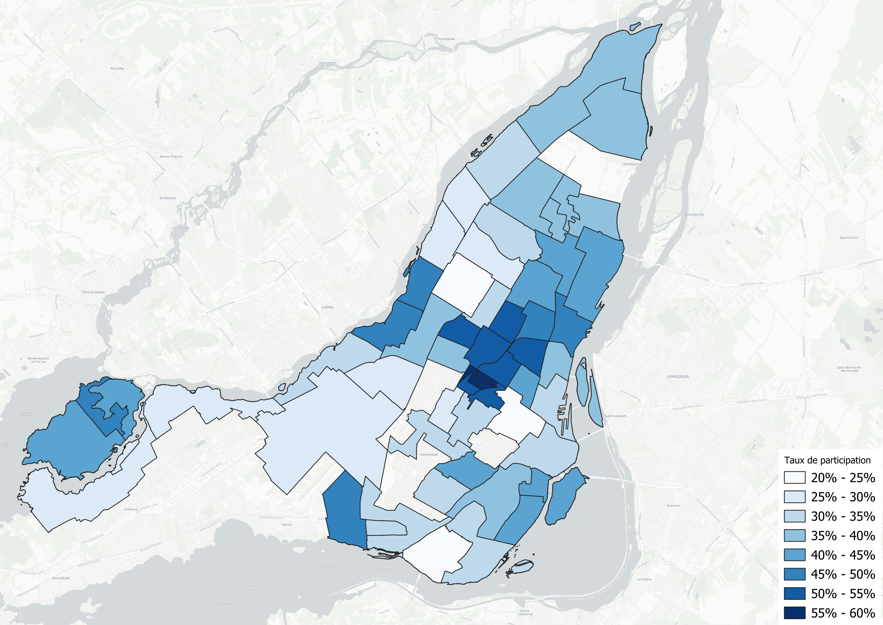 Île-Bizard aussi a des taux plus élevés. Peut être qu’avoir des conseillers d’arrondissement dans des districts aussi petits aident vraiment la population à avoir un sentiment d’appartenance.